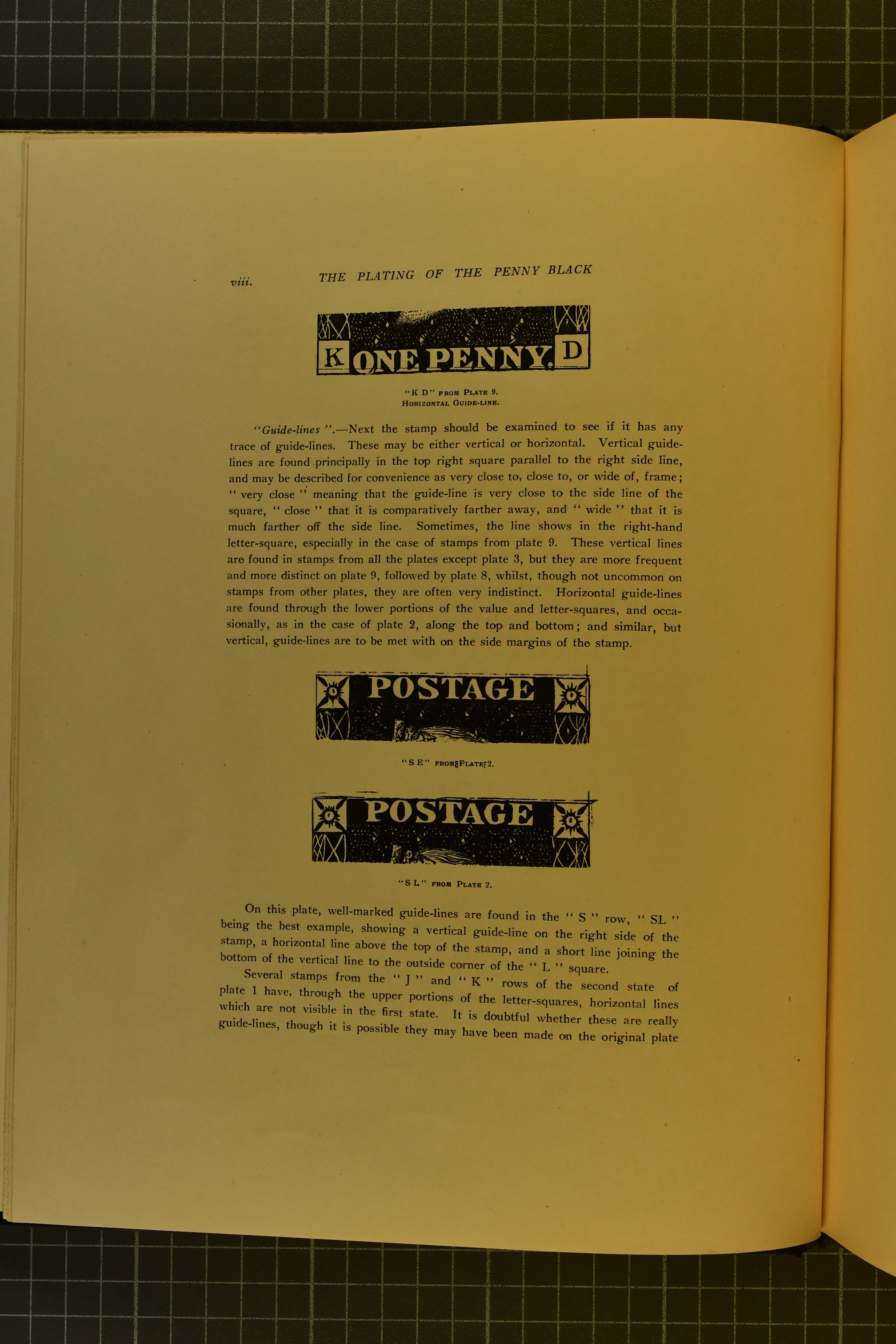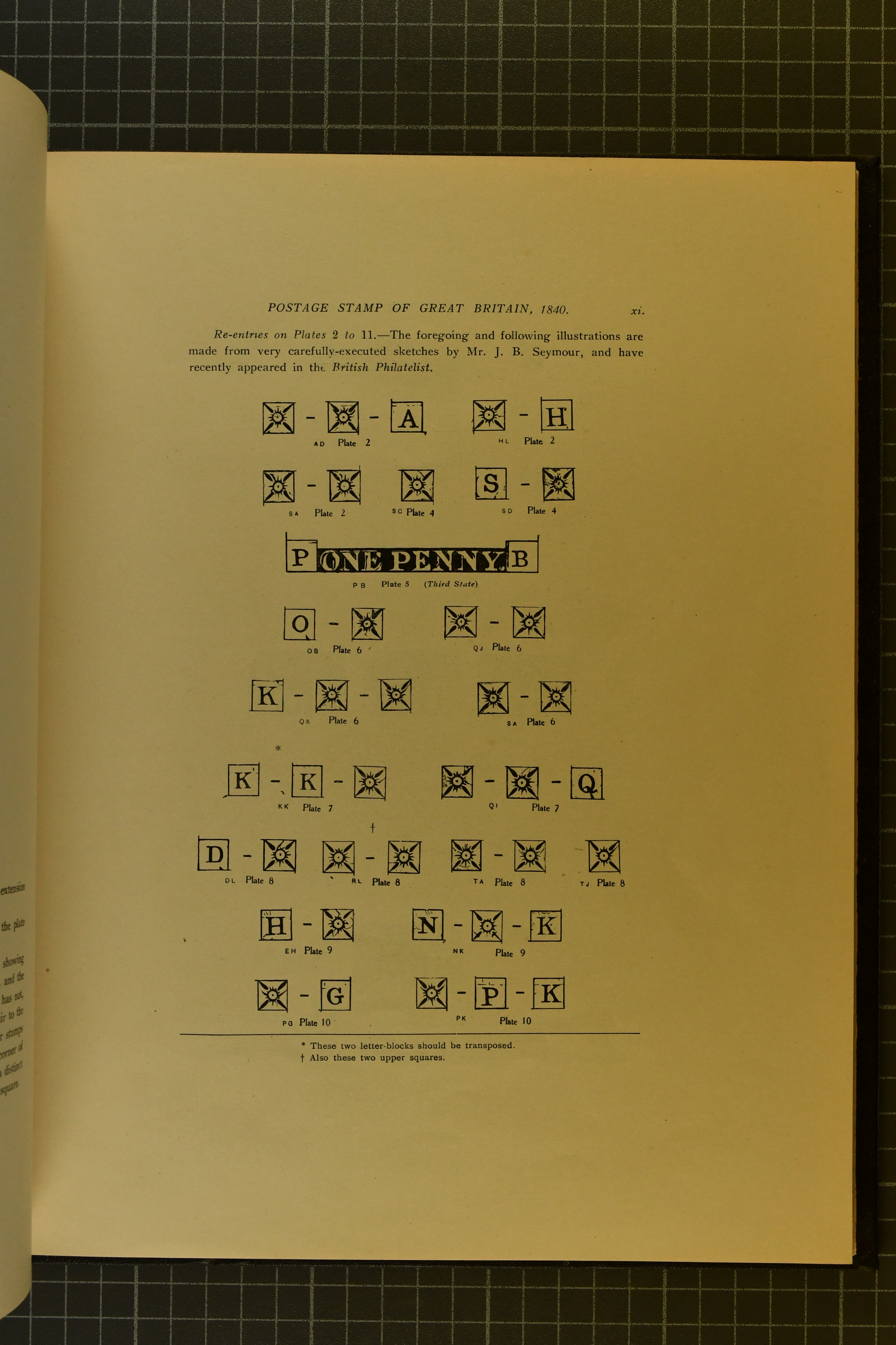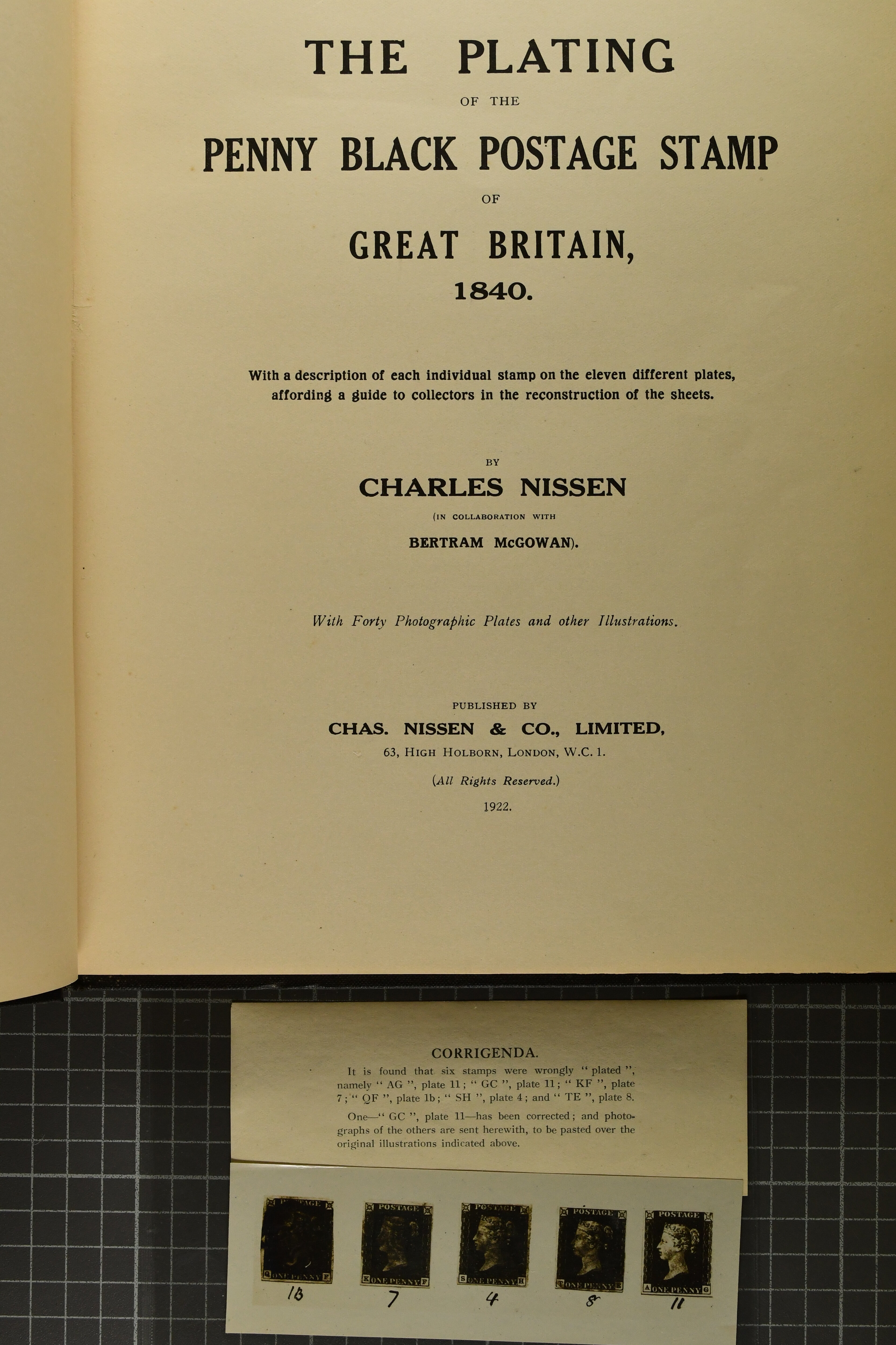 1922: The Royal Philatelic Society London 'The Plating of the Penny Black Postage Stamp of Great Britain' (Nissen & McGowan, CRAWFORD medal 1922), hardbound text in black cloth with title page bound in. Also