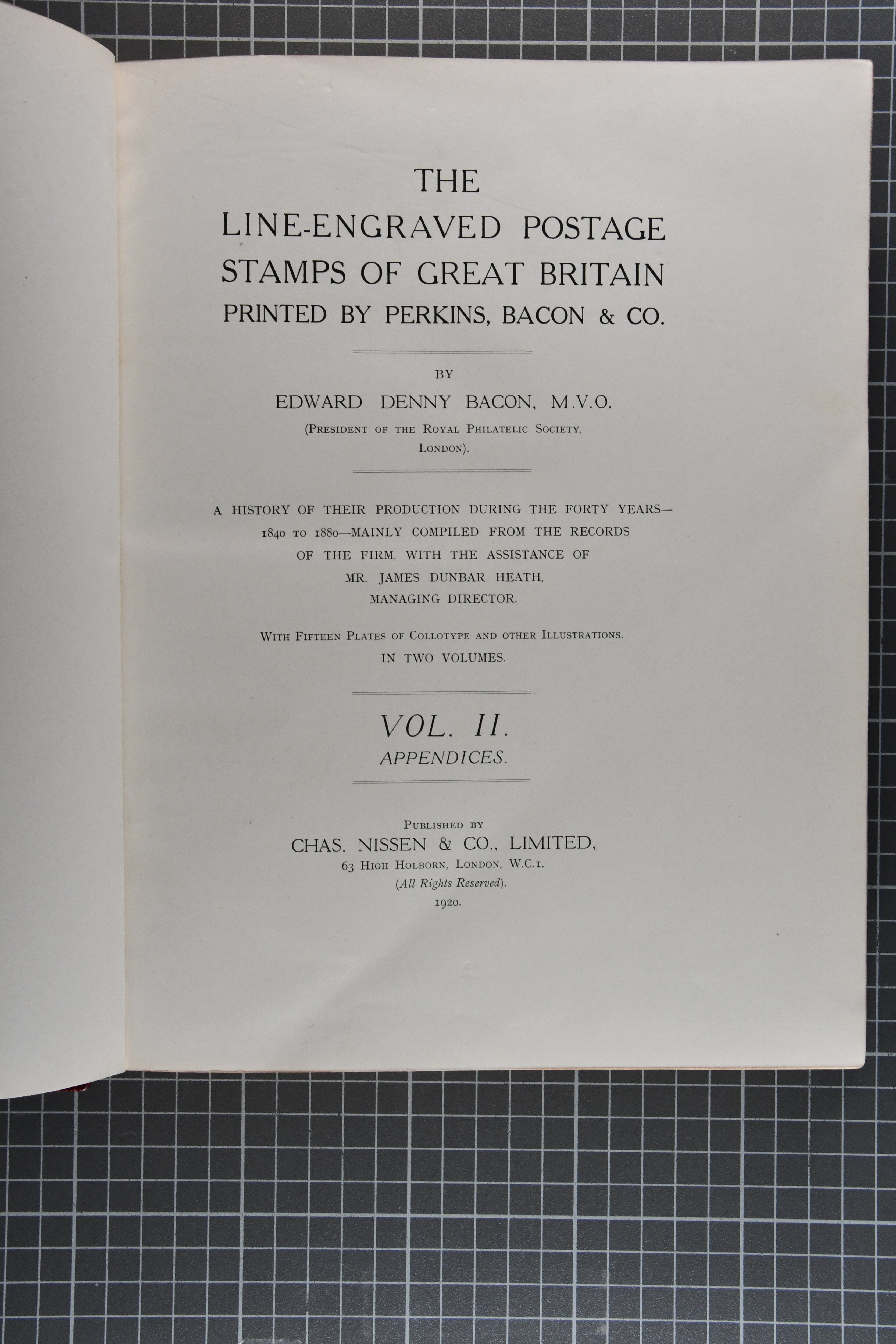 1920: 'The Line Engraved Postage Stamps of Great Britain' (Bacon, CRAWFORD medal 1921). Hardbound in red half-leather by Wood of London. The end papers are bound in. In very good condition in contemporary binding.