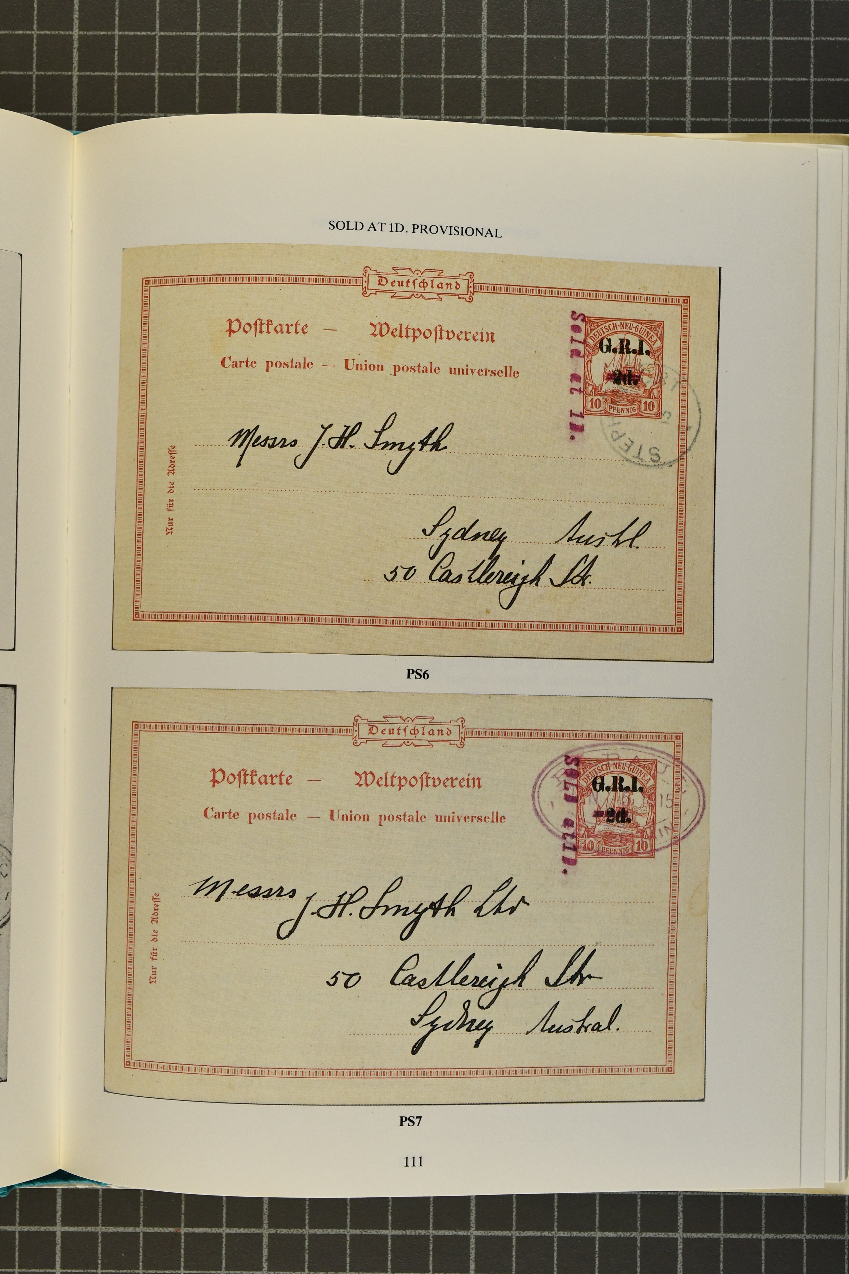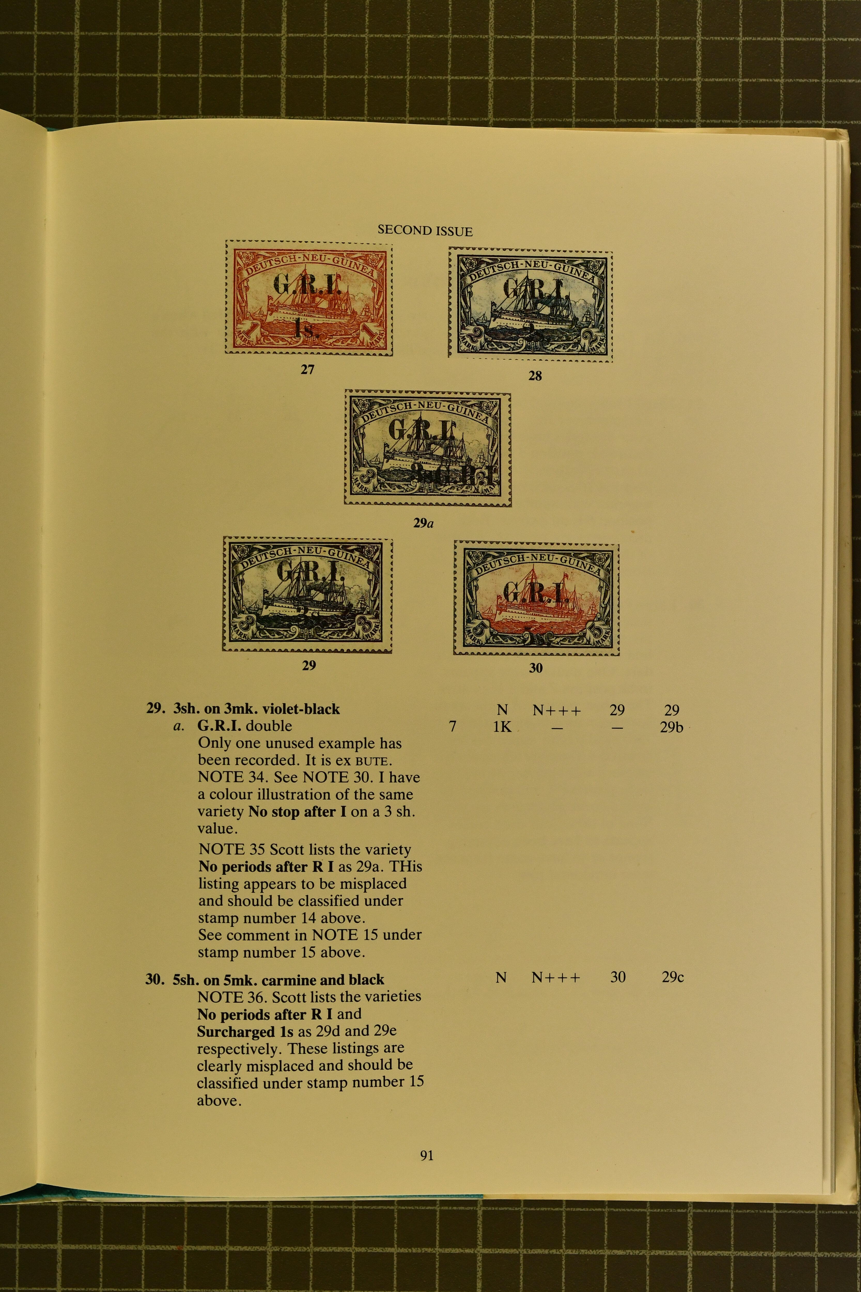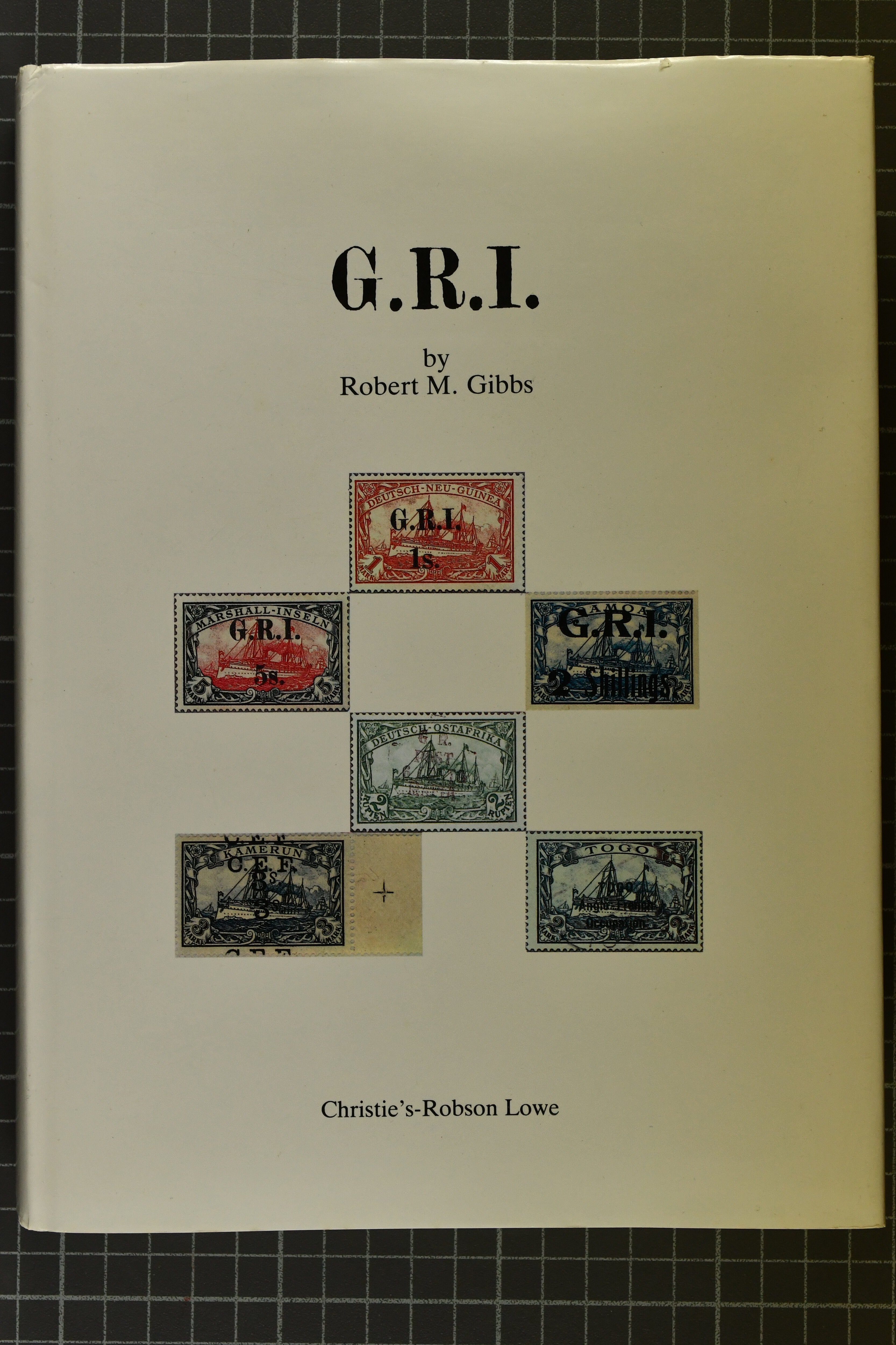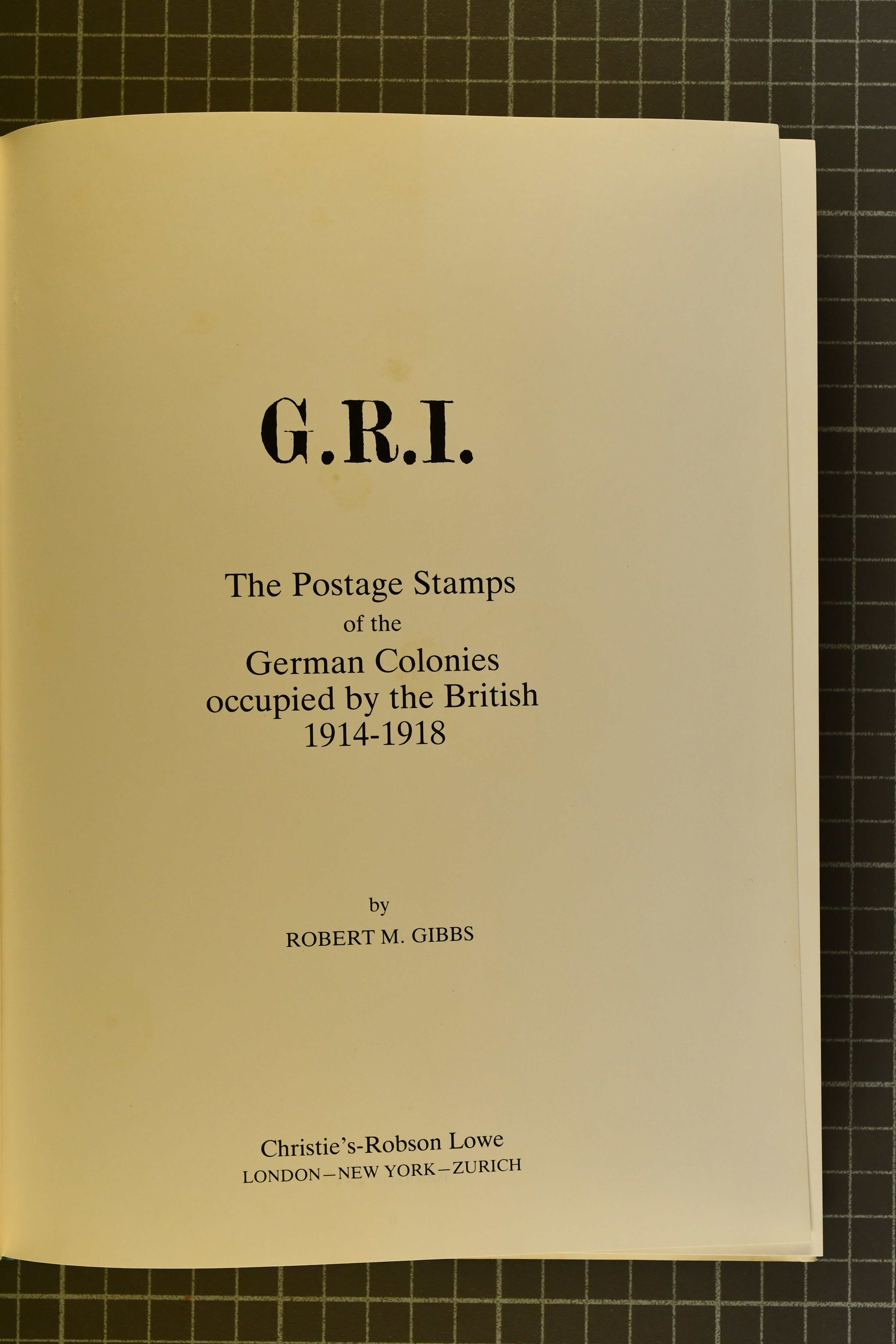 1987: 'G.R.I The Postage Stamps of the German Colonies occupied by the British 1914- 1918' by Robert M. Gibbs, near new book with dust jacket edited by Robson Lowe. In good condition. (Image 1)