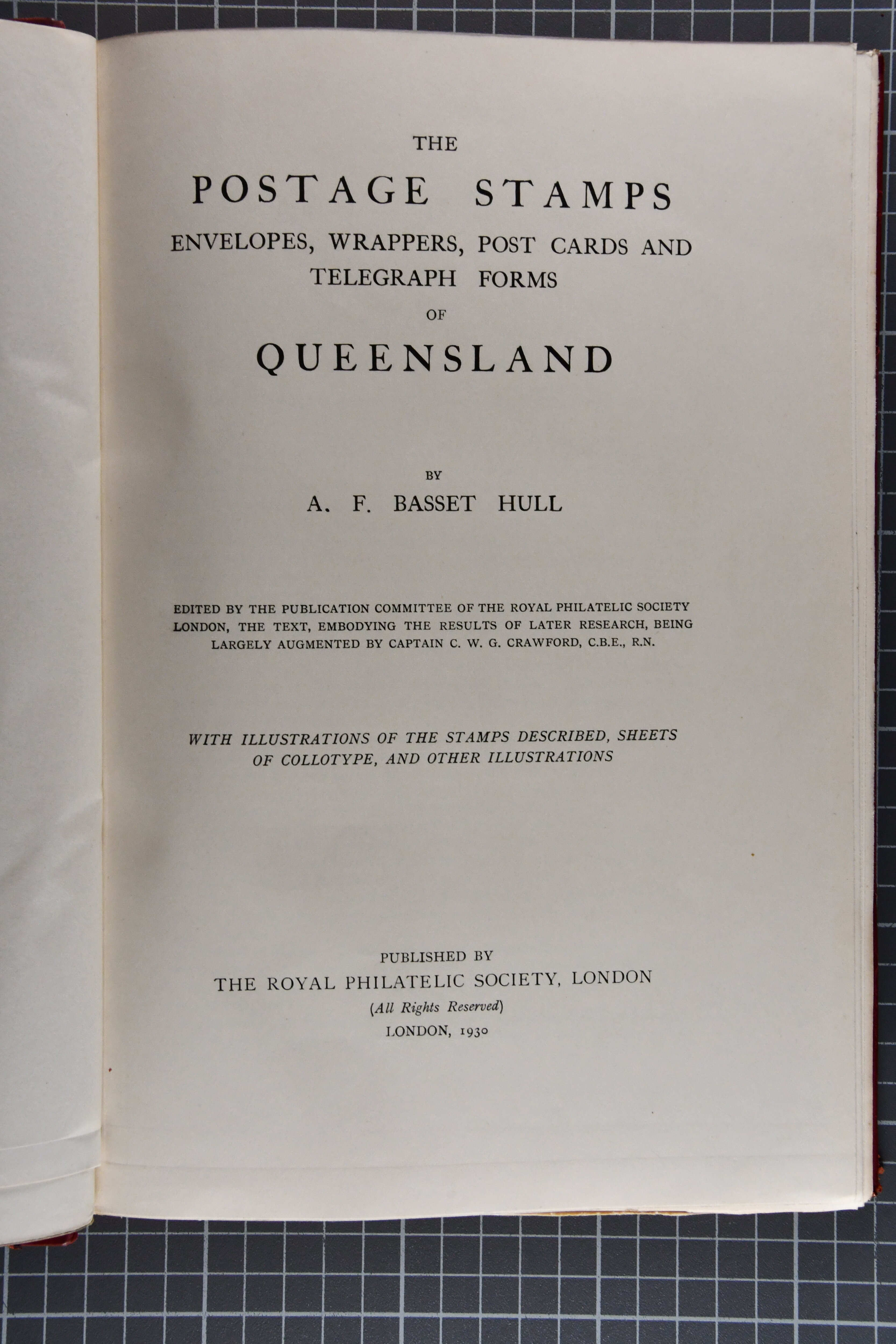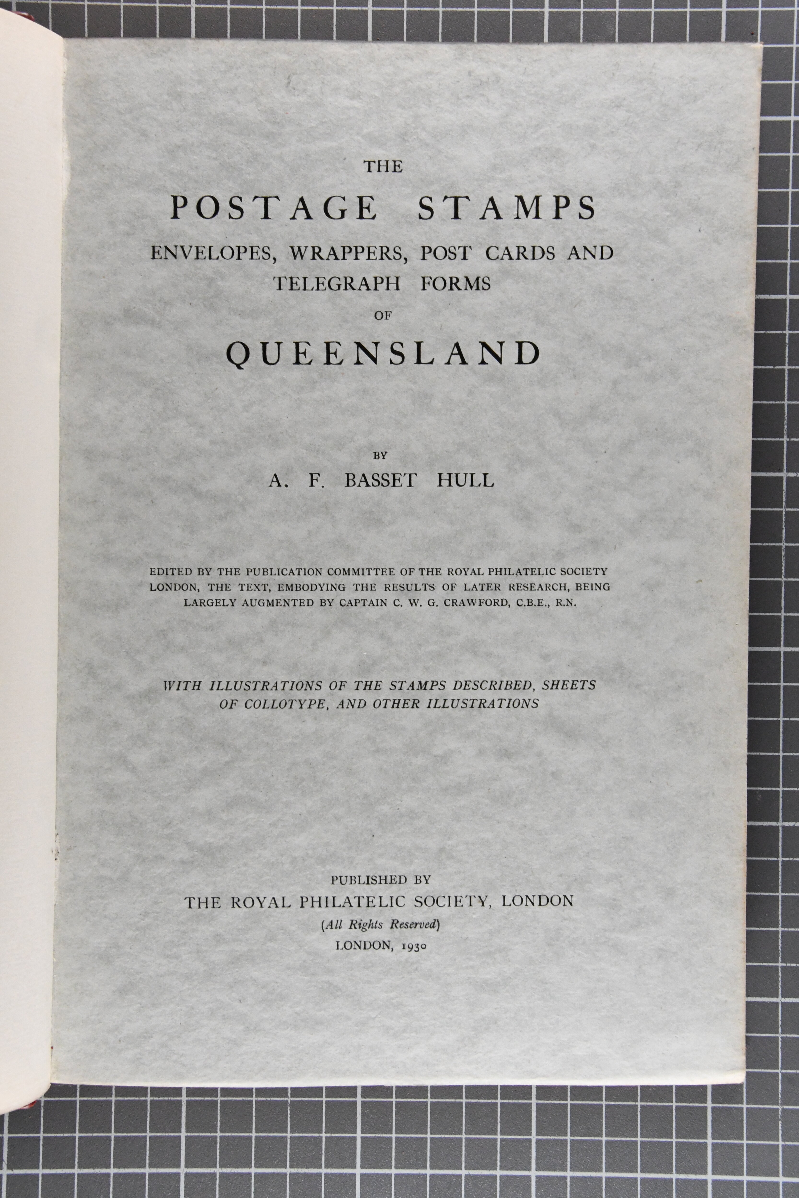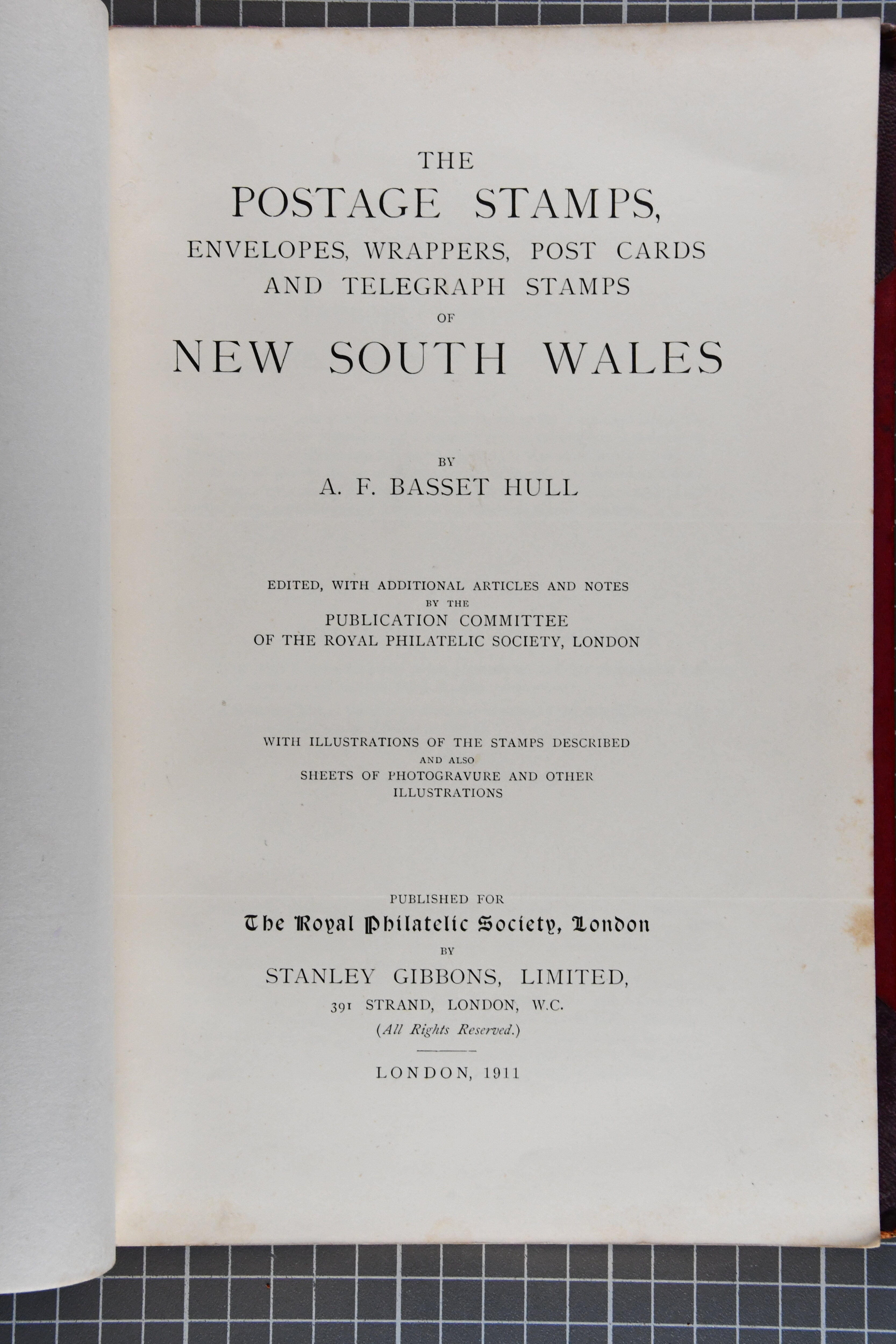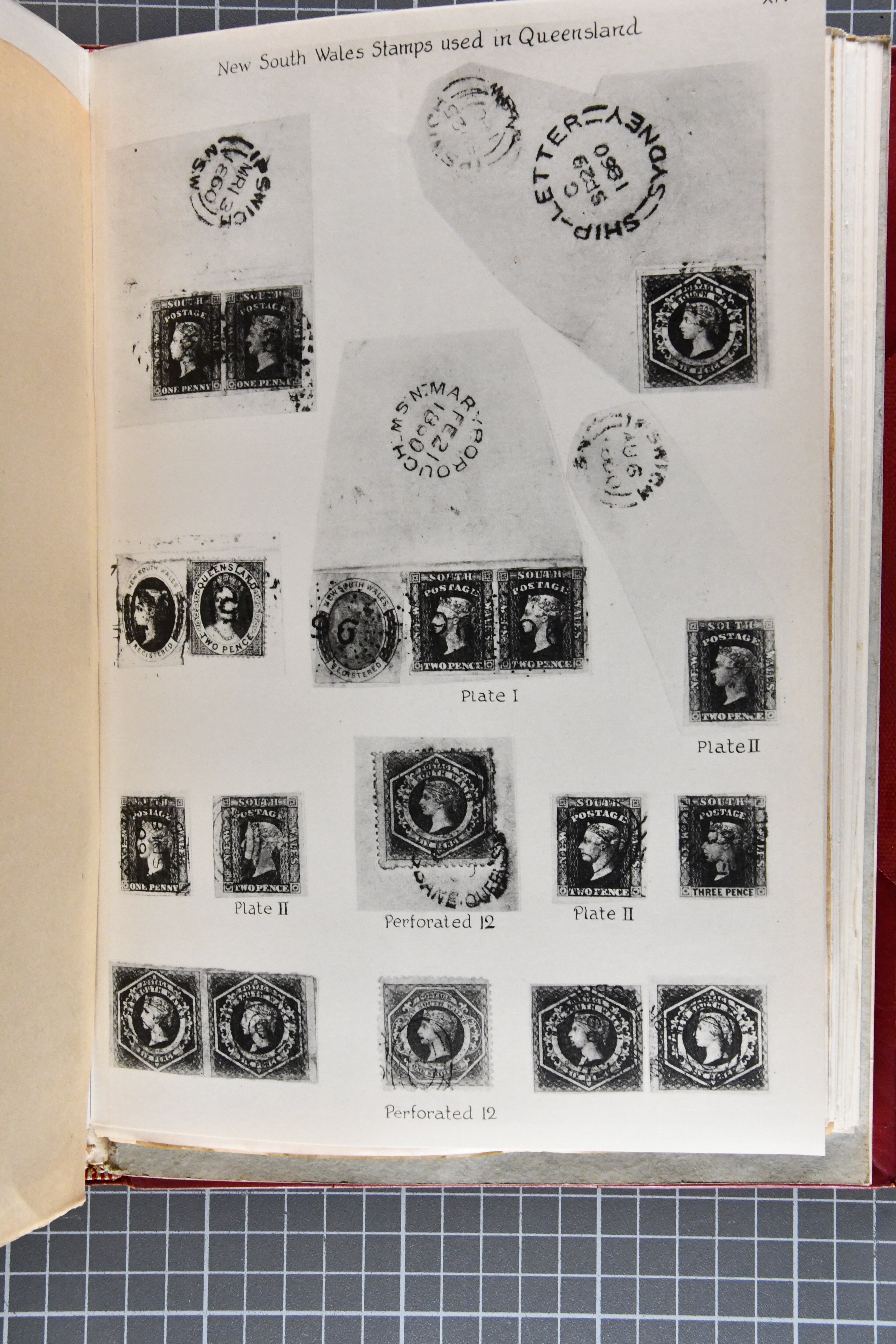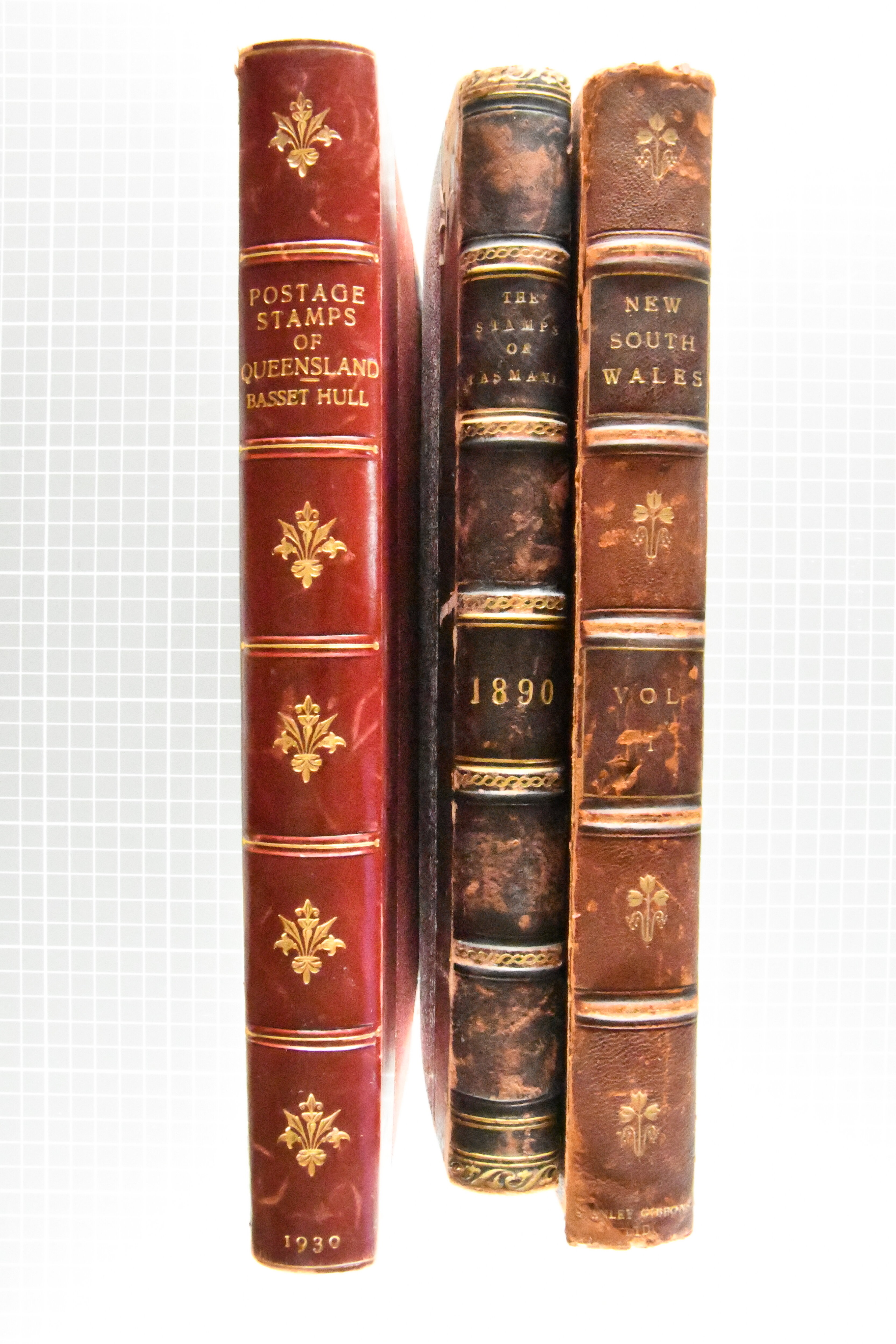 stamps of New South Wales' (1911), with plates and a slightly worn binding; and 'Postage Stamps Envelopes, Wrappers, Post Cards and Telegraph stamps of Queensland' (1930), splendidly quarter-leather bound in excellent condition, with the plates bound