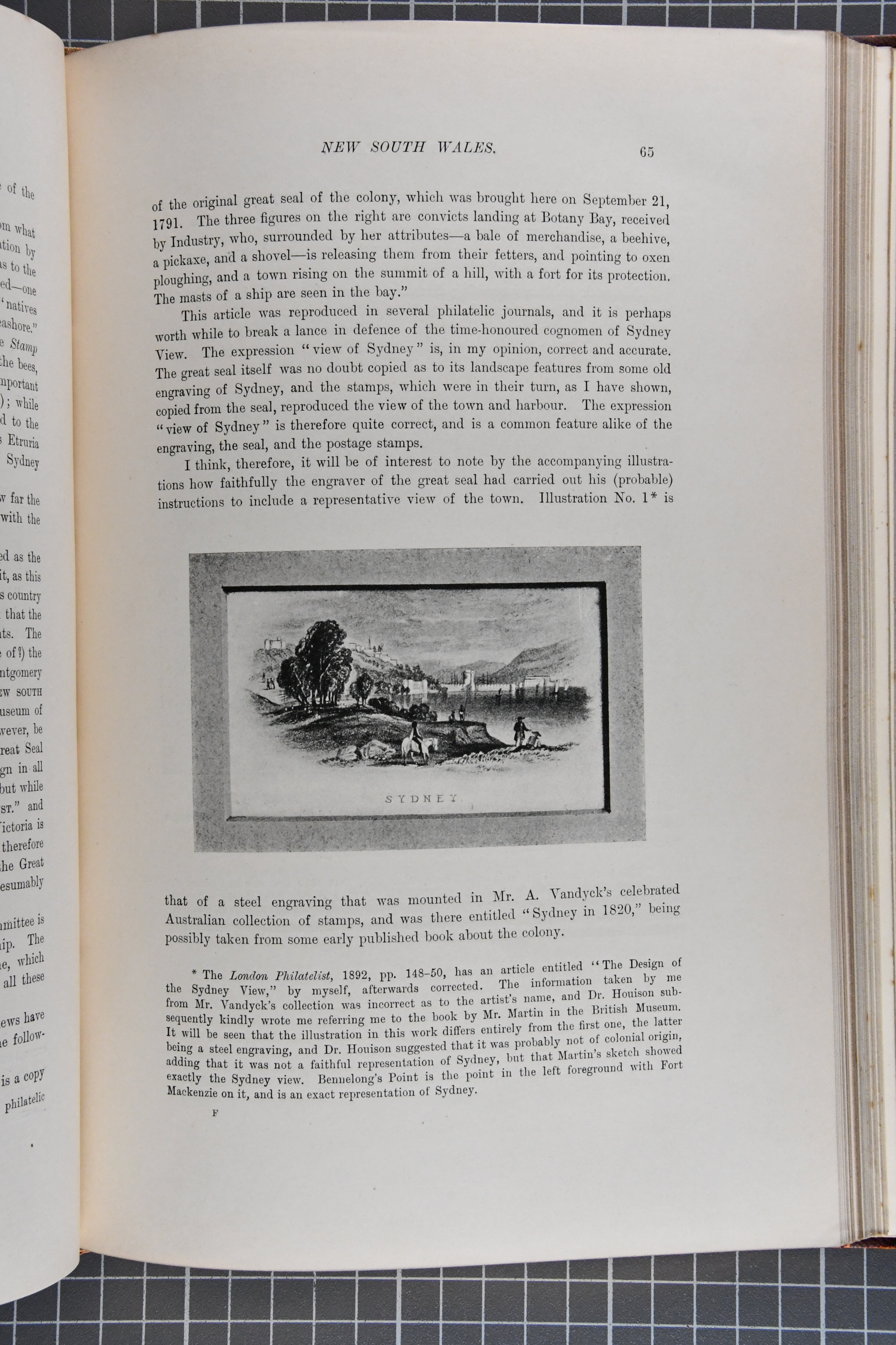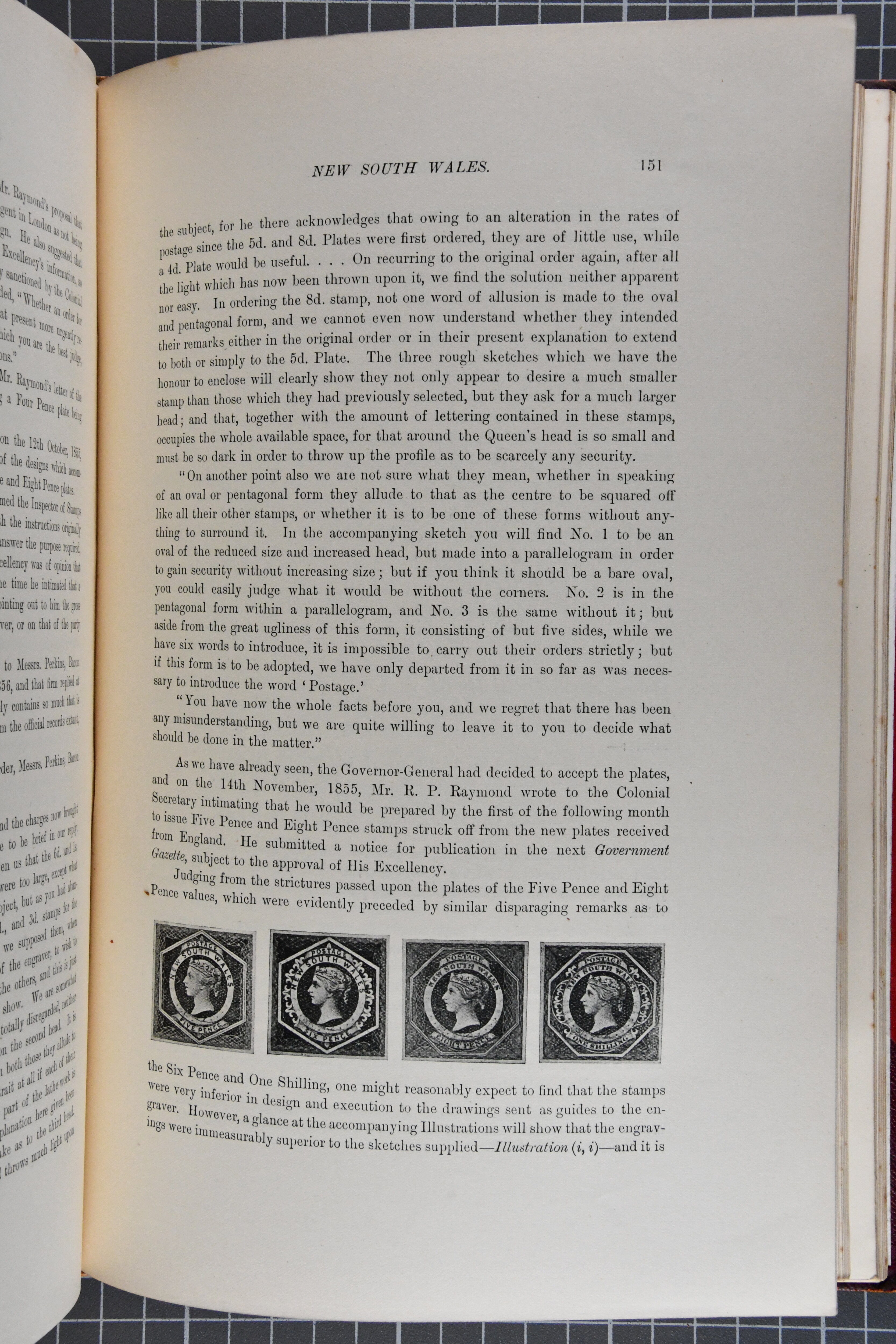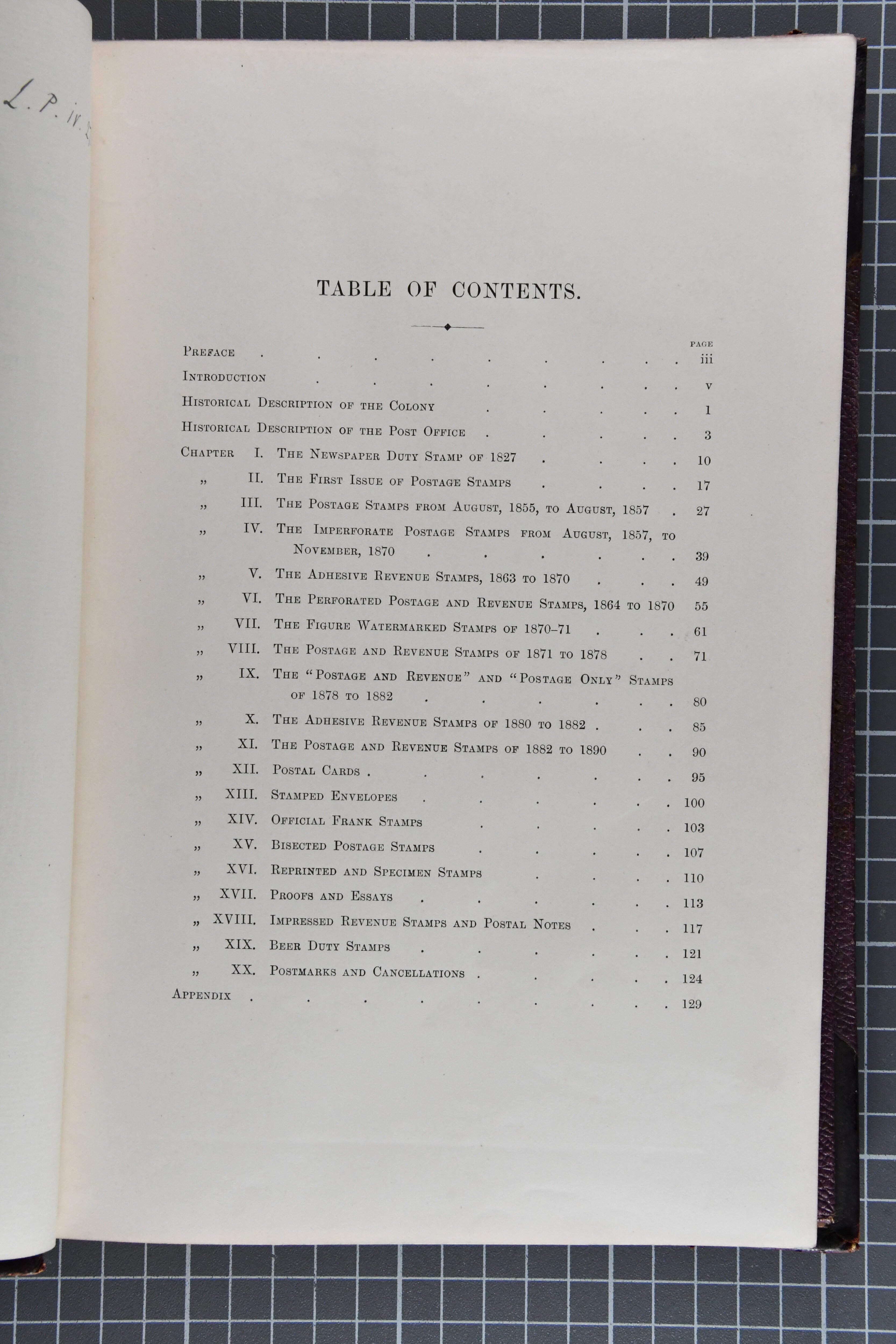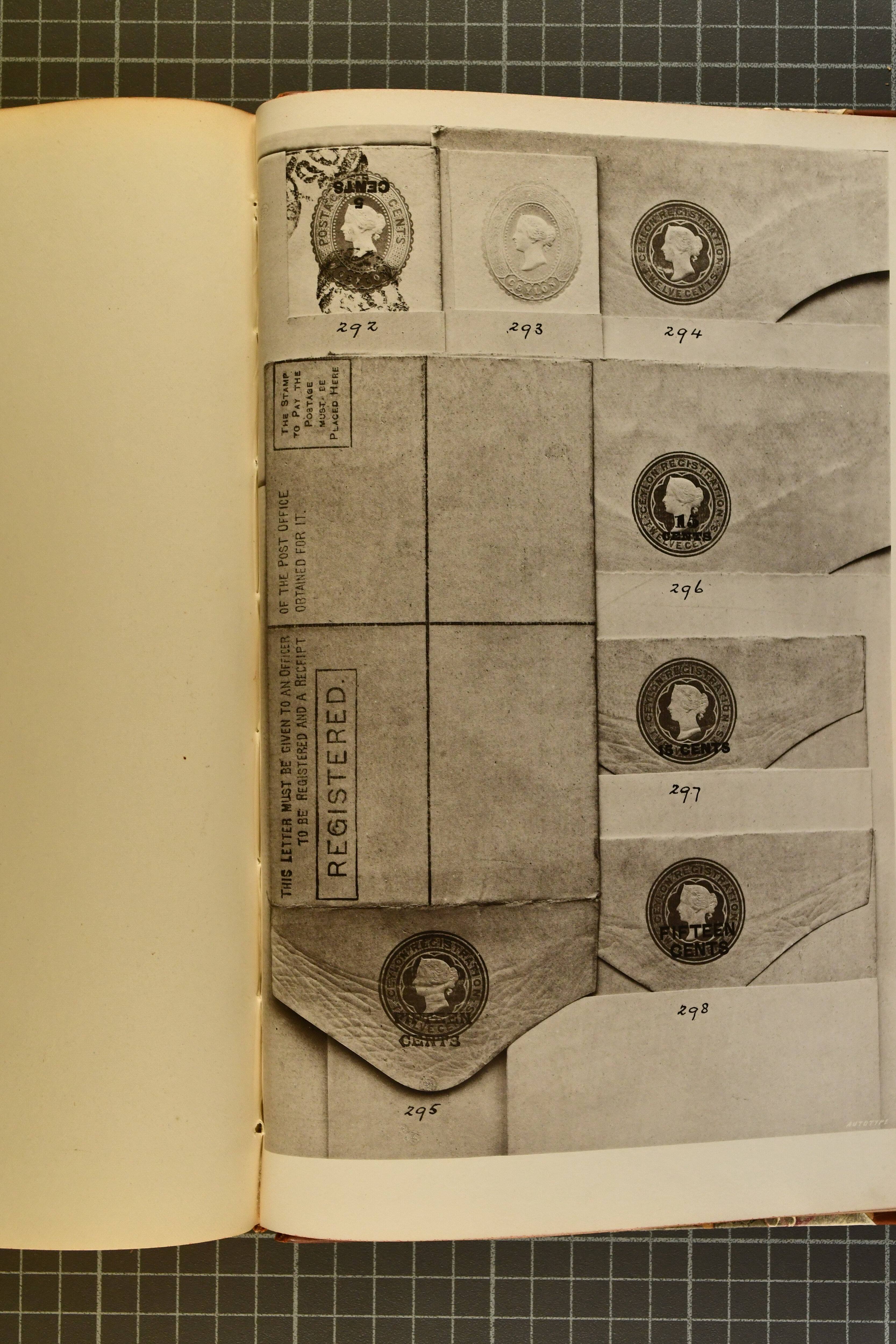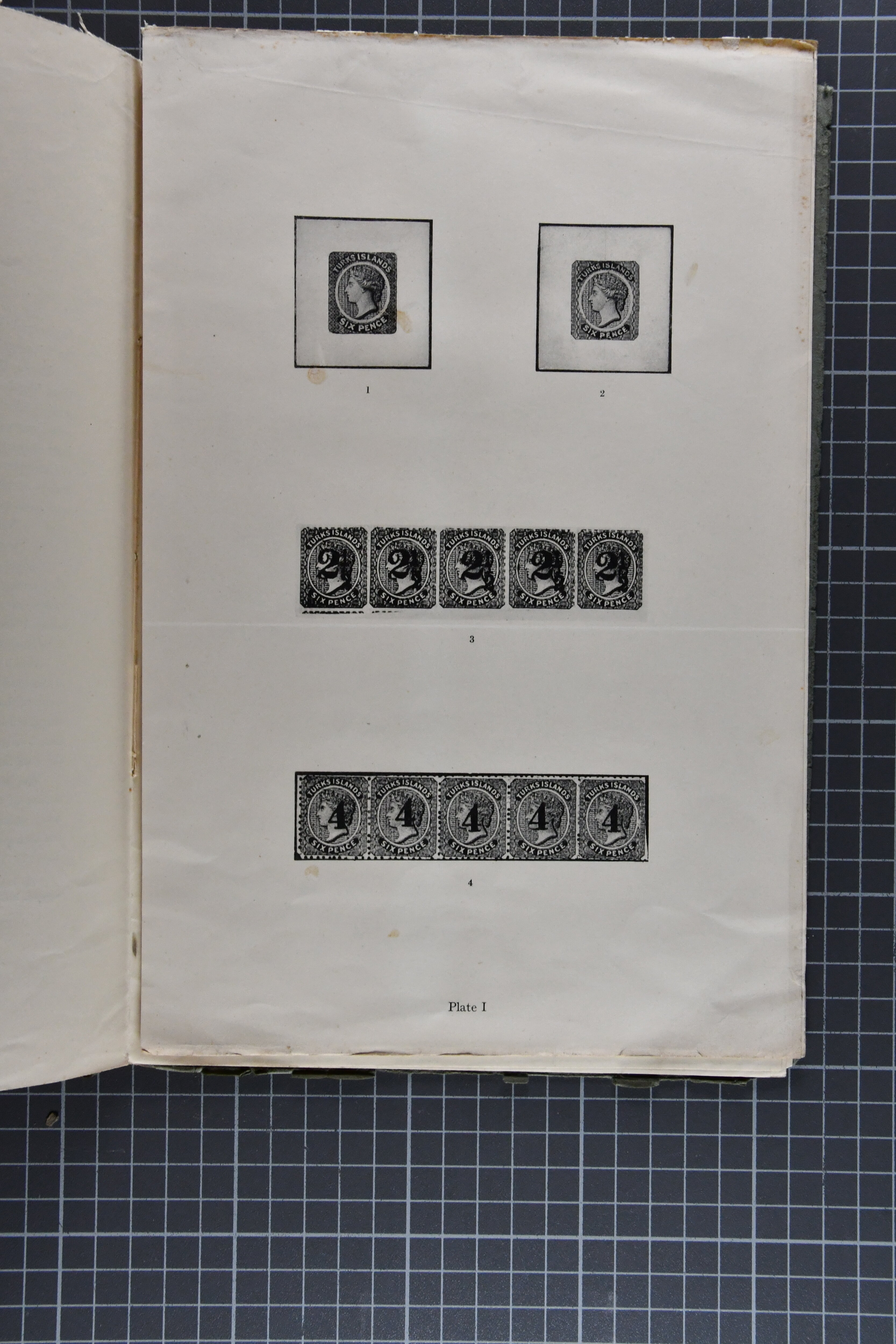 stamps of New South Wales' (1911), with plates and a slightly worn binding; and 'Postage Stamps Envelopes, Wrappers, Post Cards and Telegraph stamps of Queensland' (1930), splendidly quarter-leather bound in excellent condition, with the plates bound