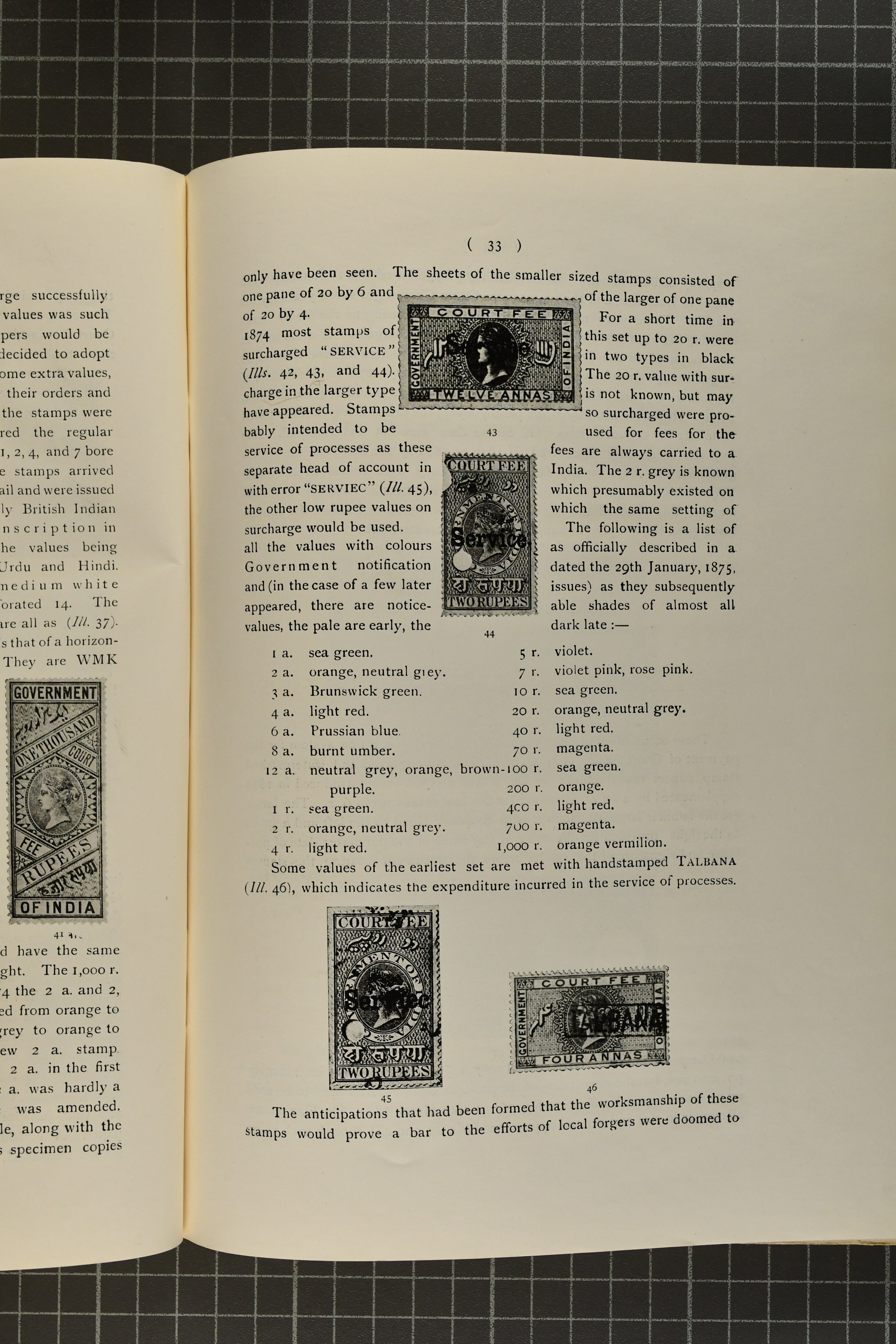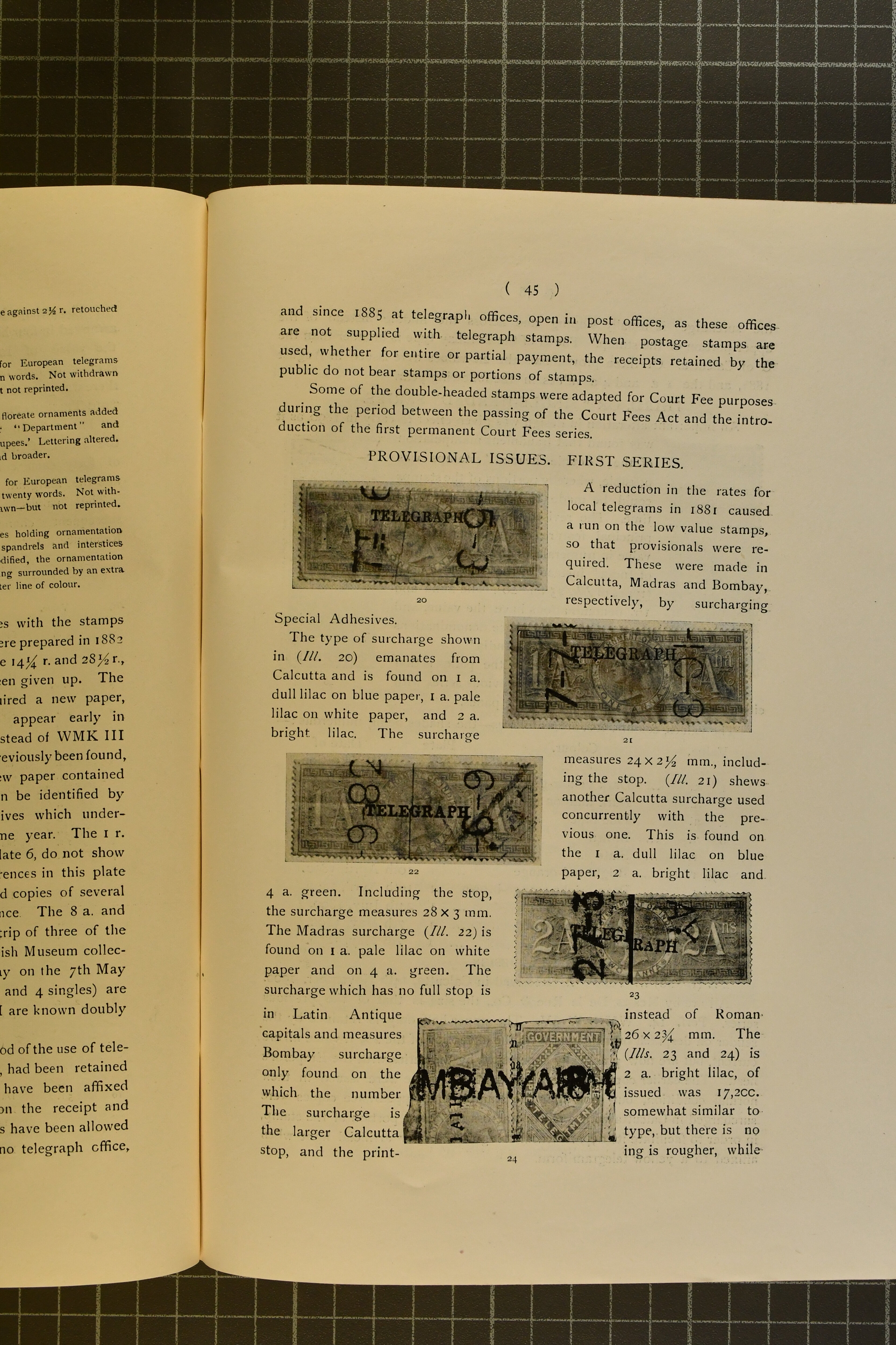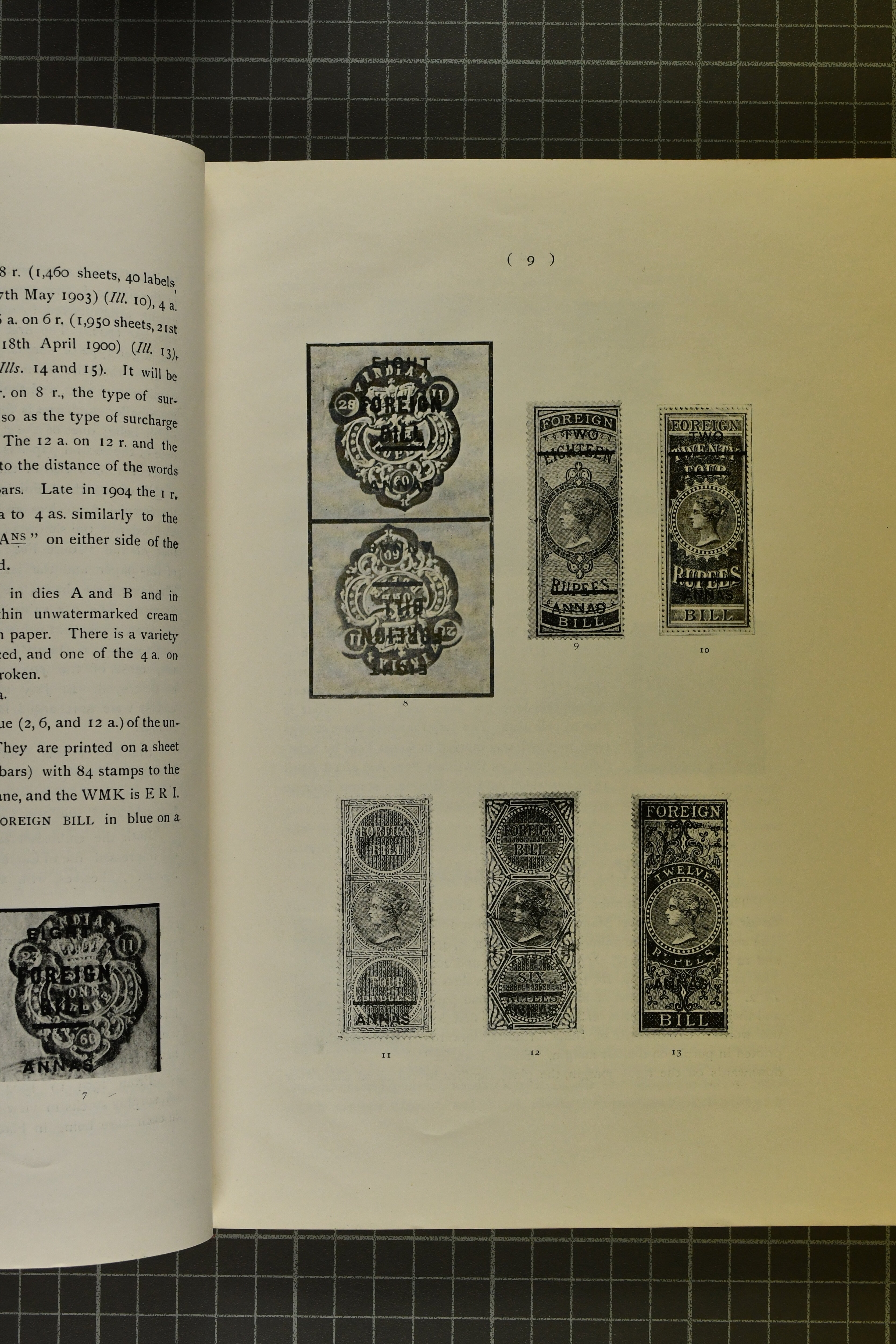 Adheisve Fiscal And Telegraph Stamps of British India', by C. S. F. Crofton and Wilmot Corfield 1905; 'The Postage Stamps of Nepal' By E. A. Smythies C.I.E., F.R.P.S.L and L. E. Dawson F.R.P.S.L. in two examples. Plus 'The Encyclopaedia of Ceylon
