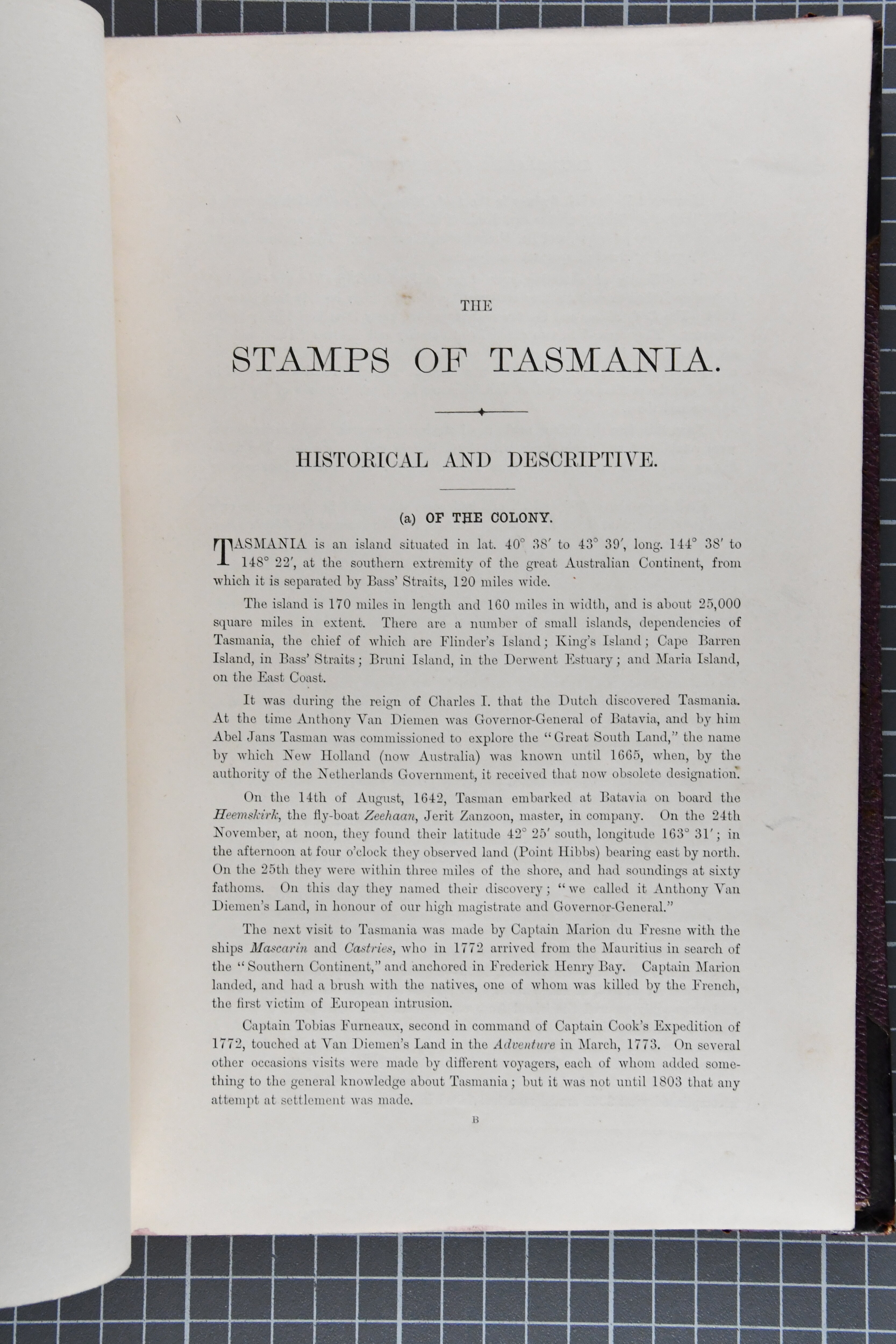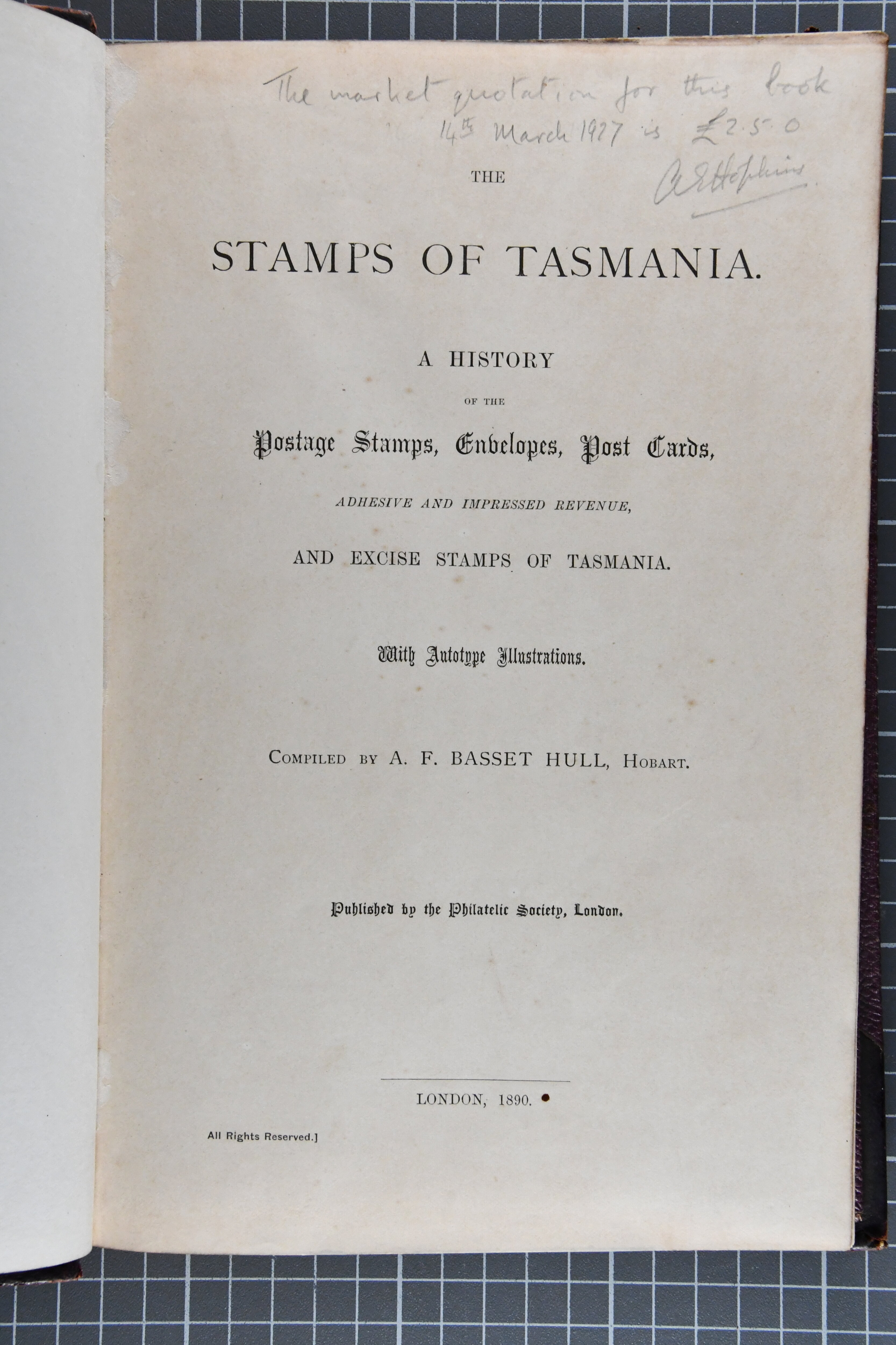 1890/1930: Australian States – Superb lot of three volumes by Basset Hull, comprising 'The Stamps of Tasmania', including five plates and a map; 'The Postage Stamps , Envelopes, Wrappers, Post Cards and Telegraph