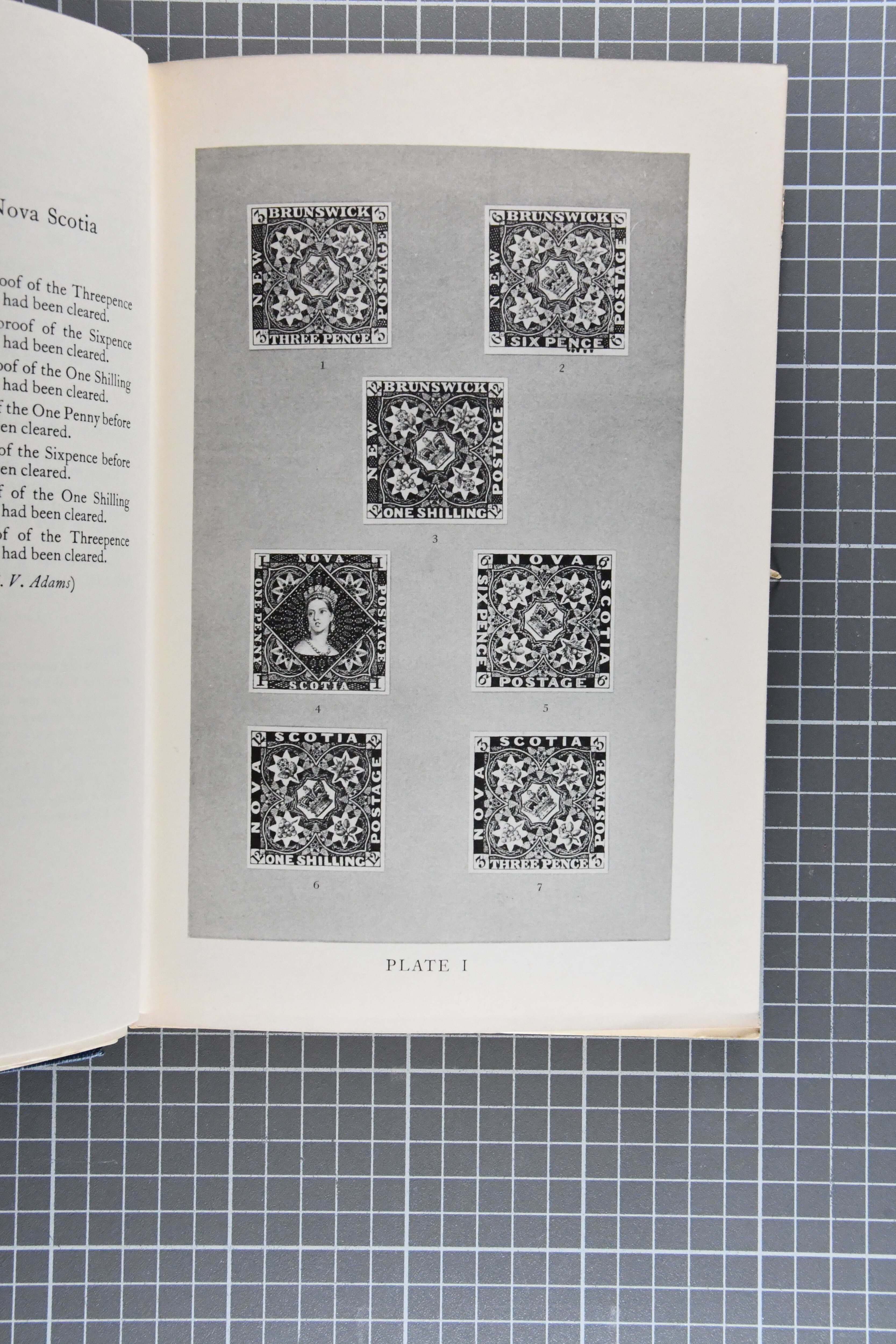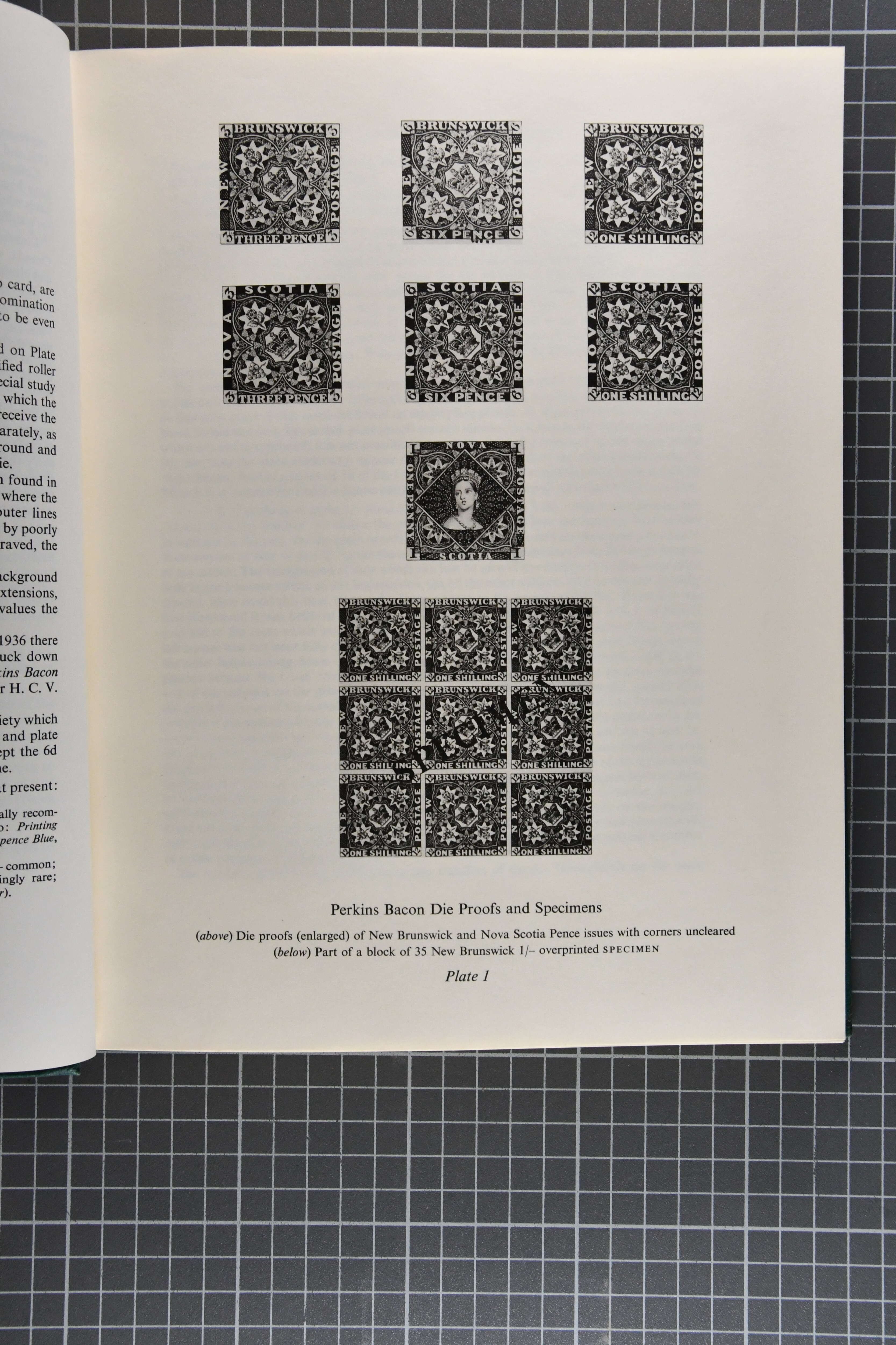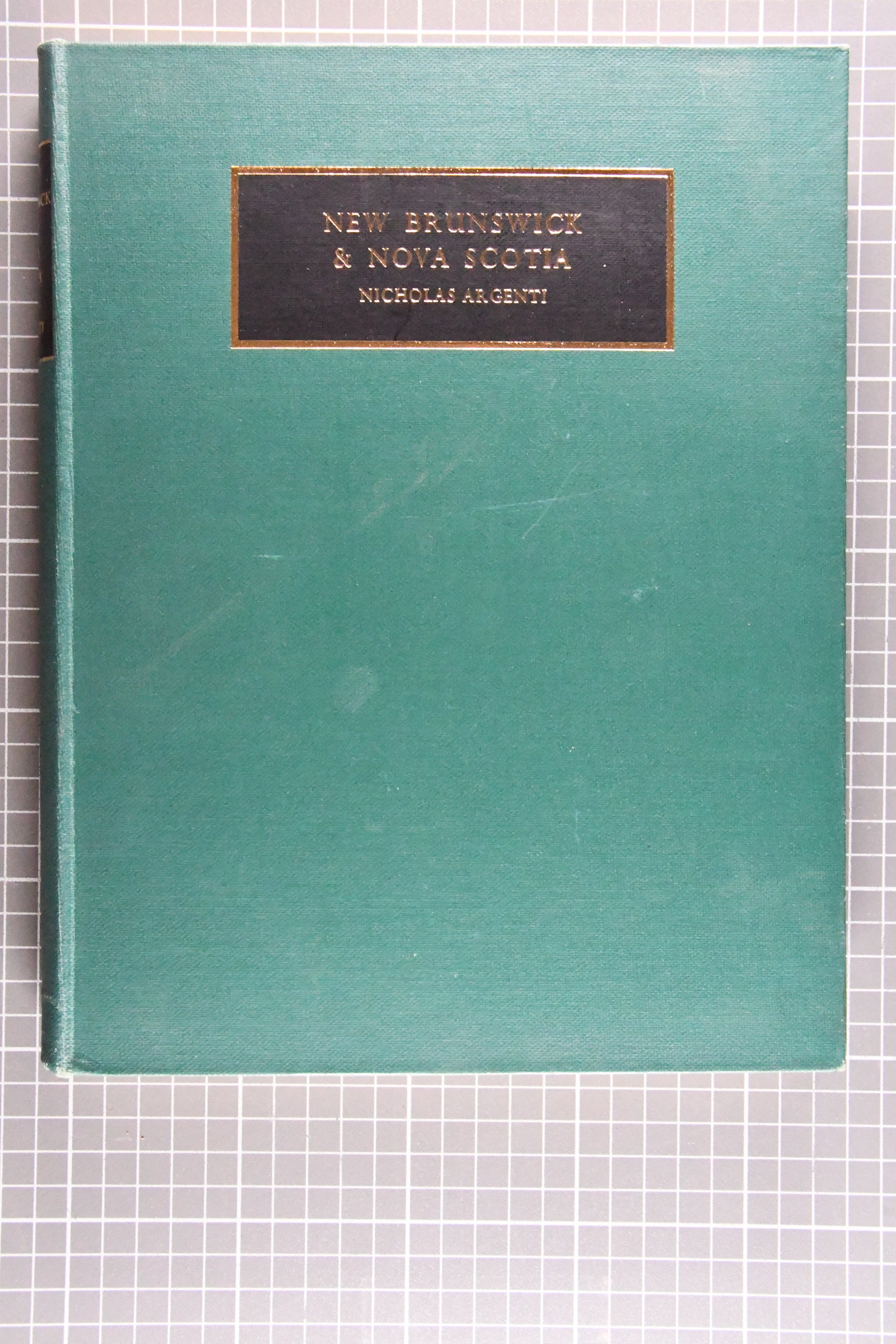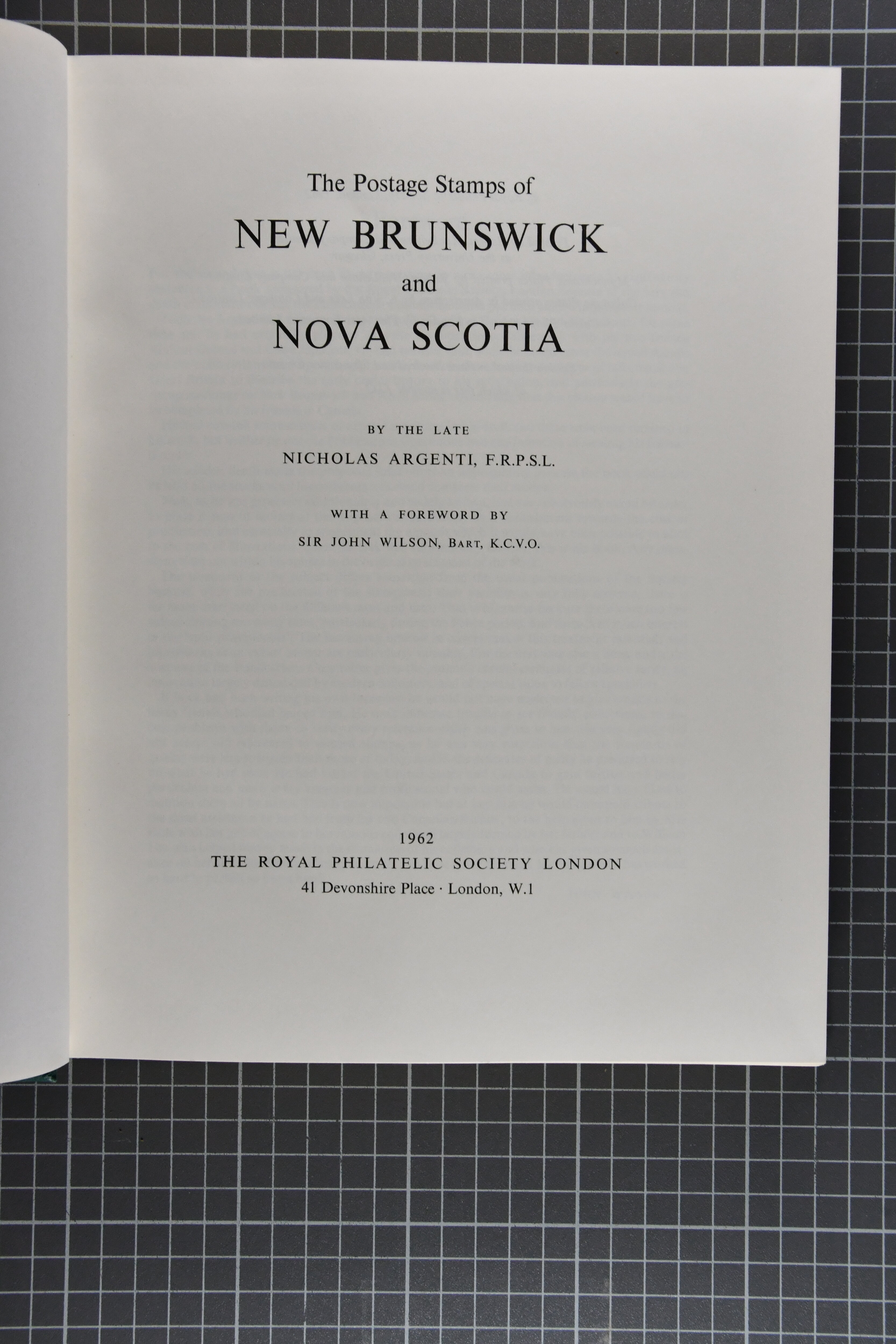 of Canada' (Boggs). Hardbound in burgundy cloth with dust jackets (CRAWFORD medal 1947), unusual to find with dust jackets, both volumes in very good condition. 'The Postage Stamps of New Brunswick and Nova Scotia' by the late Nicholas Argenti,