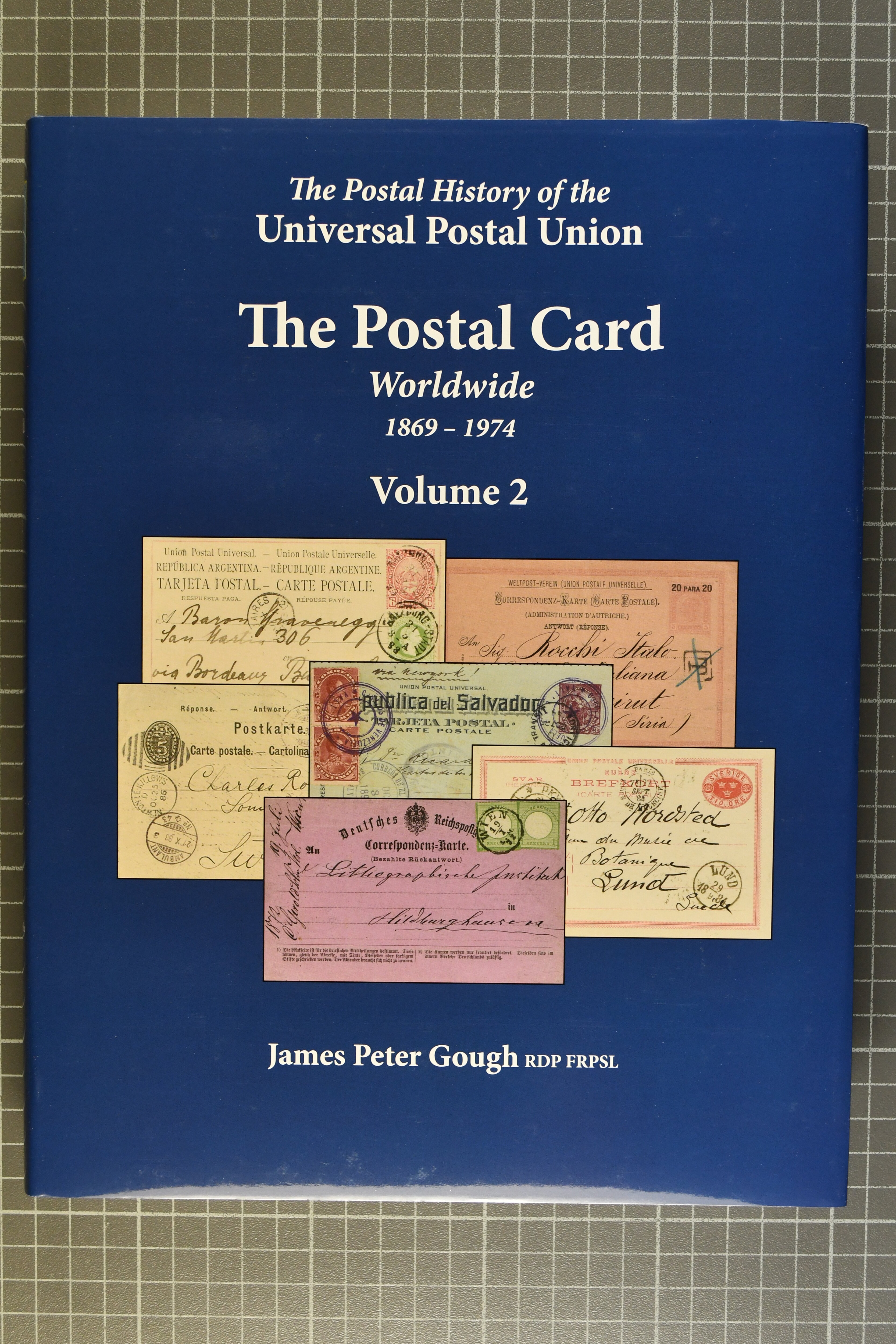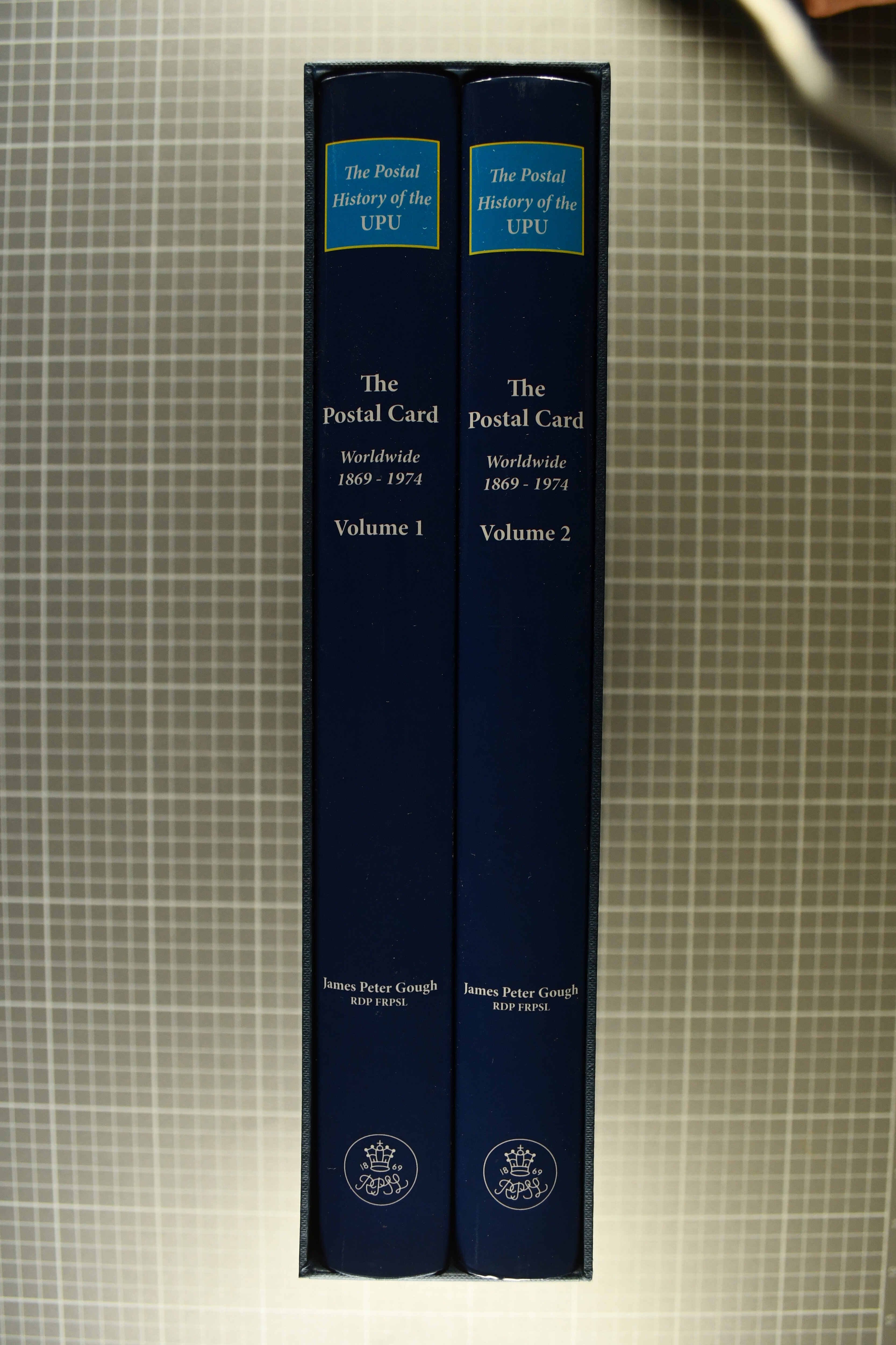 2020/21: The Postal History of The UPU, The Postal Card Worldwide 1869 - 1974 (Gough, CRAWFORD medal 2020). Hardbound 2 volumes with dust jackets in slip case. 'Analysis of WORDWIDE POSTAL WRAPPERS' in two Volumes