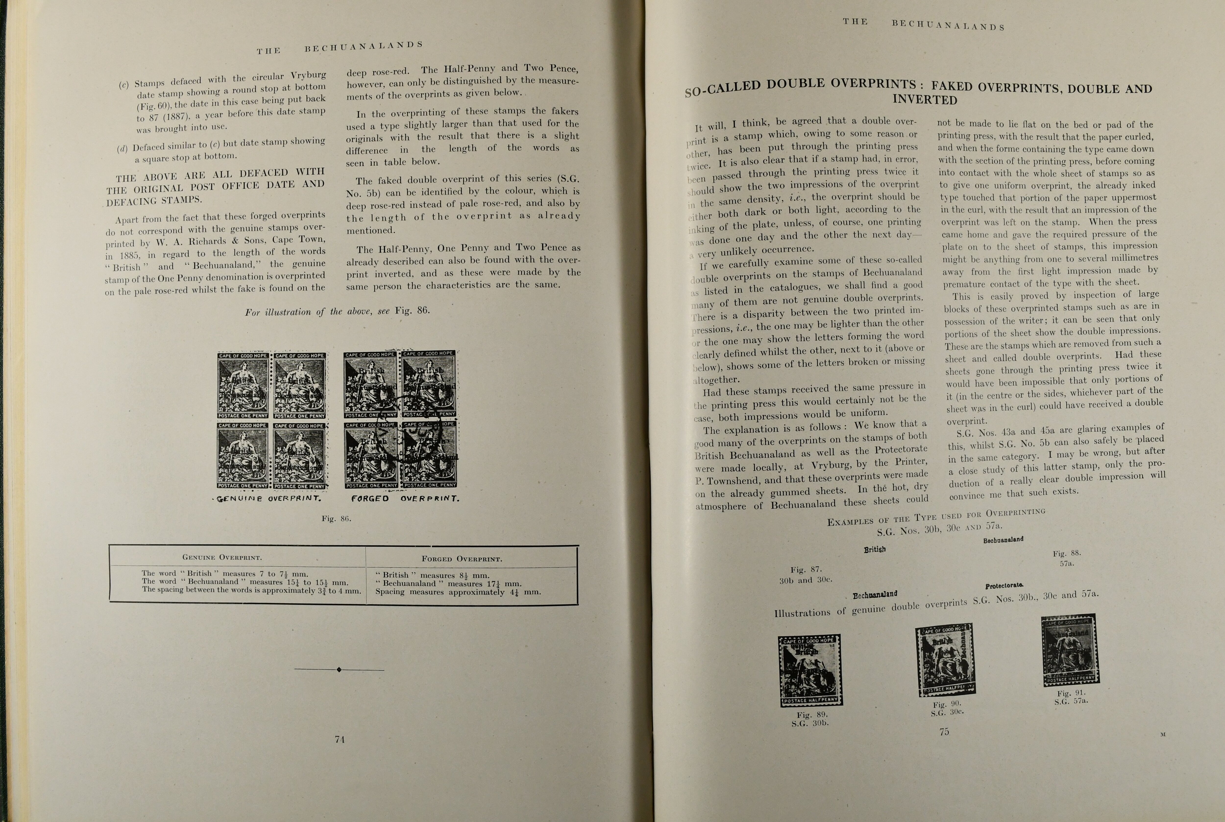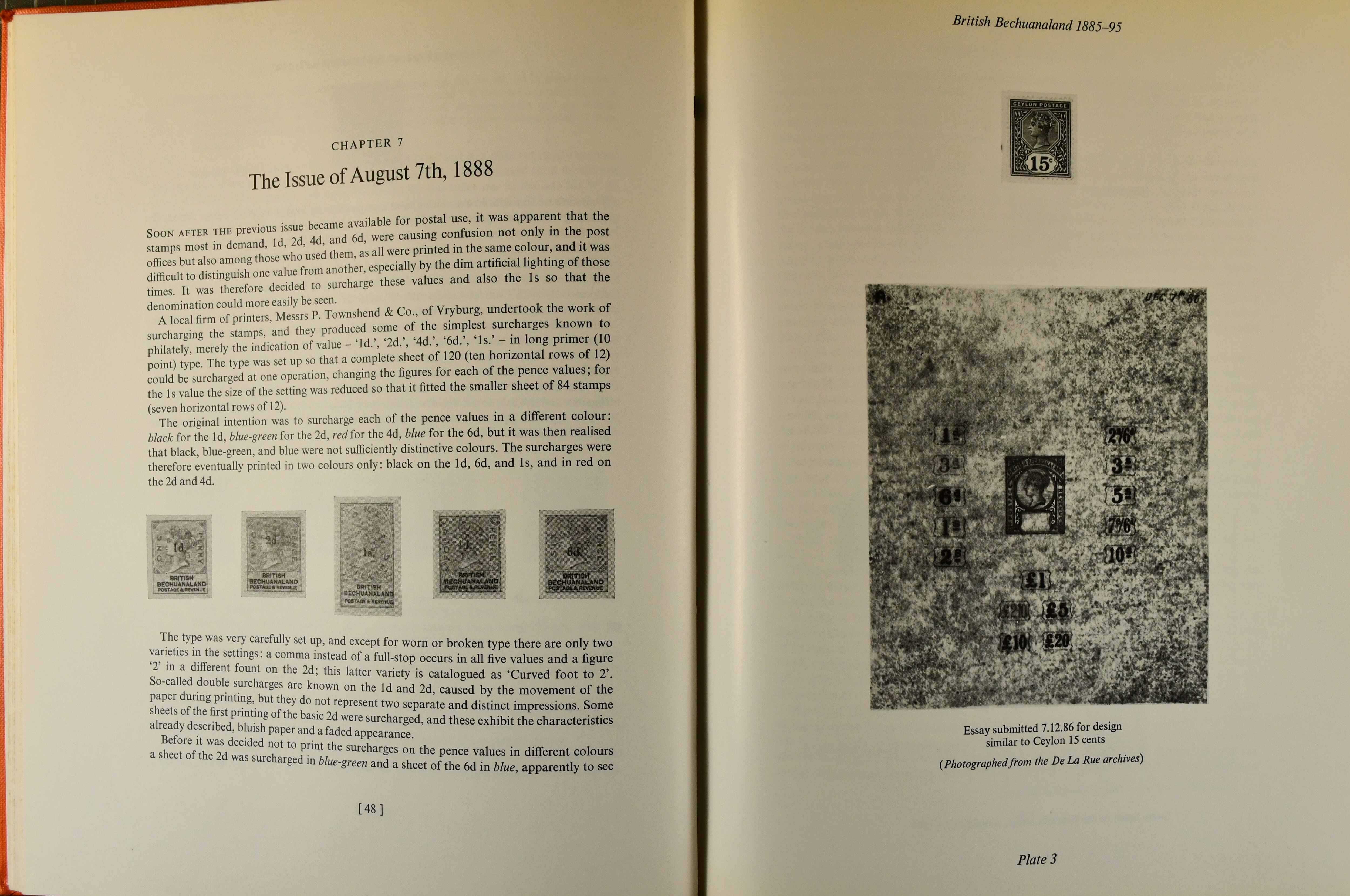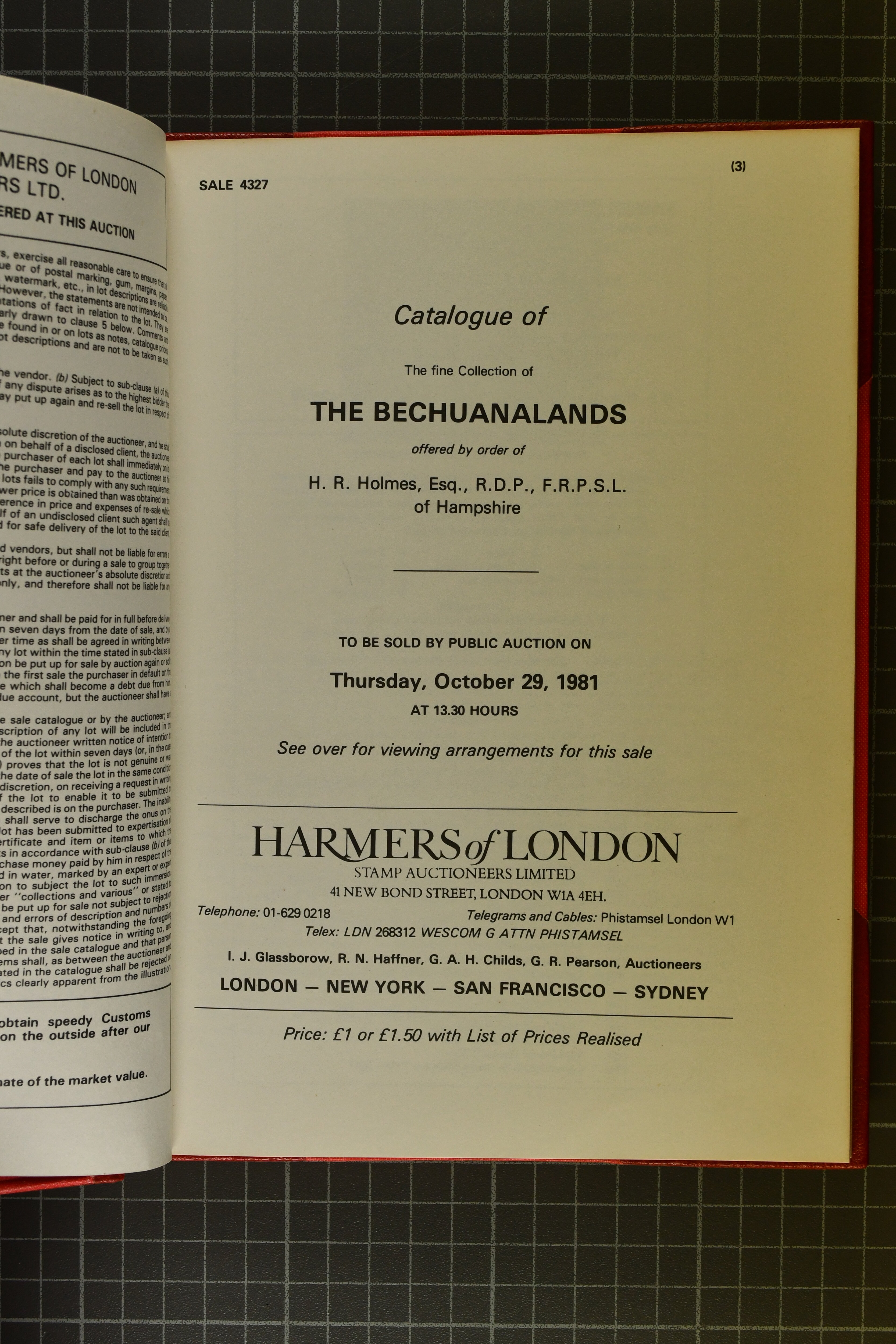 1940/81: 'The Bechuanalands a Brief History of the countries and Their Postal services to 1895' by A. A. Jurgens; 'H.R. Holmes Collection of The Bechuanalands' (Harmers) 1981 hardbound in red half-leather. A