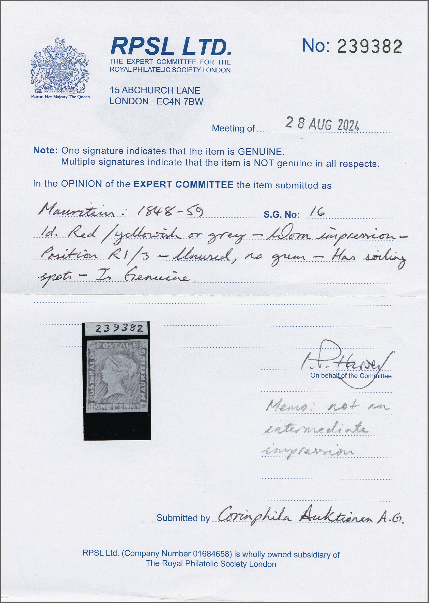 harshly attributed to soiling spots by RPSL), otherwise extremely fine, without gum. A very rare stamp unused. Cert. RPSL (2024) Gi = £ 8'000. (Image
