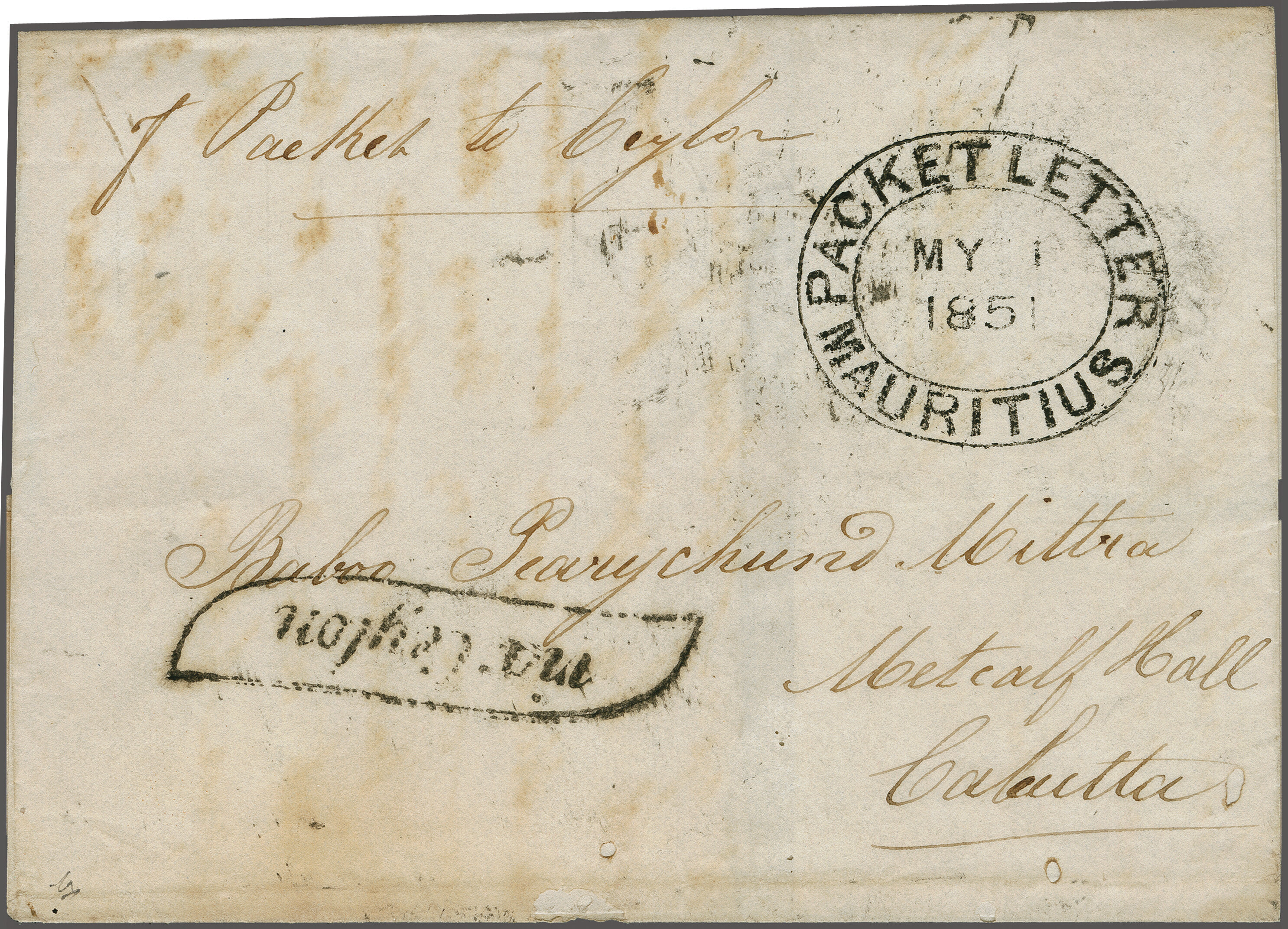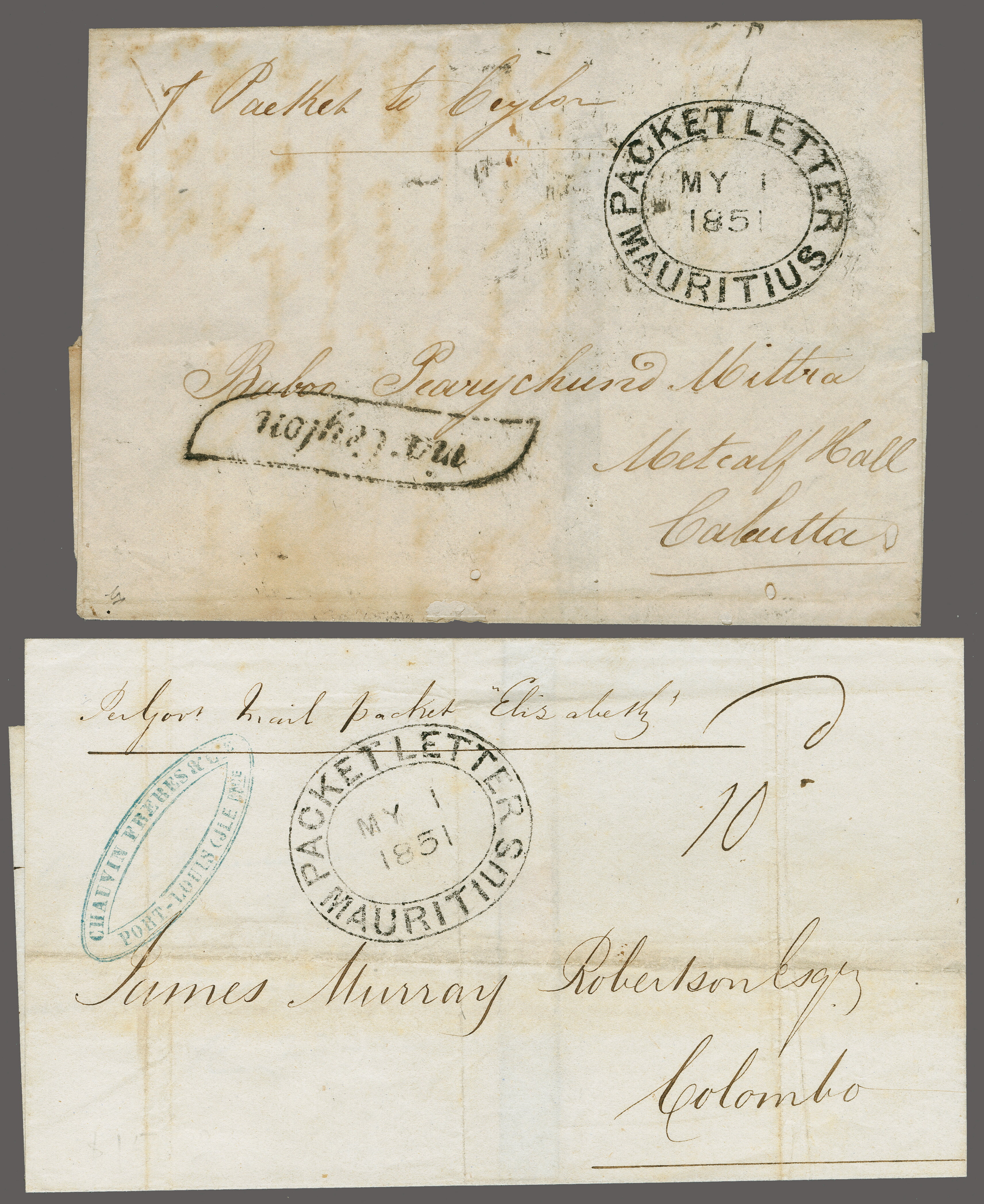 1851 (May 1): Covers (2) from Mauritius to Calcutta, India endorsed "p. Packet via Ceylon" struck with superb oval "PACKET LETTER / MAURITIUS in black (May 1), with curved framed "via Ceylon" handstamp at left in black: it is