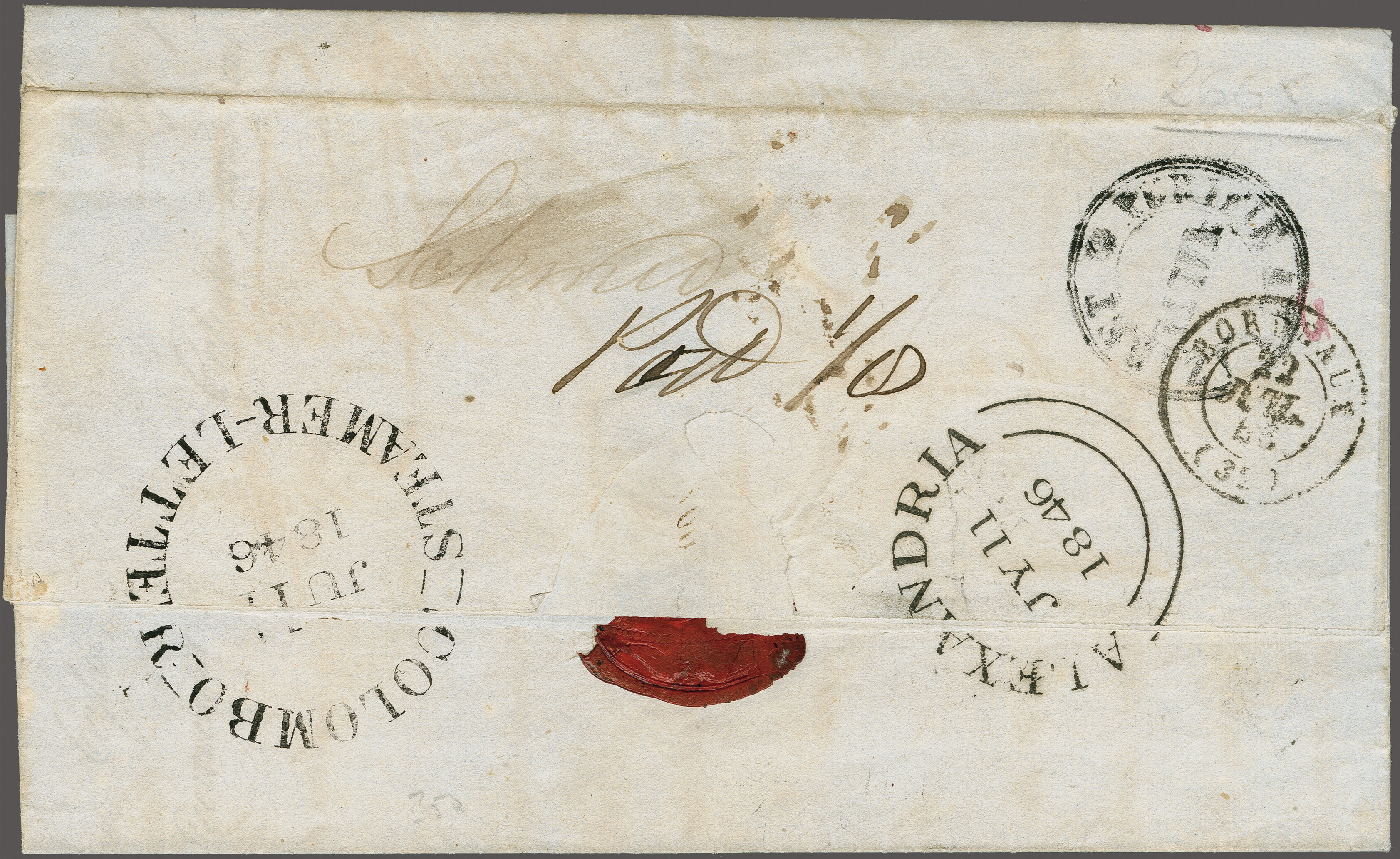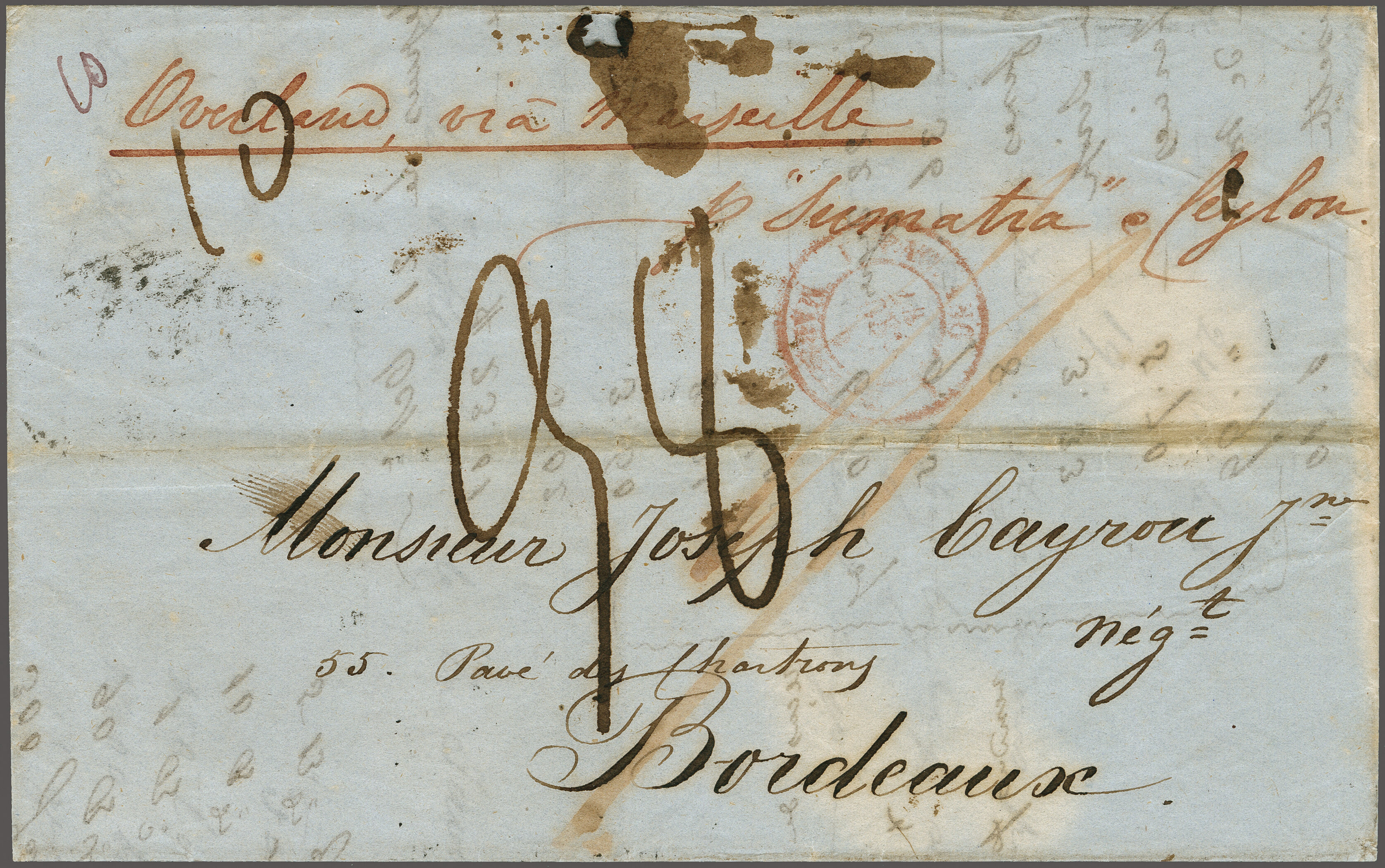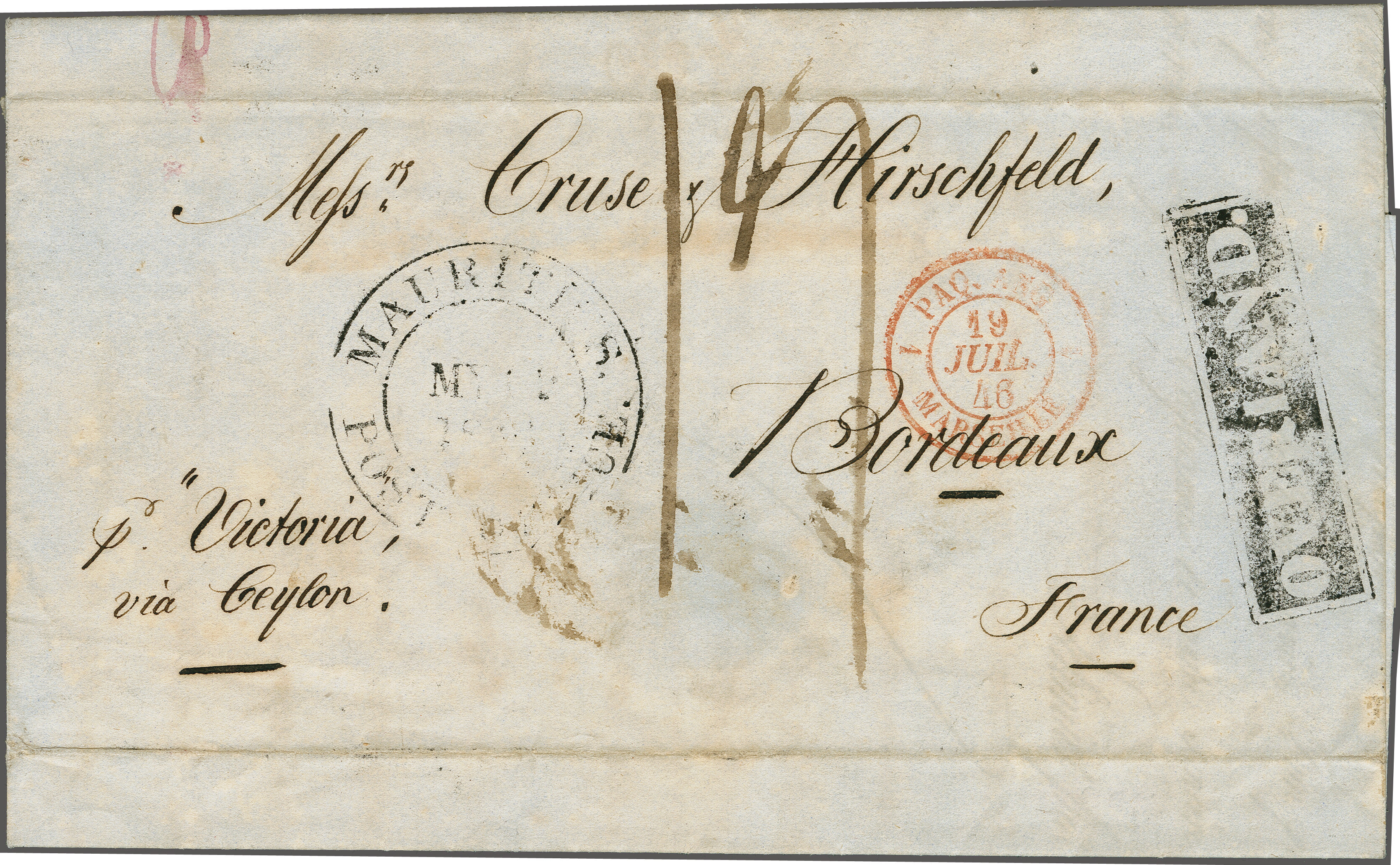 1846: Entire letter from Port Louis to Bordeaux endorsed "Overland via Marseille p. "Sumatra" et Ceylon" prepaid with manuscript "Paid 2/-"; struck with "MAURITIUS / POST OFFICE" cds (Oct 29), "COLOMBO / STEAMER LETTER" (Nov