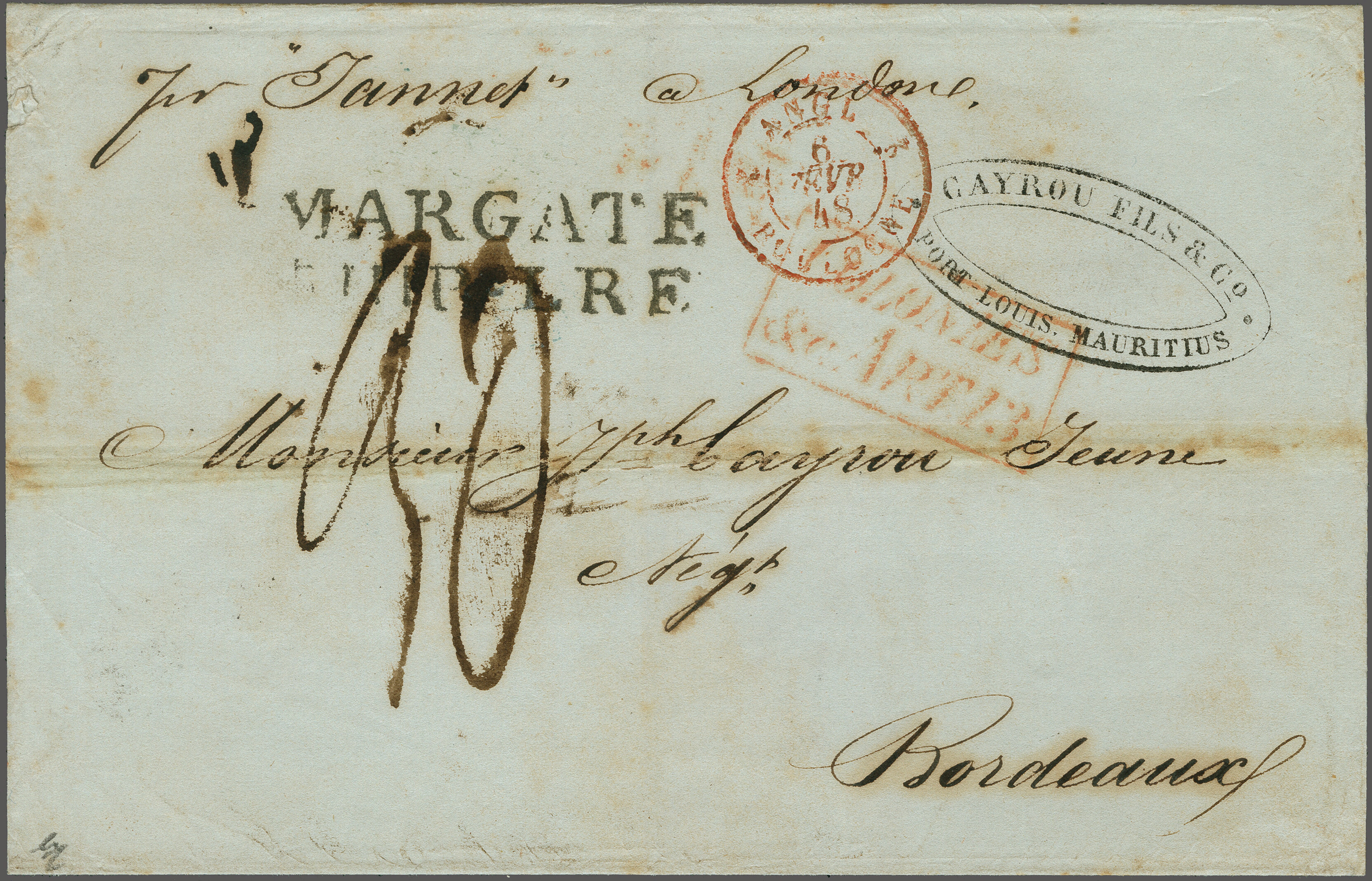 1847 (Nov 6): Cover from Port Louis to Bordeaux endorsed "per "Jannet" to London" with "MAURITIUS / POST OFFICE" cds of despatch on reverse, landed with "MARGATE / SHIP LRE" handstamp in black (Robertson S4). Struck in London