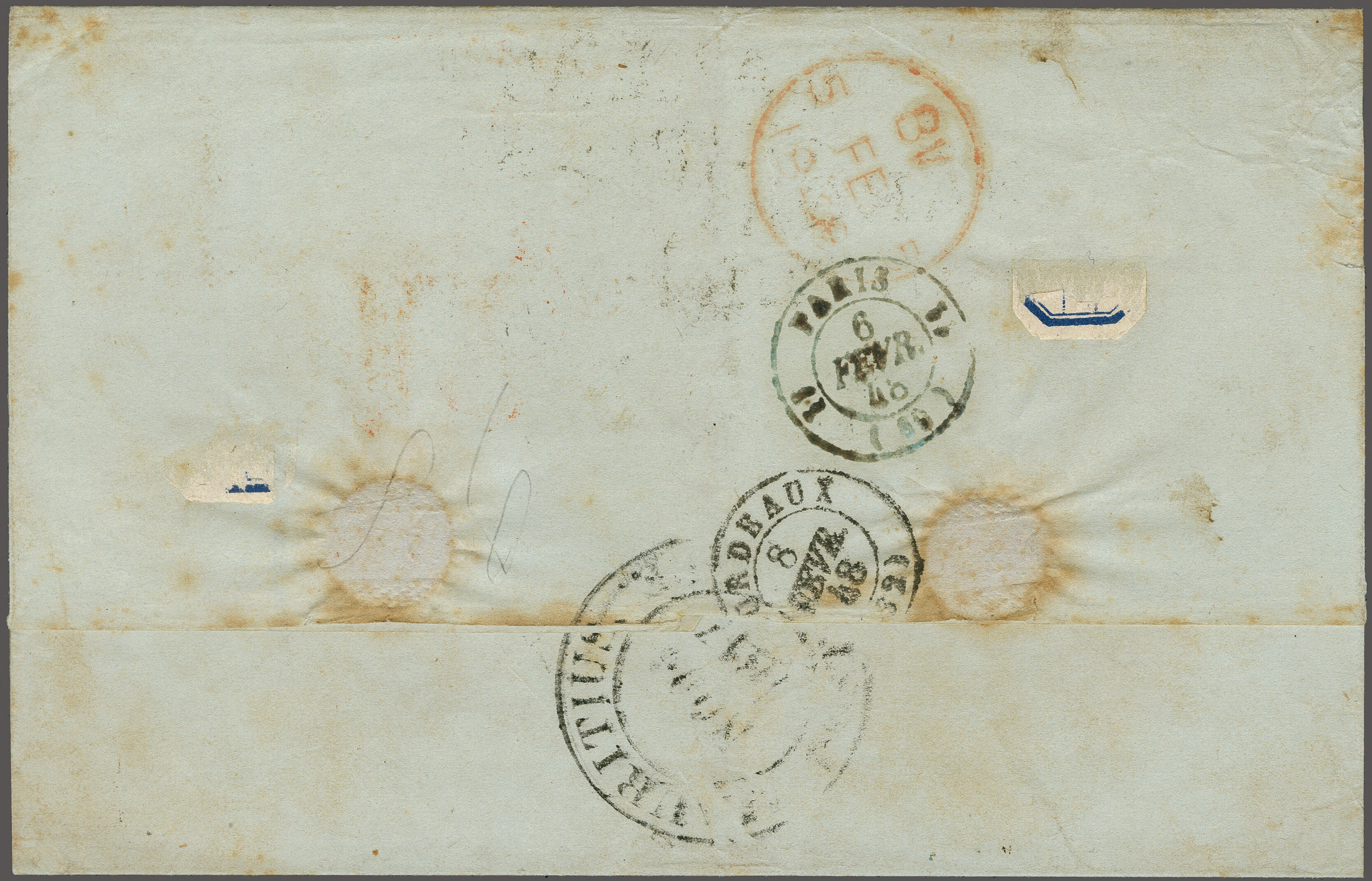 1846 (May 12): Entire letter from Port Louis to Bordeaux prepaid "1/8d." and endorsed "per Victoria via Ceylon" with "MAURITIUS / POST OFFICE" cds and rare usage of negative framed "OVERLAND" in black (Proud I1, latest
