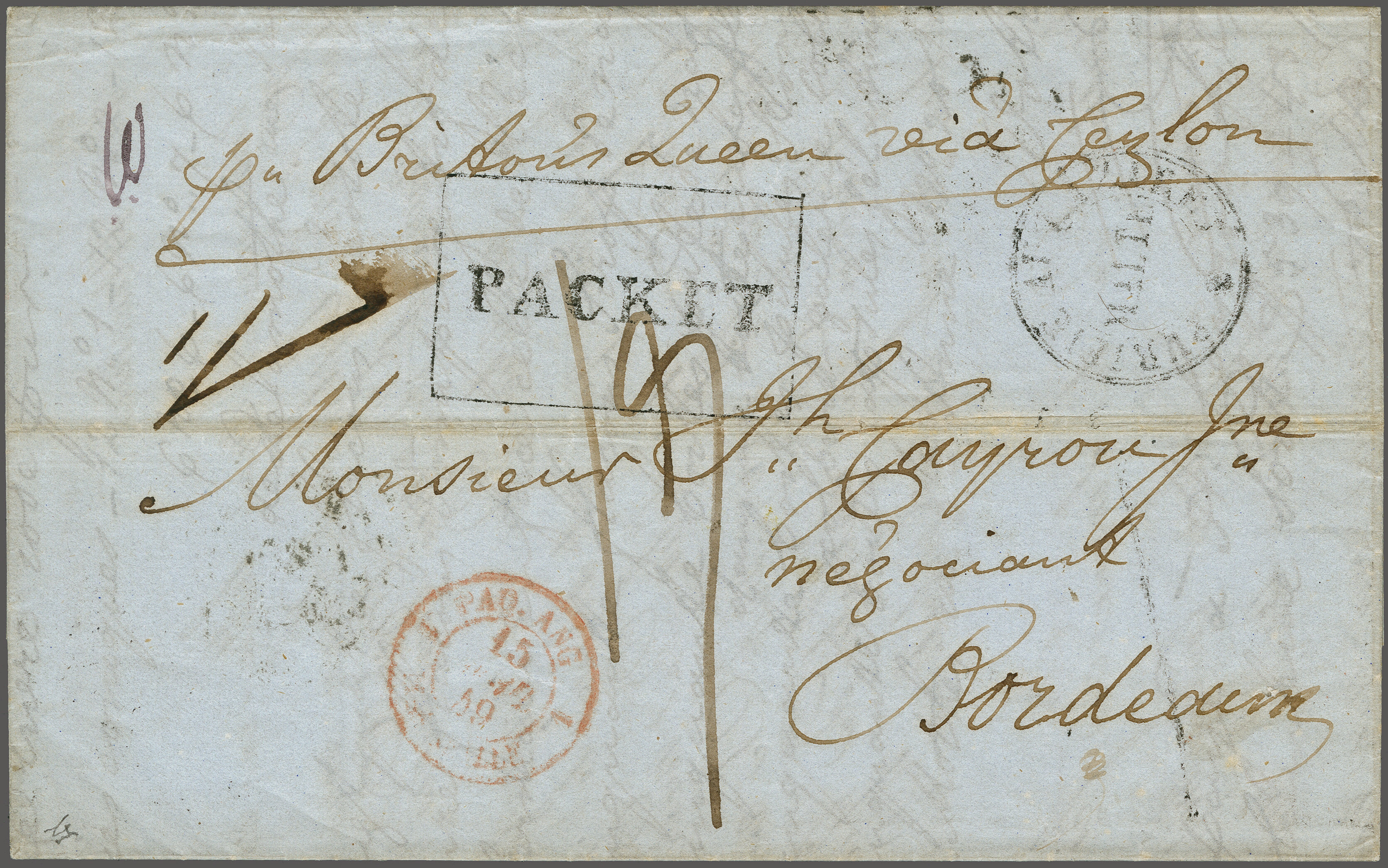 1849: Entire letter from Port Louis to Bordeaux endorsed "Per British Queen via Ceylon", struck with framed "PACKET" handstamp - (the earliest recorded usage, some three months prior to Proud listing) with "MAURITIUS / POST