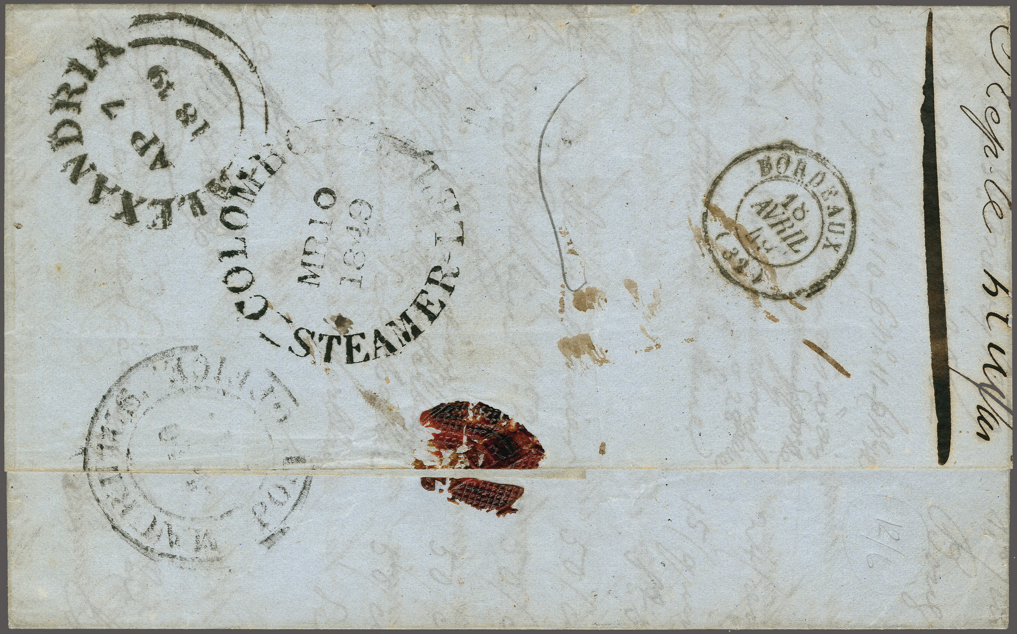 OFFICE" cds (Jan 21), "COLOMBO / STEAMER LETTER" (March 10), British P.O. "ALEXANDRIA" double arc cds (April 7), disinfected with "PURIFIE AU LAZARET / MALTE" all well struck in black. Obverse with Marseille entry mark in red and charged "19" décimes