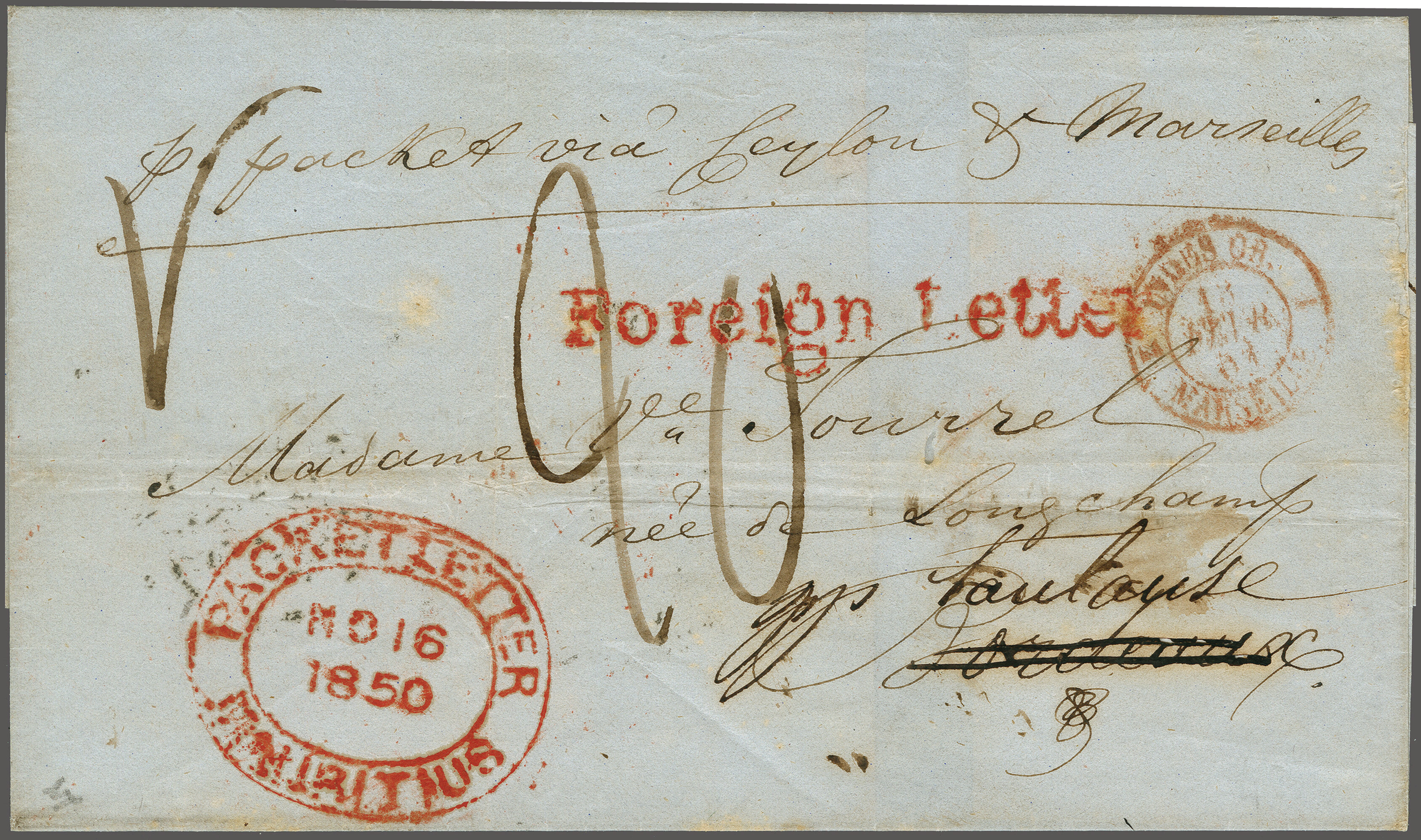 1850: Cover from Port Louis to Bordeaux and readdressed to Toulouse, endorsed "p. Packet via Ceylon & Marseilles" stuck with oval "PACKET LETTER / MAURITIUS" (Nov 16) in red and straight line "Foreign Letter" also in red