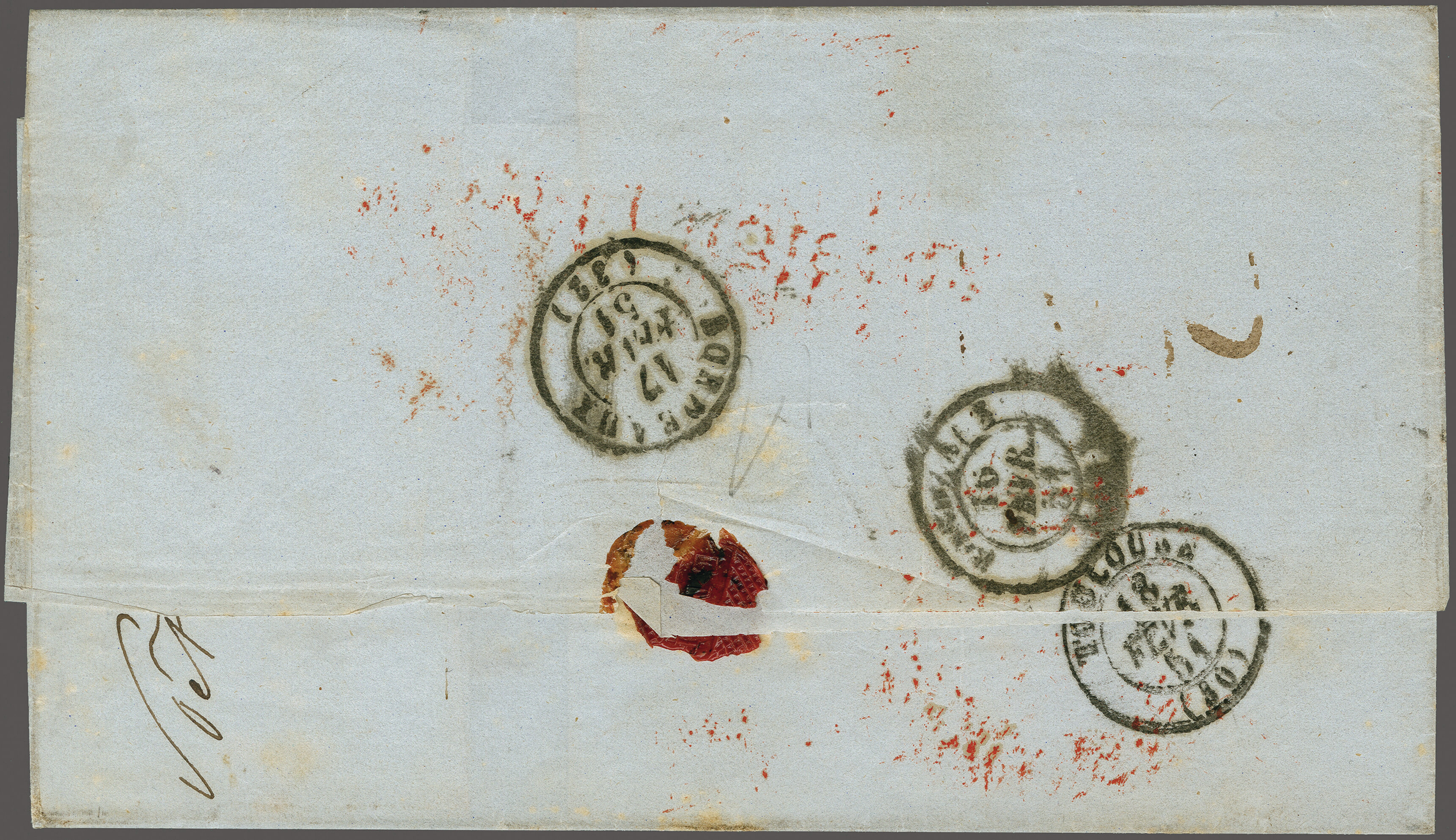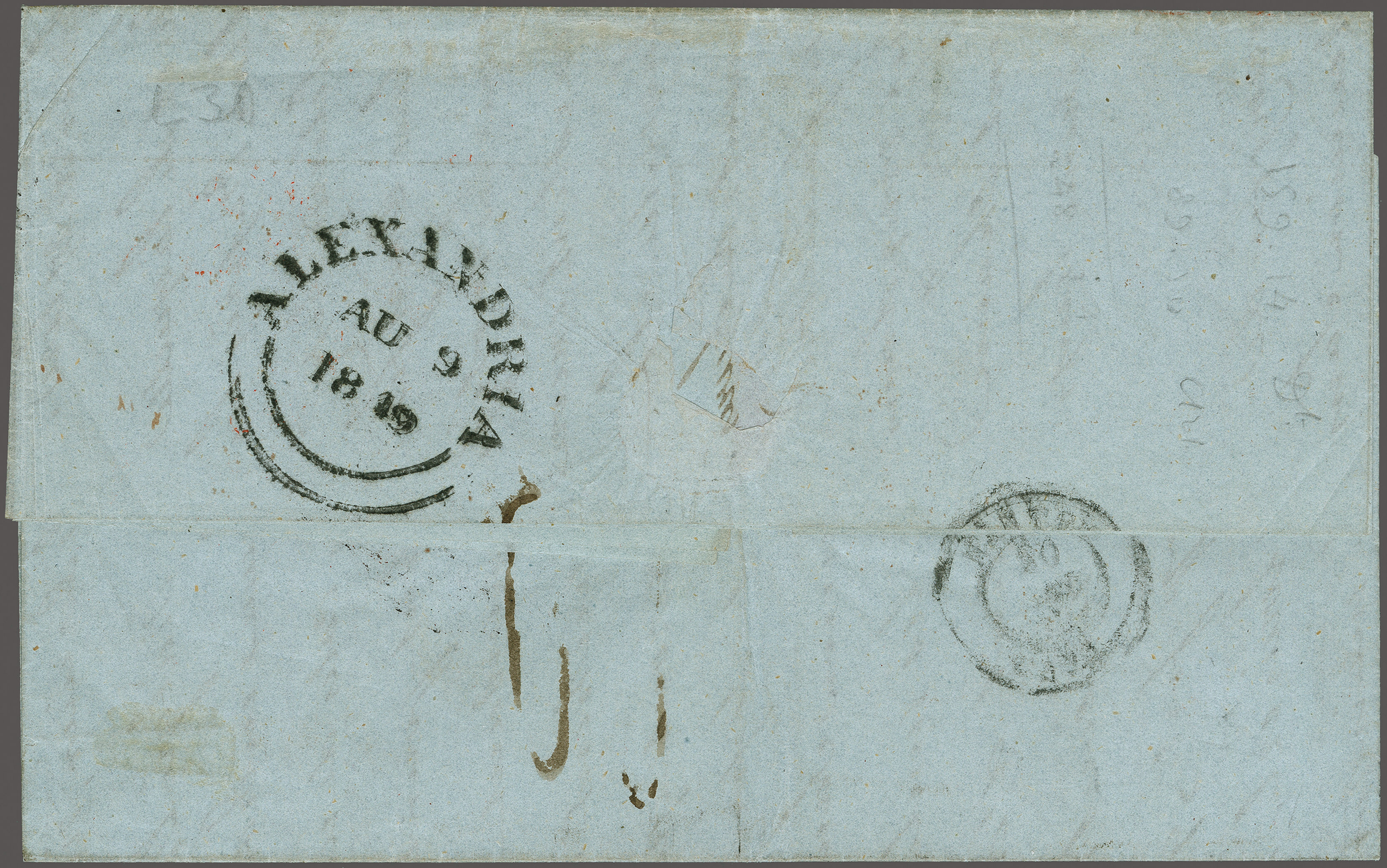 15), British P.O. "ALEXANDRIA" double arc cds (Dec 7), disinfected with "PURIFIE AU LAZARET / MALTE" all well struck in black. Obverse with Marseille entry mark in red and charged "38" décimes due to pay. Small flap tear but fine strikes and scarce