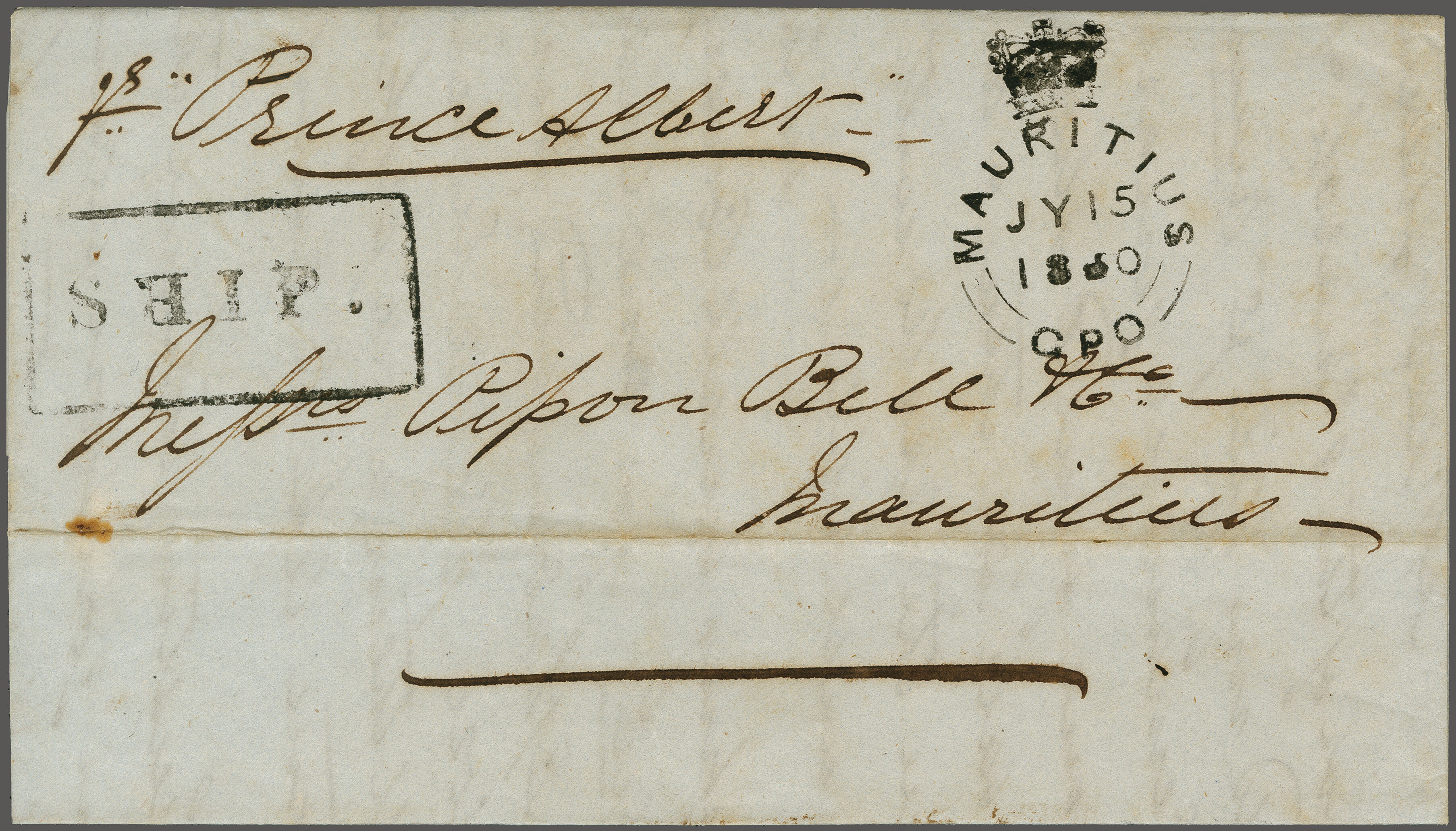 arrival with superb "♚ / MAURITIUS / GPO" cds (July 15) and very rare framed "SHIP." handstamp both in black (Proud SL1O, sporadically in use for seven months only, this being the latest recorded date of use). A rare and particularly fine entire. (Image 1)