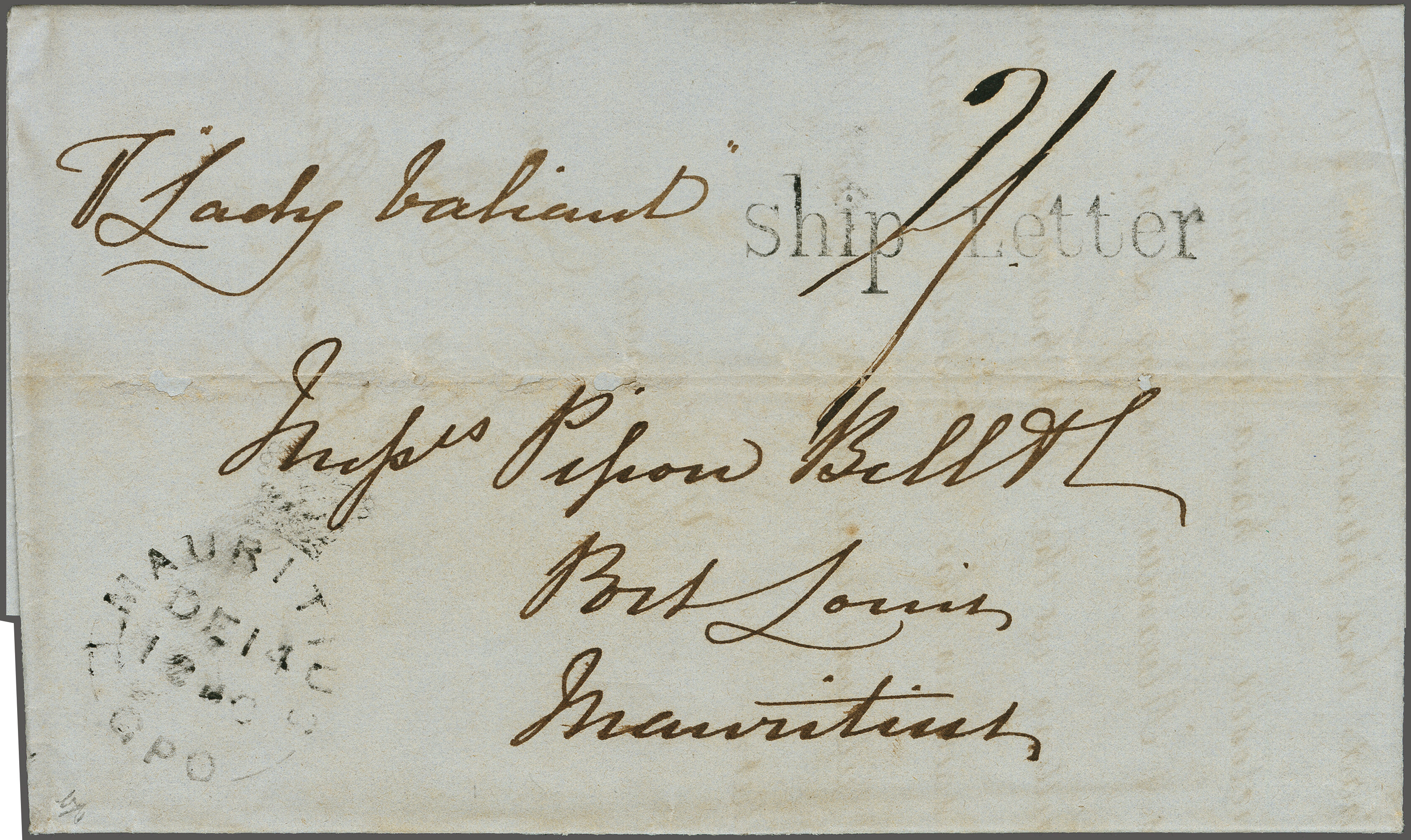 1850 (Sept 17): Entire letter from London to Port Louis, Mauritius endorsed "p. Lady Valiant", struck on arrival with "♚ / MAURITIUS / GPO" datestamp (Dec 14) and superb "ship Letter" straight line handstamp, both in black -