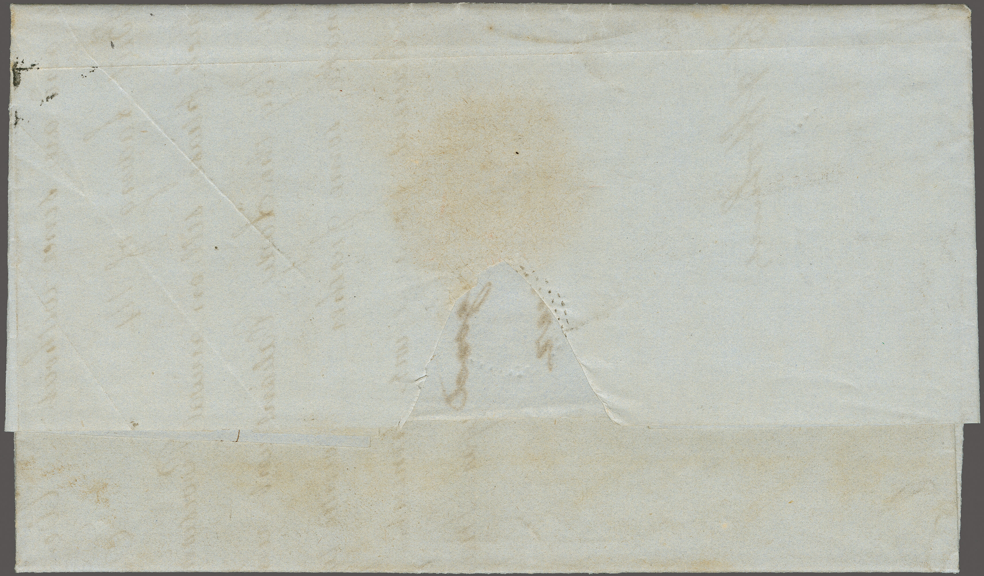 thence to Trenton with charge mark of "9" cents due (2 d. unpaid = 4 cents + USA internal charge of 5 c. = 9 cents due). It is interesting to note that the "9" is an inverted "6" as there was no handstamp in Boston for this rate. Full contents with