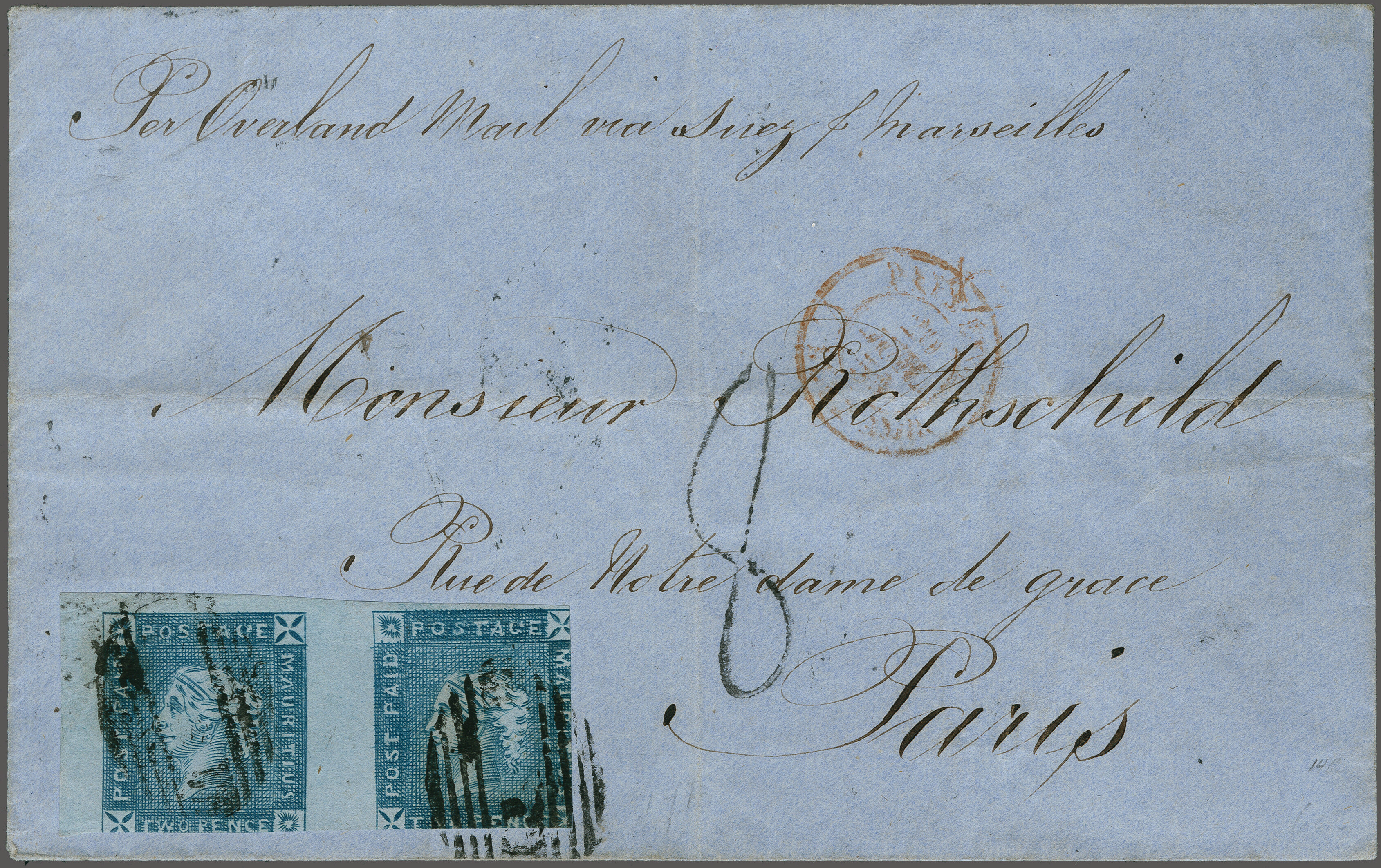Scott Archer. Note: Carried on "Elizabeth" from Port Louis (20 June), via Galle on P&O Packet "Haddington" via Aden to Suez (Aug 6), Alexandria (9 Aug), P&O "Hindustan" via Malta and French Packet "Medina" arriving Marseilles (19 August). (Image 1)