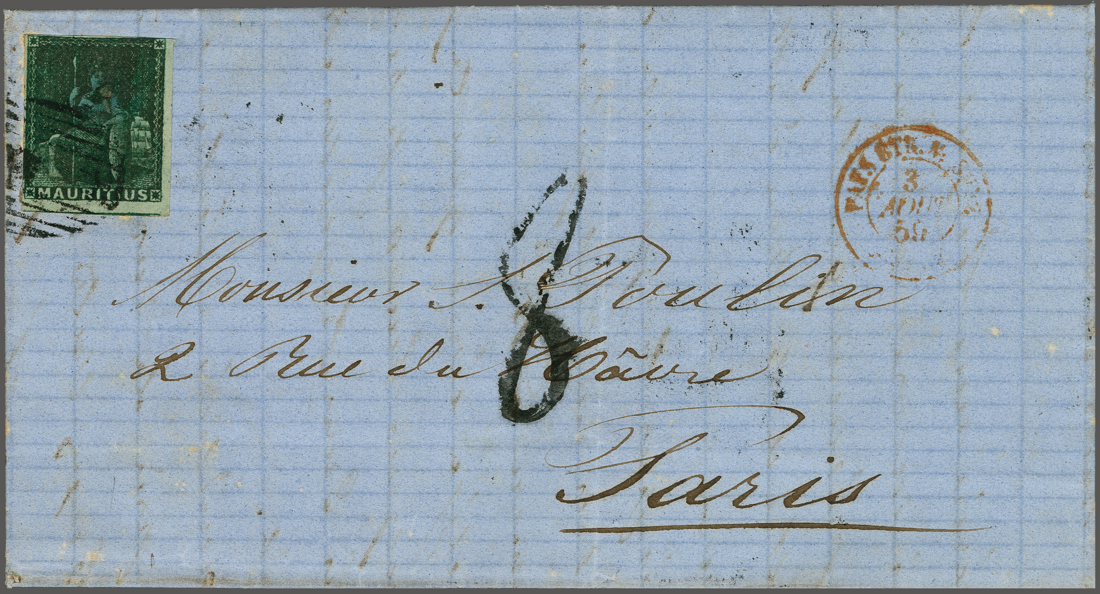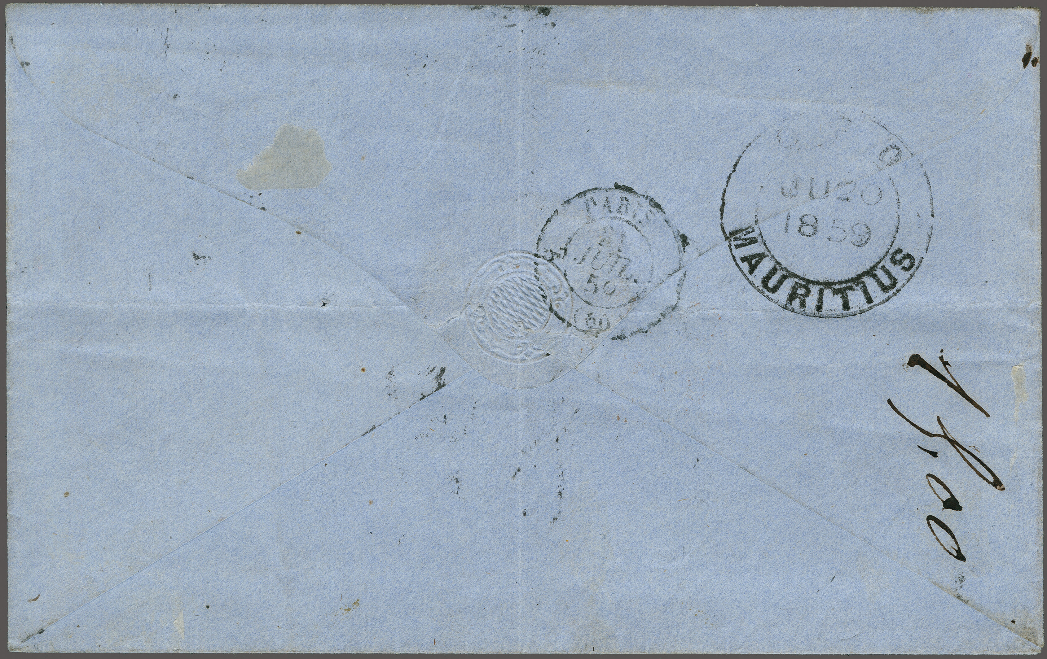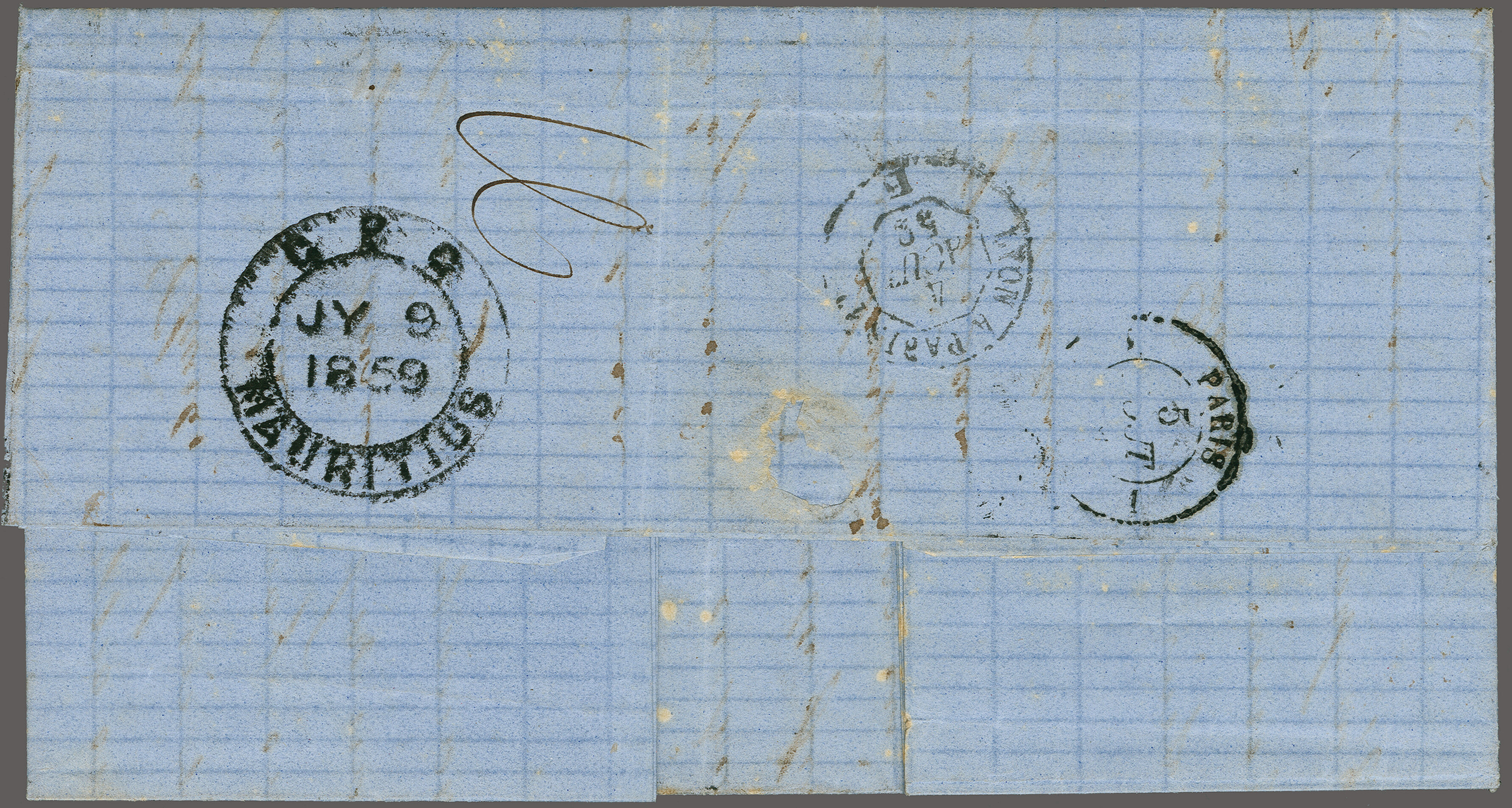 endorsed "Per Overland Mail via Suez and Marseilles" tied by the void obliterator handstamps in black. Reverse with "G.P.O. / MAURITIUS" despatch cds (June 20) in black with circular "Pays Etr. / Marseille" in red on obverse (July 20). Paris arrival