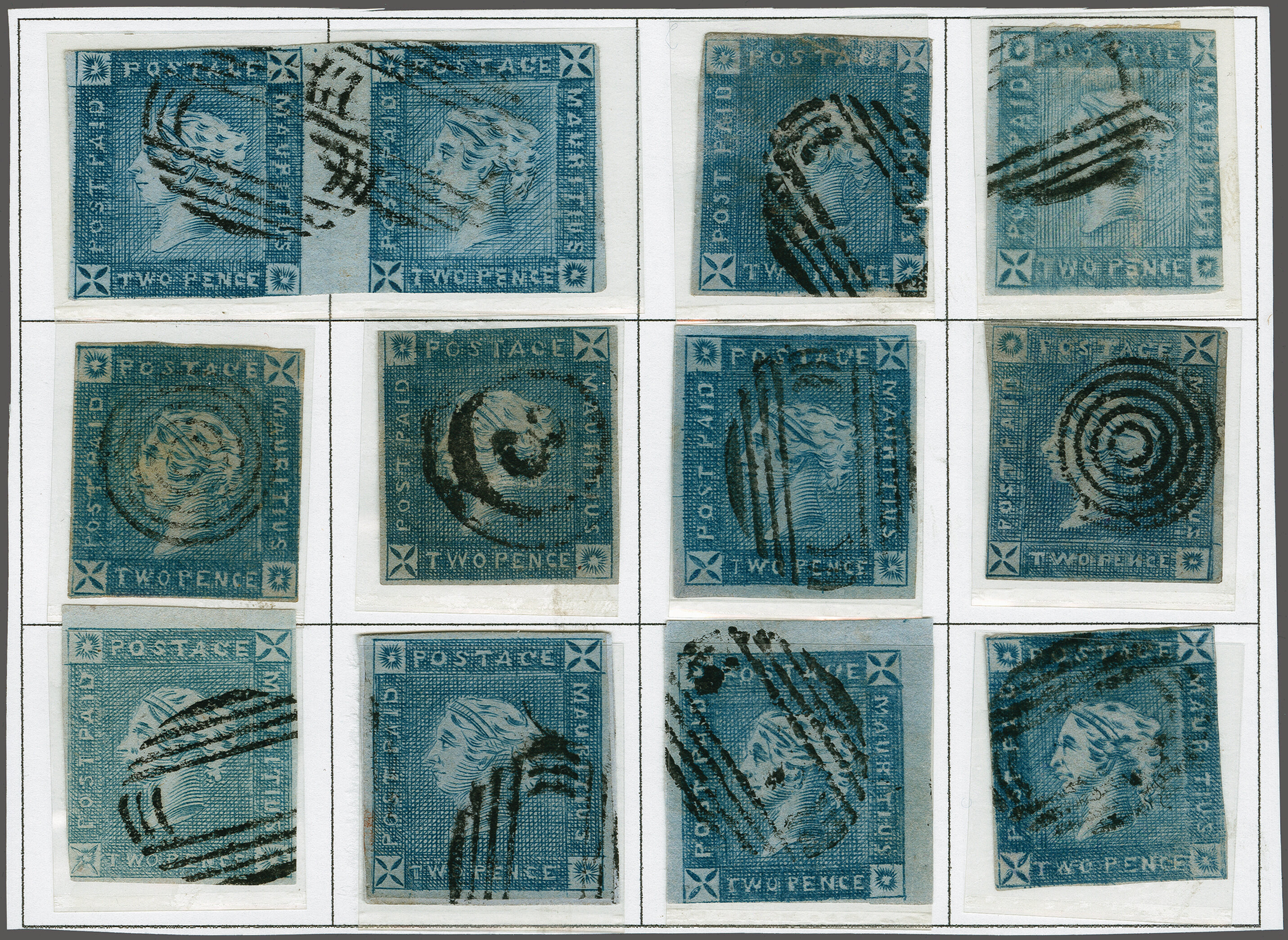 1859 (March-Nov): Lapirot issue, 2 d. blue (shades), the complete replating of the sheet of twelve subjects used, various impressions with most lacking margins, incl. a horizontal pair (pos. 1-2), early impression superb