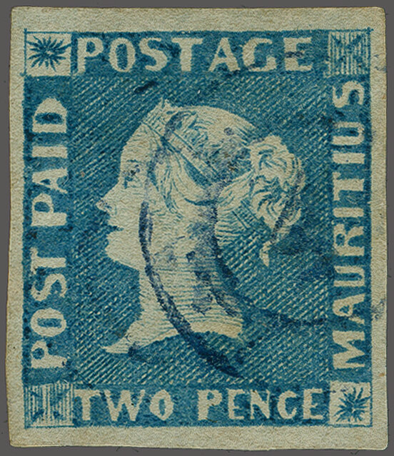 1854/57: Post Paid 2 d. blue, Intermediate Impression, position 8 on the sheet of 12 subjects, four even margins all round, unusually cancelled by circular numeral handstamp in blue, slightest thin spot in the chignon, a most