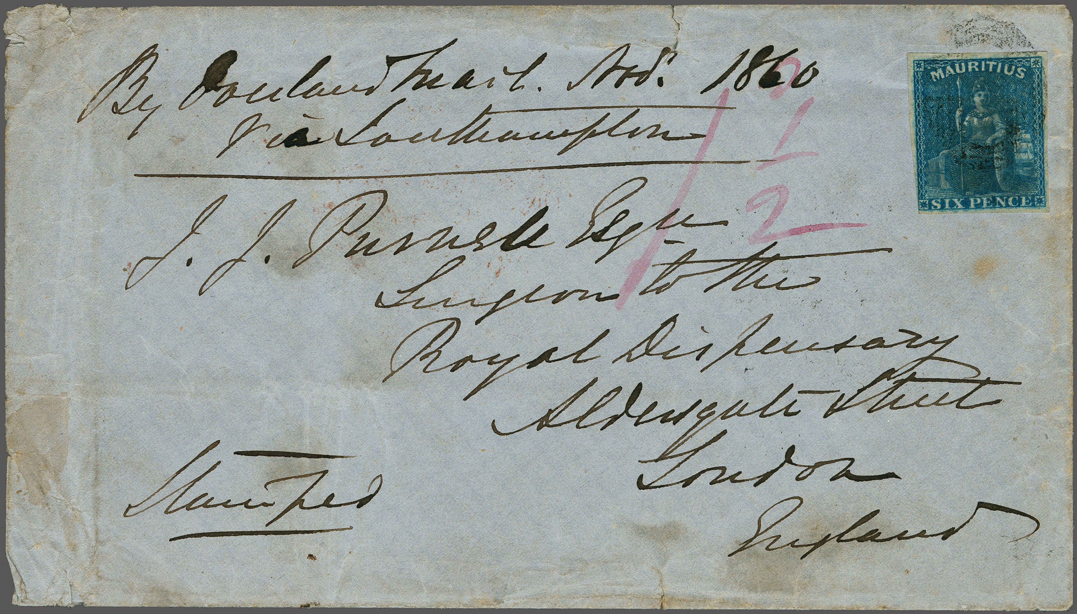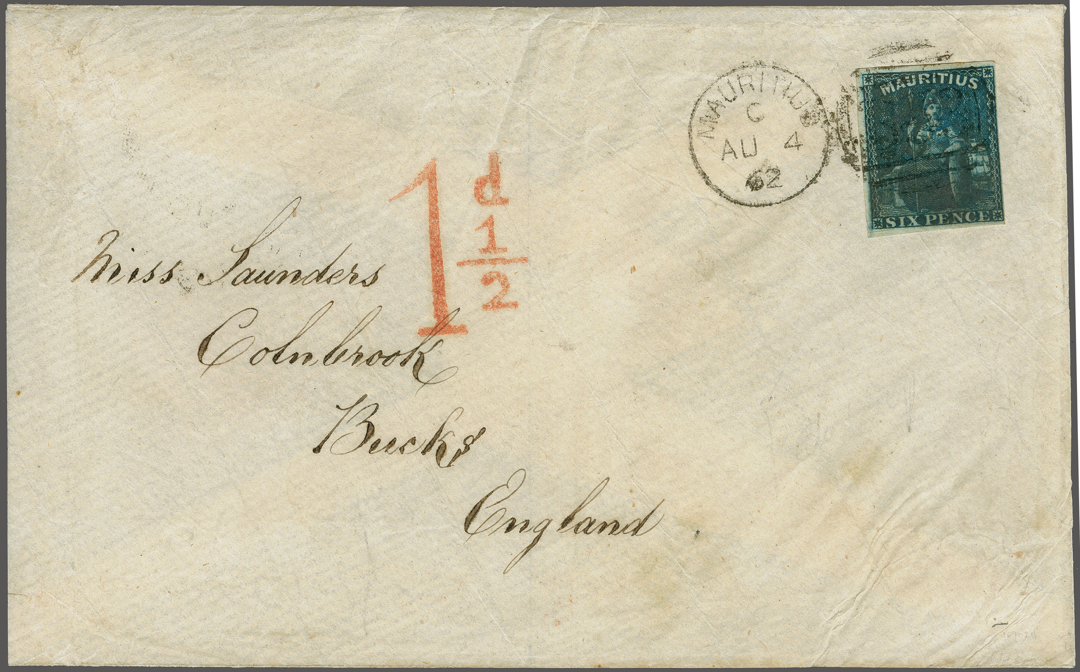 1859/61: Britannia 6 d. blue, a used example with clear to large margins all round, small scissor cut in margin only at base, on 1862 cover to London tied by "Mauritius / B53" duplex (Aug 4) in black, with handstruck "1½d."