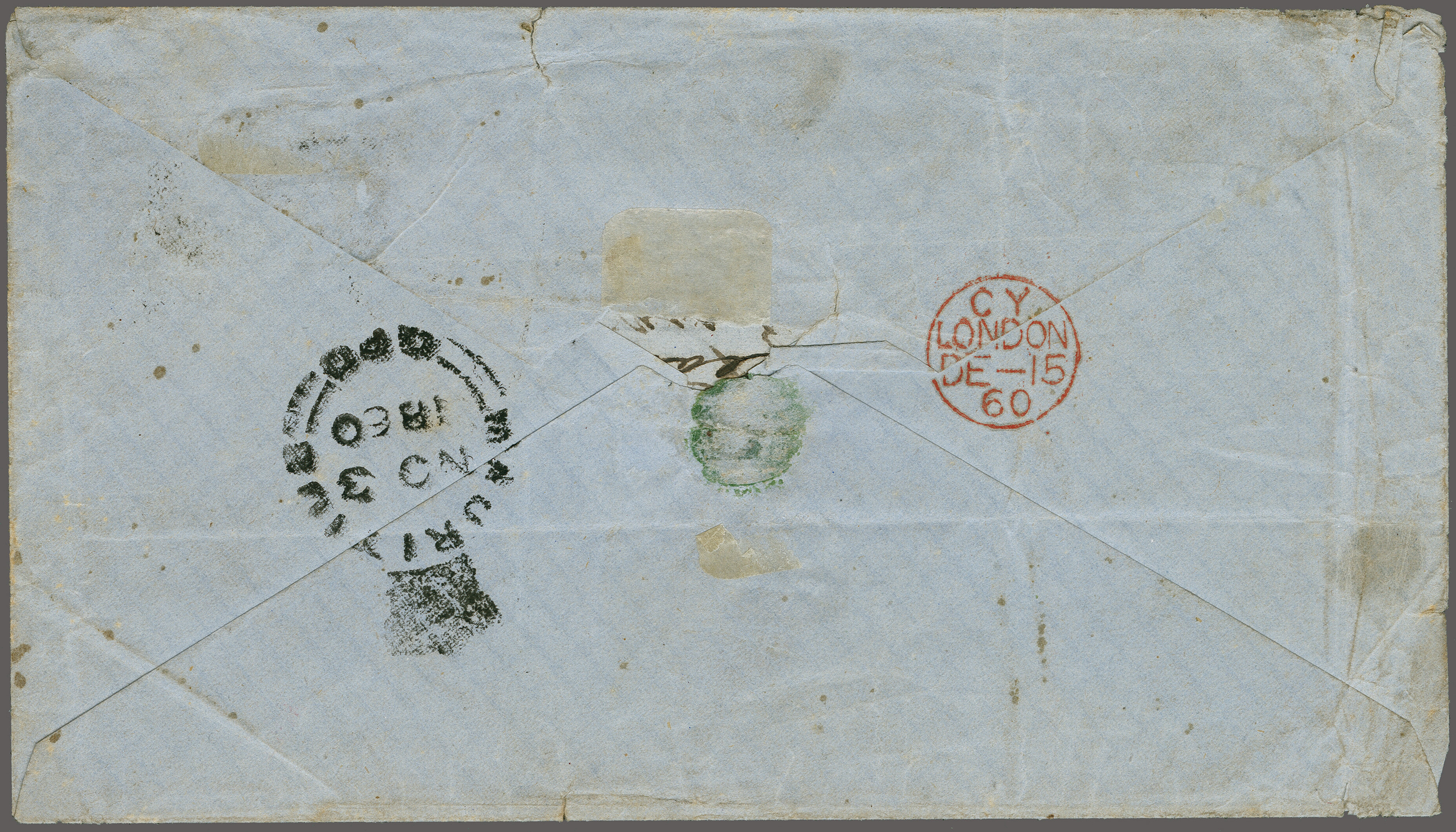1859/61: Britannia 6 d. blue, a used example with close to large margins all round, used on 1860 cover (with original contents) to London endorsed "By Overland Mail, 1 Nov 1860 via Southampton", lightly tied by void