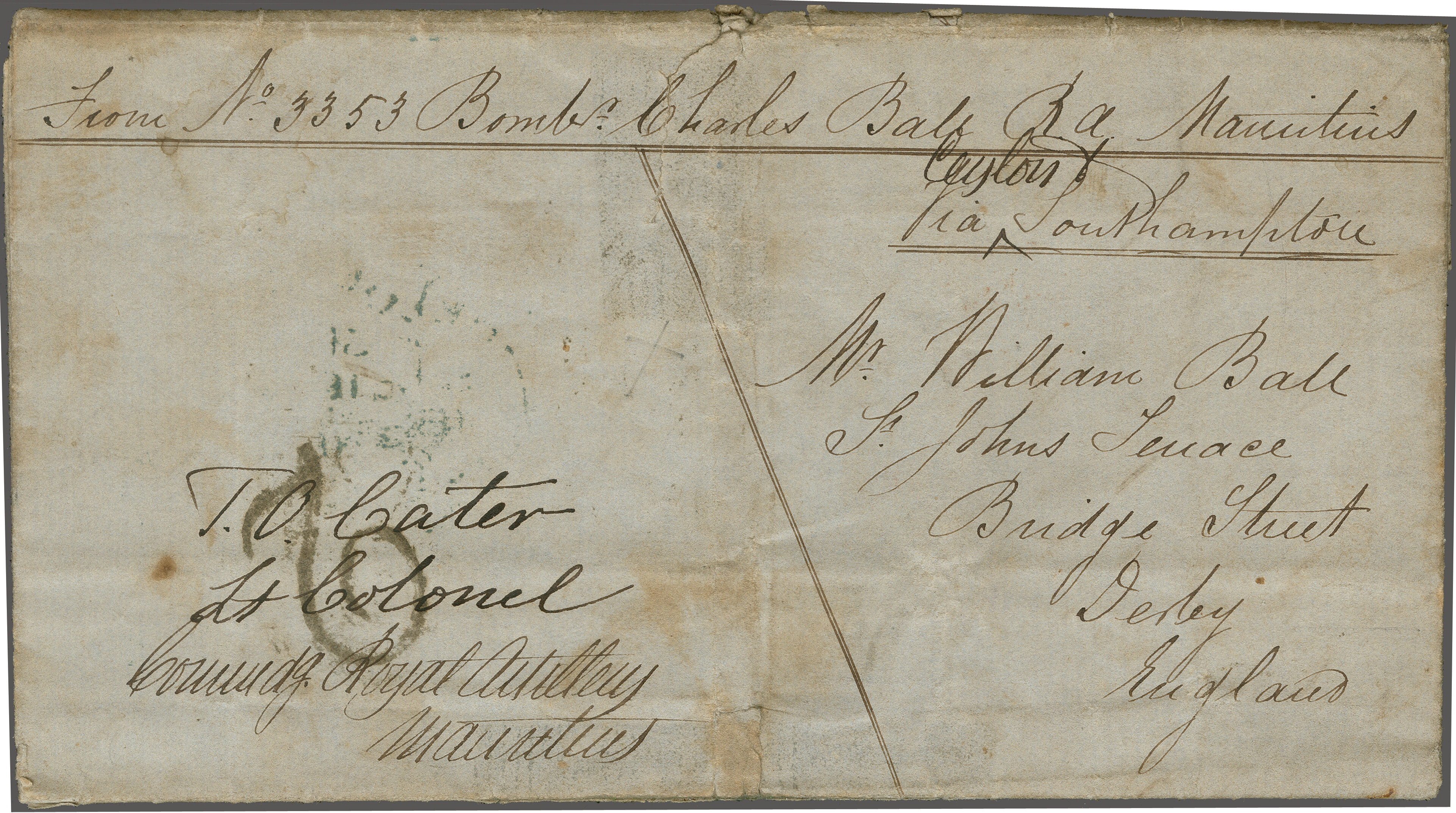 1852 (July): Soldier's concessionary rate entire from Bombardier Charles Ball, Royal Artillery, Mauritius to Derby, England, counter-signed by Lieutenant Colonel Carter, endorsed 'Via Ceylon & Southampton', with '2' pence