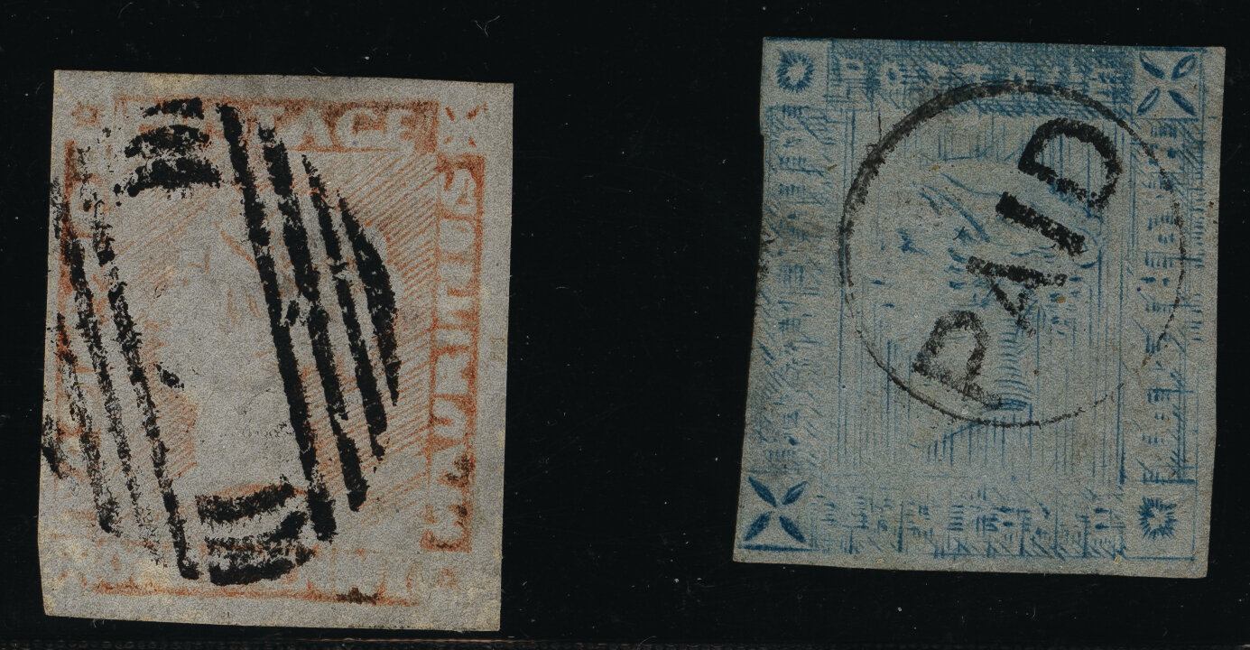 1857/59: "Post Paid" 1d. red on bluish paper, worn impression, four margin example tied by oval bars together with 1859 'Lapirot' 2d. blue on bluish paper used with circled 'PAID' h.s., cut into at left and