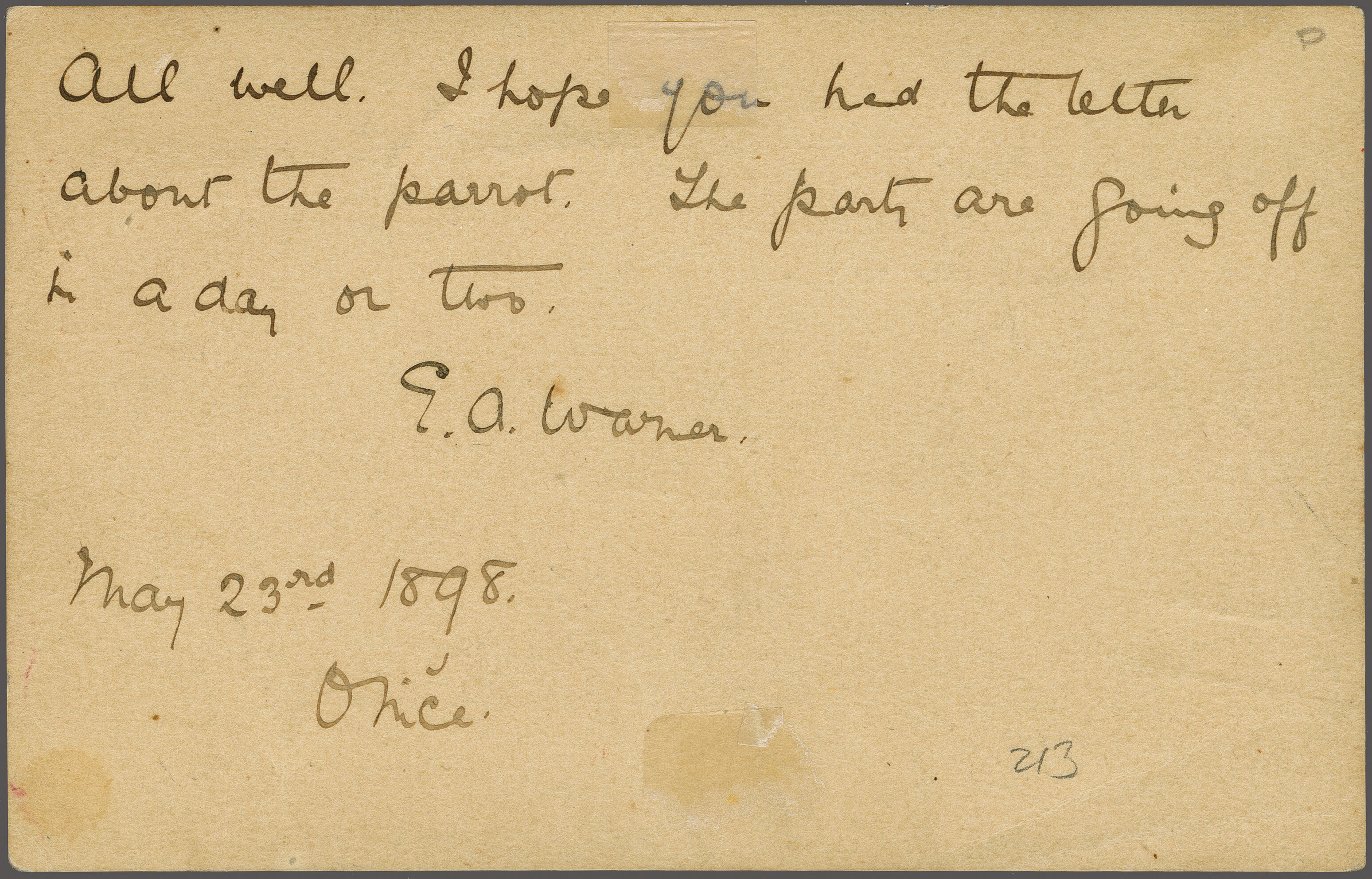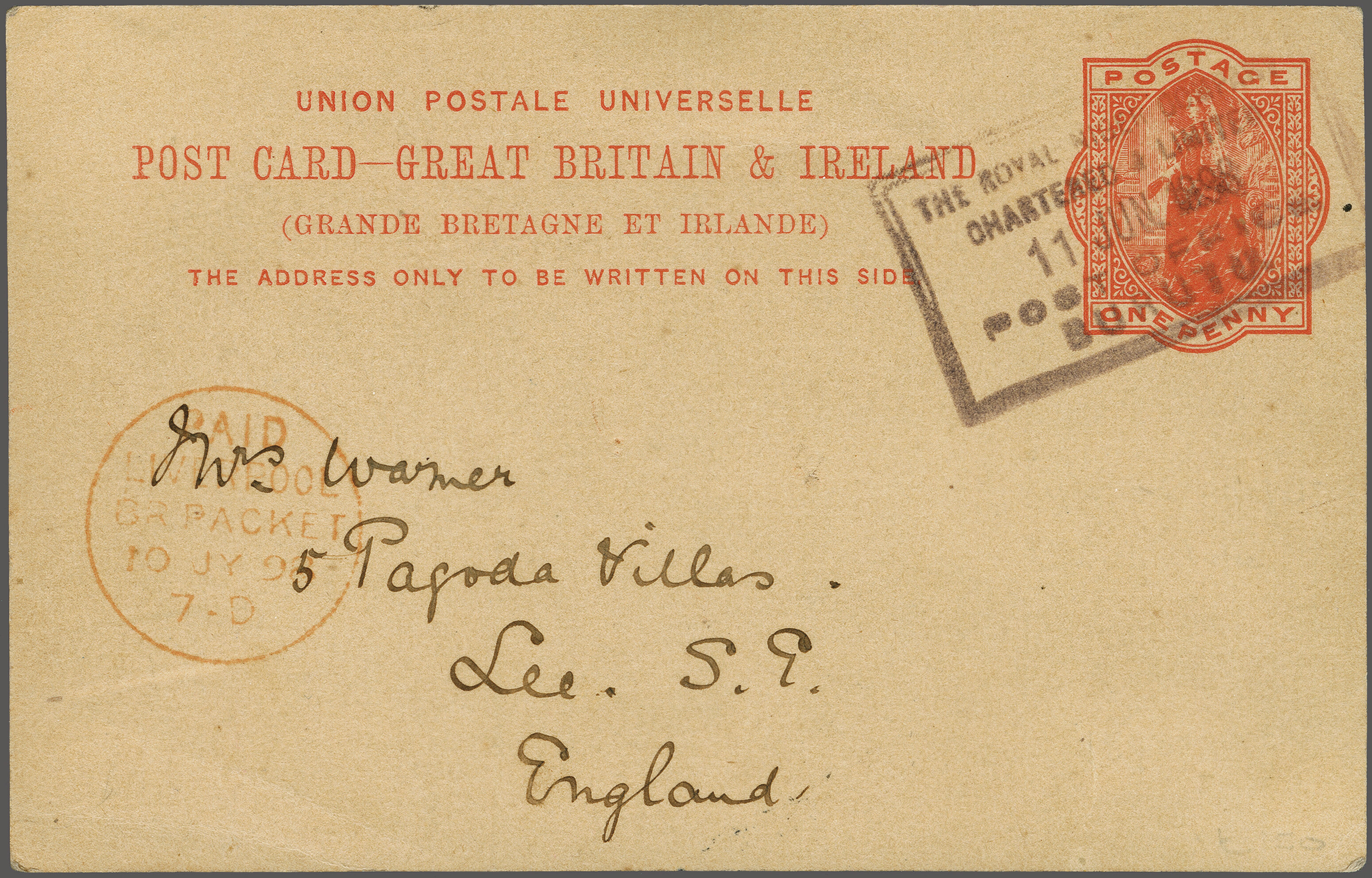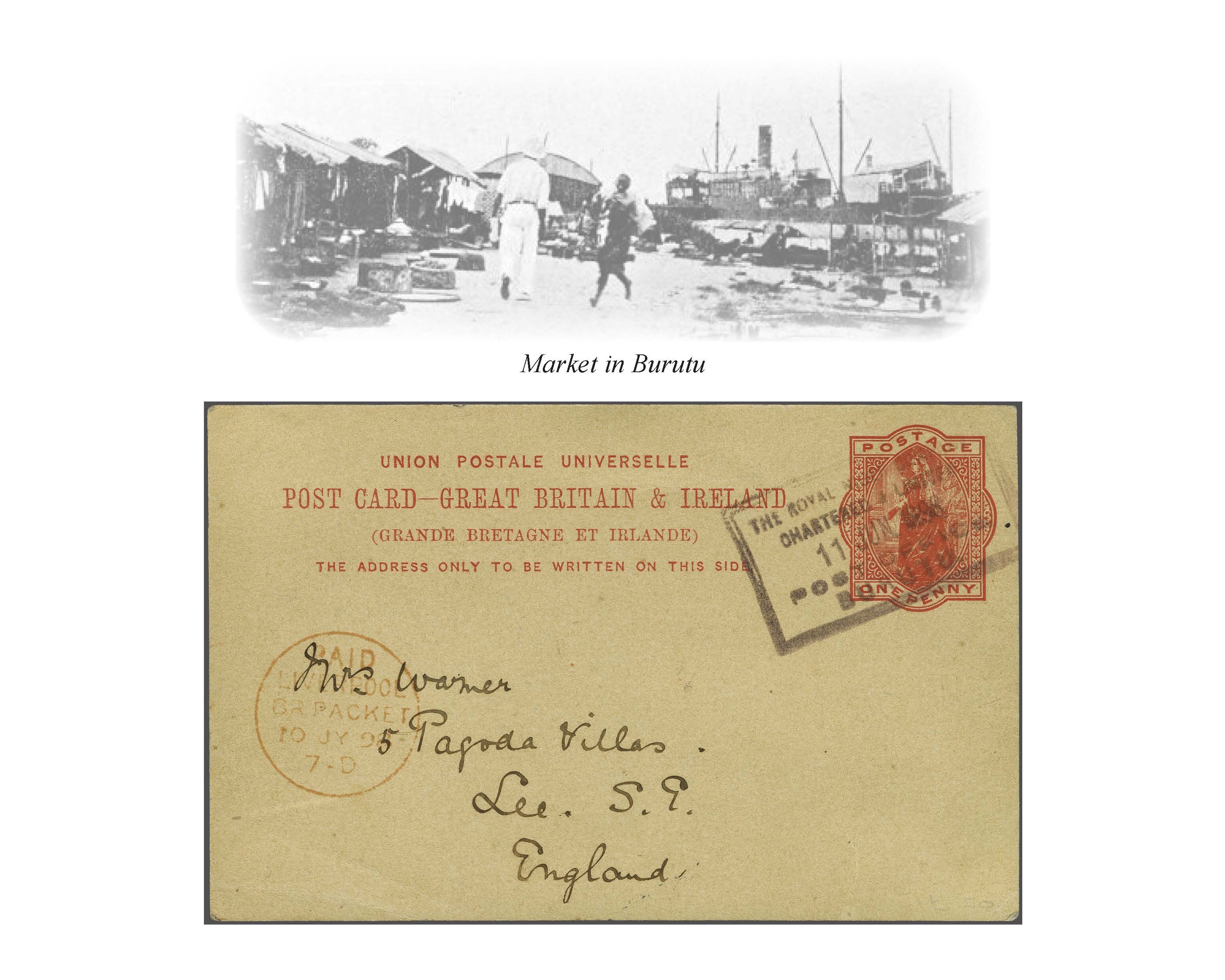 628 cover imageNiger Company Territories 1895: Great Britain 1 d. vermilion postal stationery card, used from Burutu to Lee, England, dated 11 June 1896, cancelled by the "THE ROYAL NIGER COMPANY / CHARTERED & LIMITED. / 21 FEB. 1898 / BURUTU" rectangular handstamp in black, with a "PAID / LIVERPOOL / BR: PACKET" maritime transit postmark in red alongside dated 23 March 1898. Short handwritten message to back. Hinge remains otherwise fine and very rare example; one of two recorded. Note: The stamps of Great Britain were supplied to the Royal Niger Company for use from 1888. Occasionally postal cards from Oil Rivers/Niger Coast were used in the Territories. Only two British cards cancelled by the 'BURUTU' rectangular handstamp, in sans-serif, are recorded. One in violet and one in black. Reference: Ince & Sacher, pg. 129 "Use of Oil Rivers or Niger Coast Protectorate Stamps and Postal Stationery in Niger Territories..." ; The Postal Stationery of Nigeria, by Peter Hørlyck, illustrated on pg. 56. (Image 1) (Image 2) (Image 3)