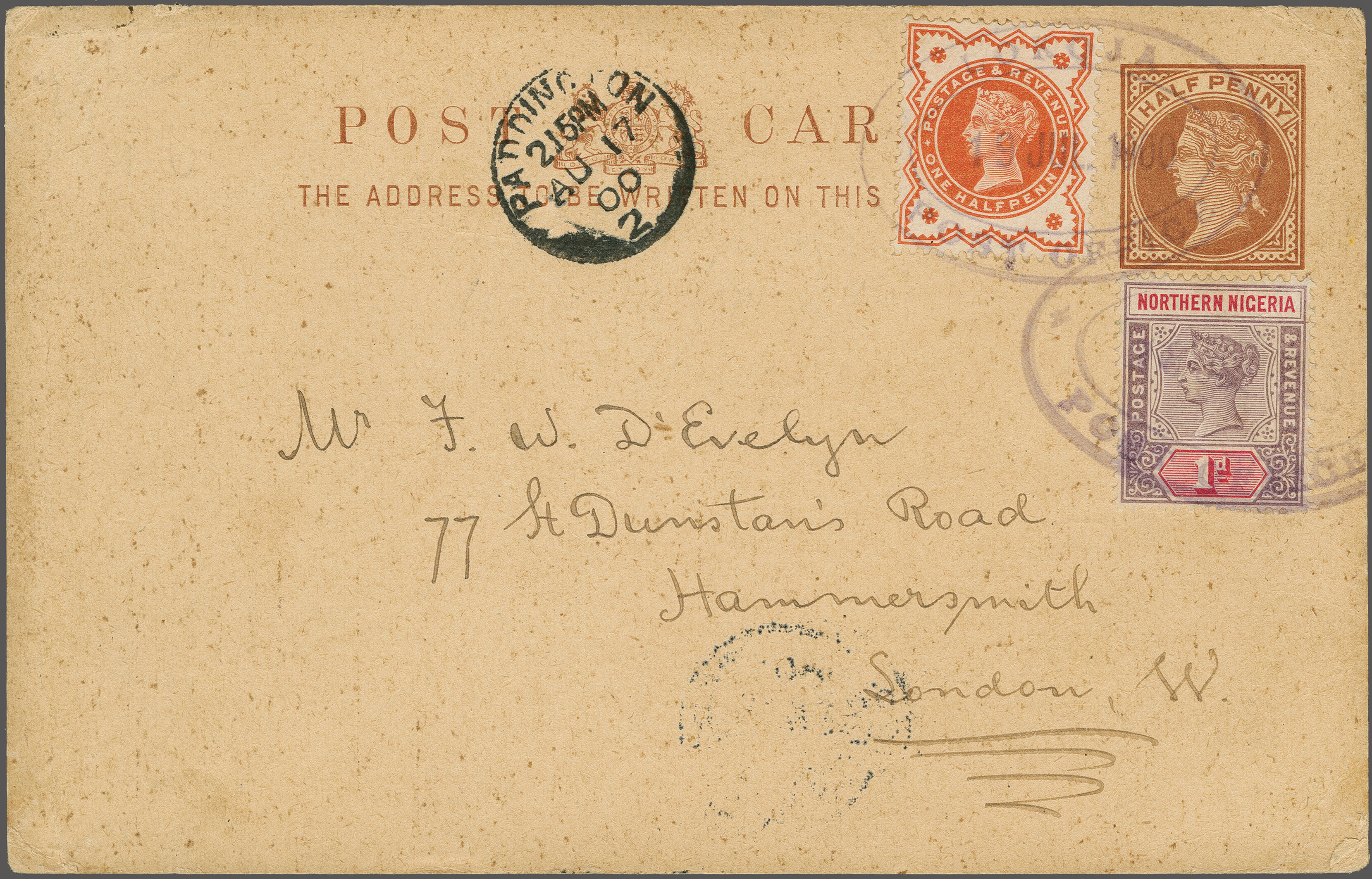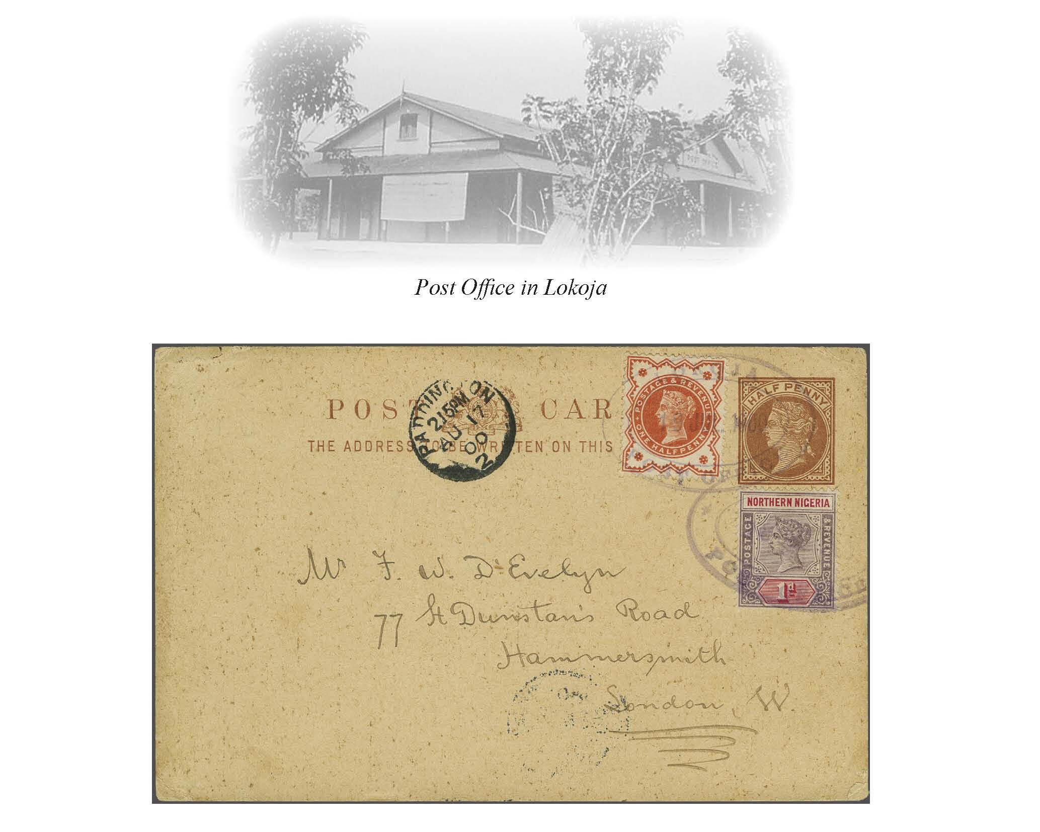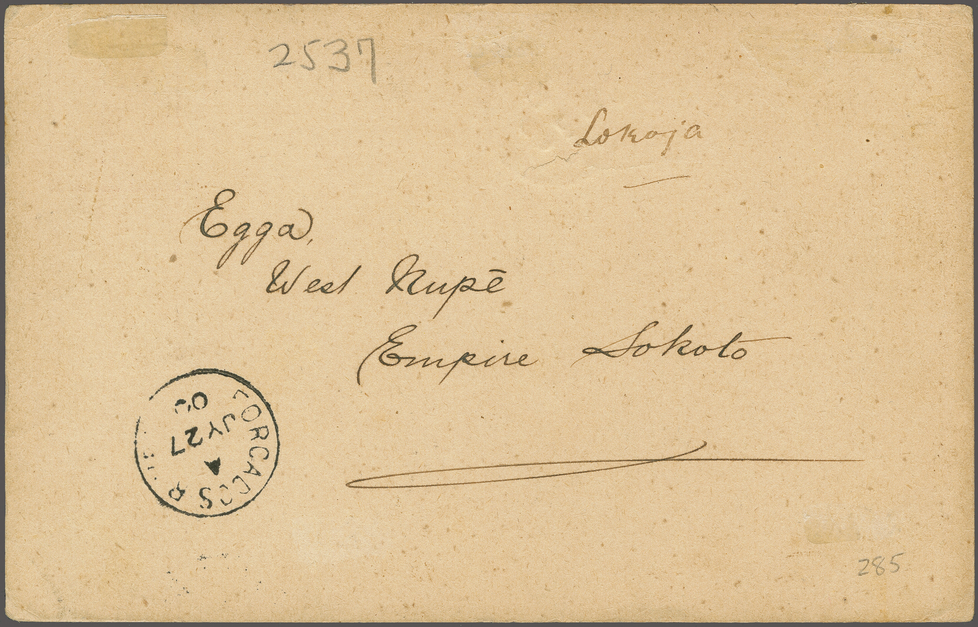 627 cover imageNiger Company Territories 1875: Great Britain ½ d. brown postal card, used from Lokoja to Hammersmith, England, dated 19 July 1900, uprated with GB ½ d. vermilion (SG197) and Norther Nigeria 1 d. dull mauve & carmine (SG2) cancelled by the "LOKOJA / POST OFFICE" violet oval handstamp, with a "PADDINGTON" cds dated 17 August 1900 alongside. To the reverse a "FORCADOS RIVER" circular datestamp 27 July 1900. Light crease to left side and some imperfection, which do not detract (H&G 3). A rare and scarce combination; one of two recorded GB postal items used at Lokoja. Note: The overfranked Great Britain stationery postcard was used after the absorption of Lokoja into the Protectorate of Northern Nigeria. From that period a 1d stamped envelope of Great Britain is known with a Lokoja oval cancellation. That also bears an additional Northern Nigeria 1d stamp and is cancelled by the Lokoja oval dated 11 May 1900. Reference: The Postal Stationery of Nigeria, by Peter Hørlyck, illustrated on pg. 57. (Image 1) (Image 2) (Image 3)