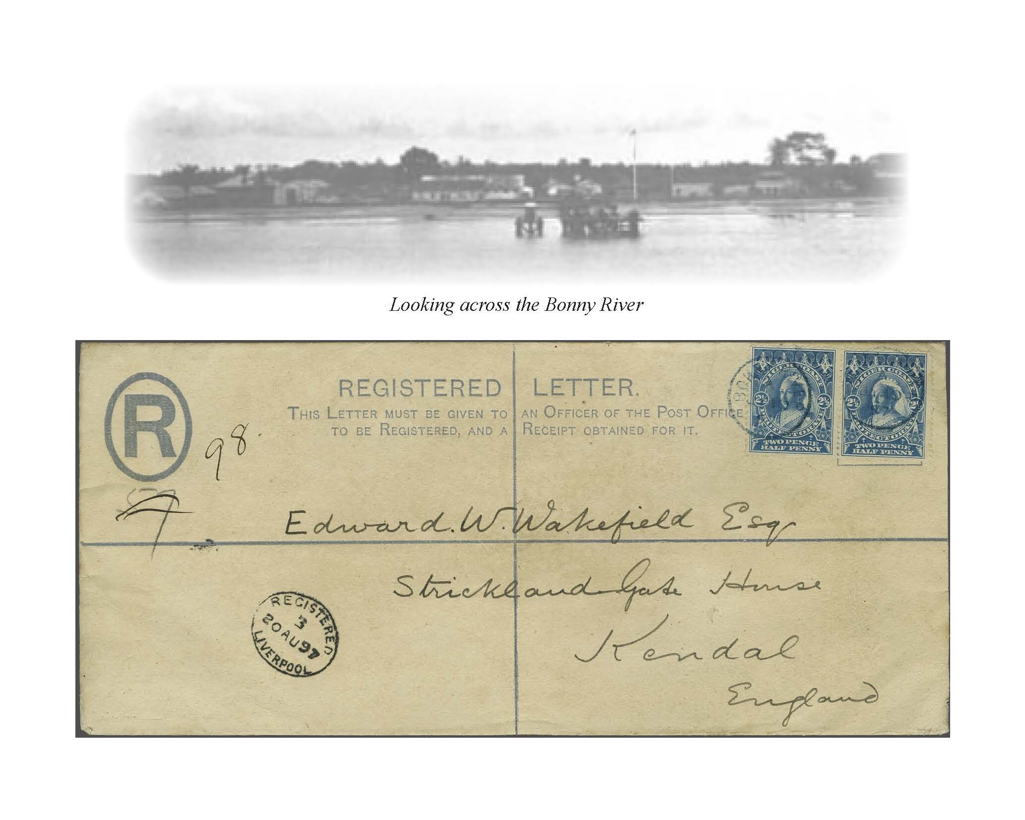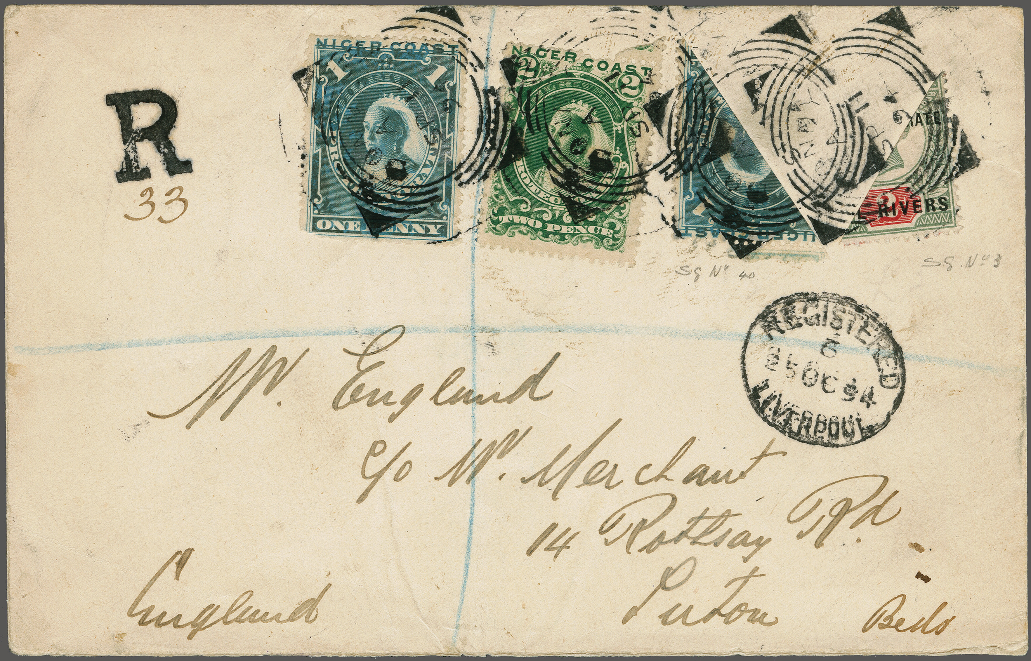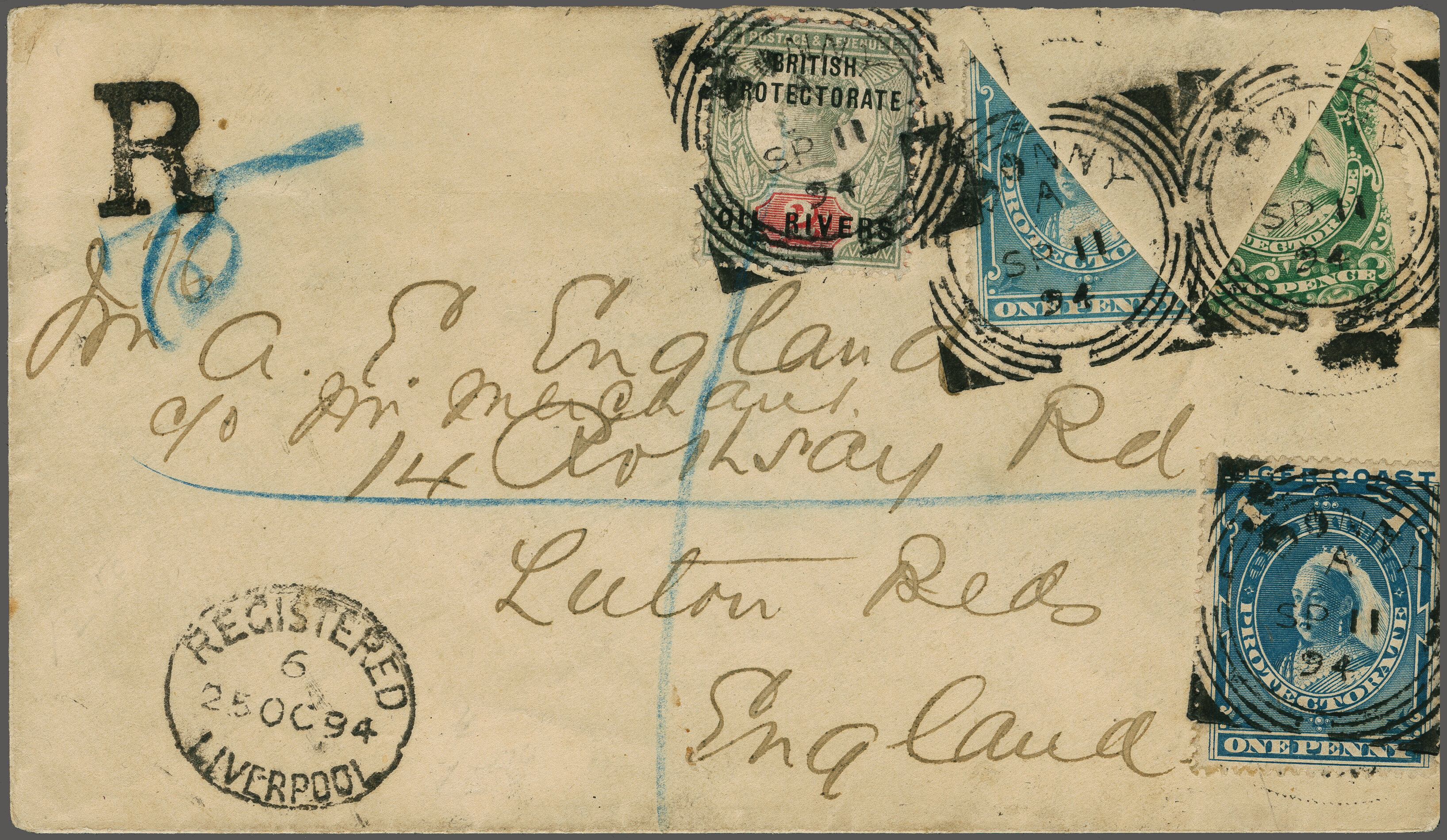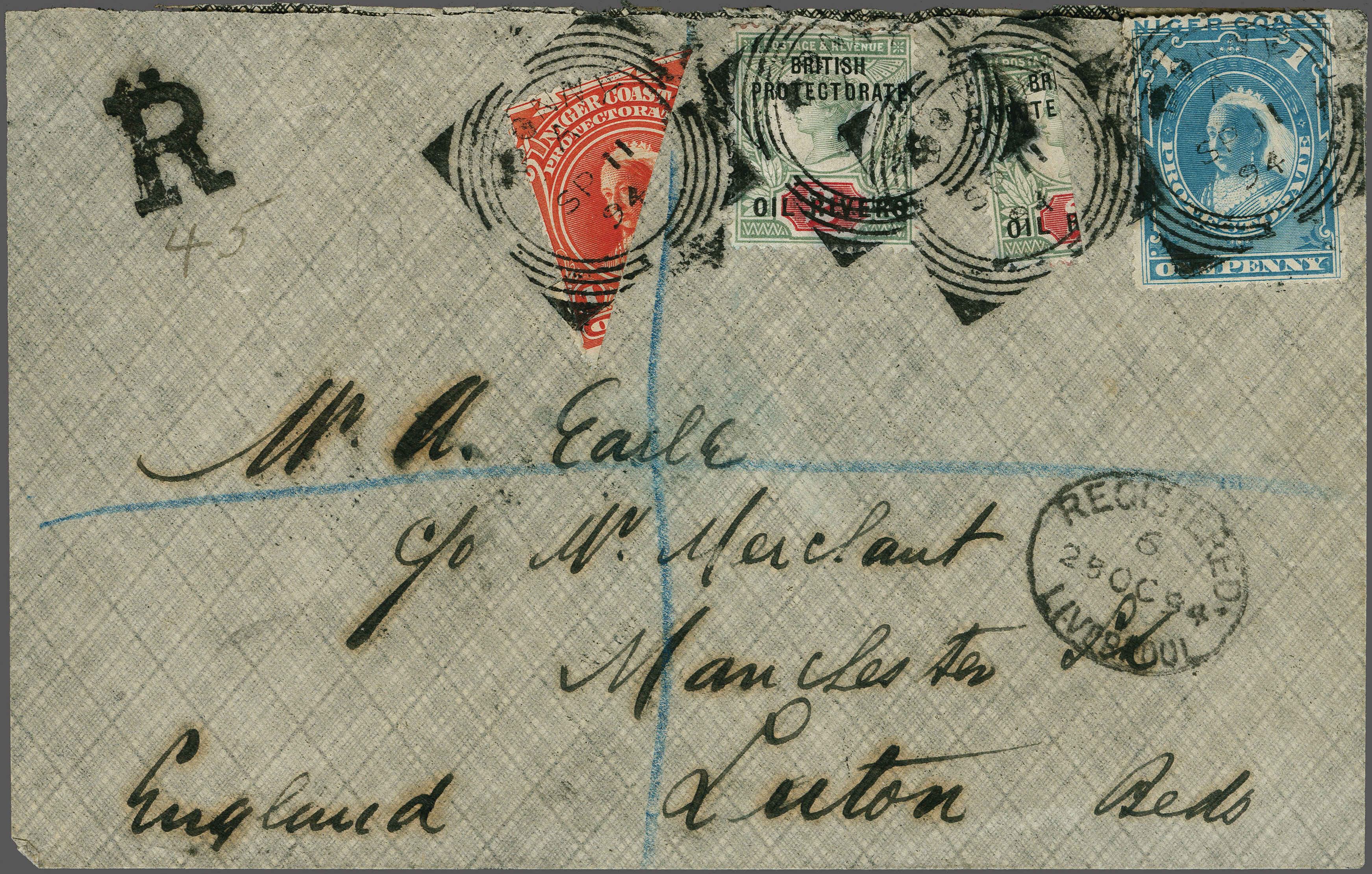 6182 cover image1894 (Sept 11): Registered cover to England franked British Protectorate/Oil Rivers 1892-94 GB ovpt. Jubilee 2d vertical bisect together with normal plus 1894 1d and later 1d orange vermilion diagonal bisect tied by four square Bonny date stamps, small "R" handstamp at left and Liverpool transit (Oct 25) alongside, backstamped "LUTON OC 26 94" on reverse. Provenance: Corinphila sale 309-320, November-December 2023, lot 1197. (Image 1) (Image 2)