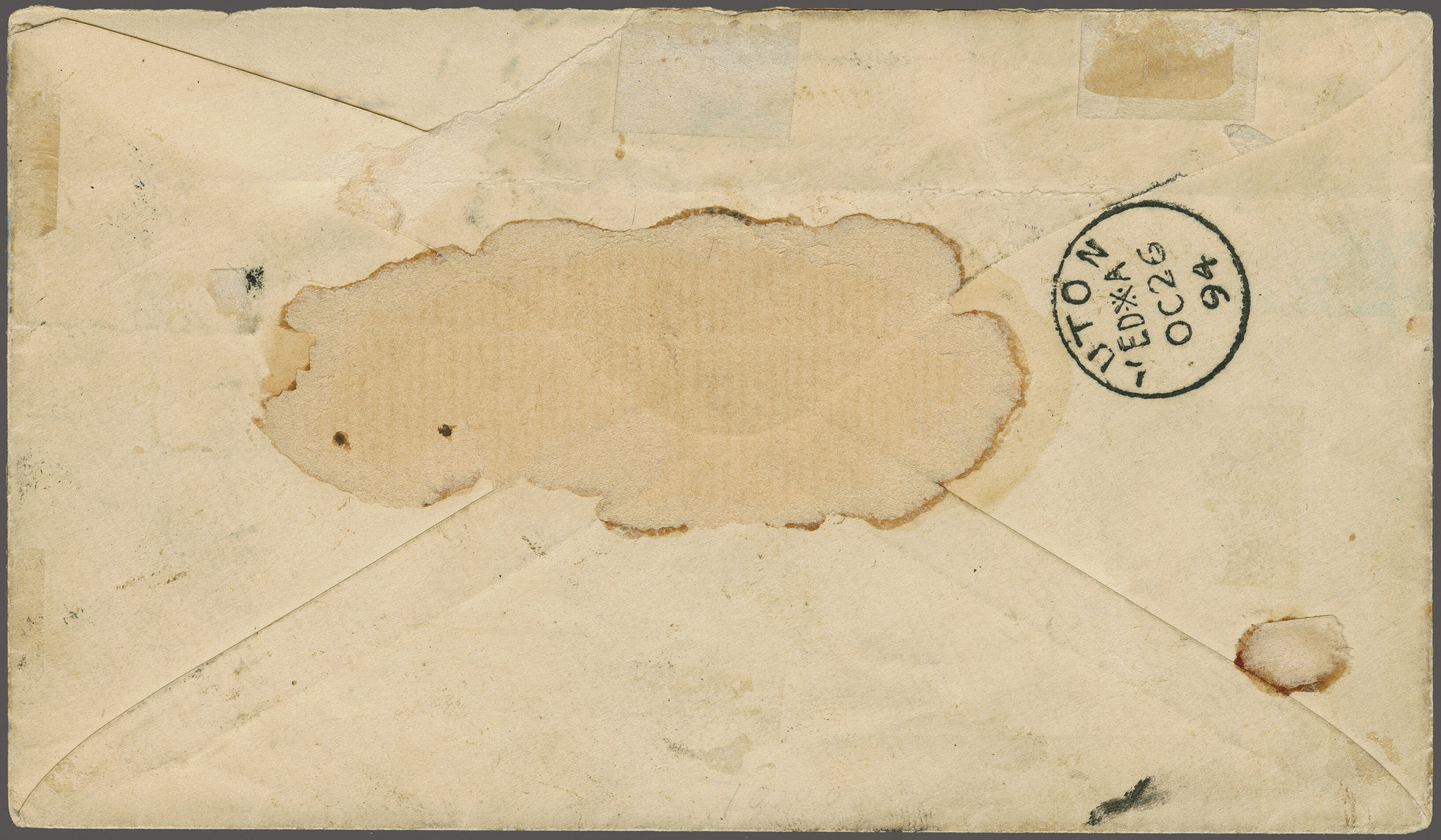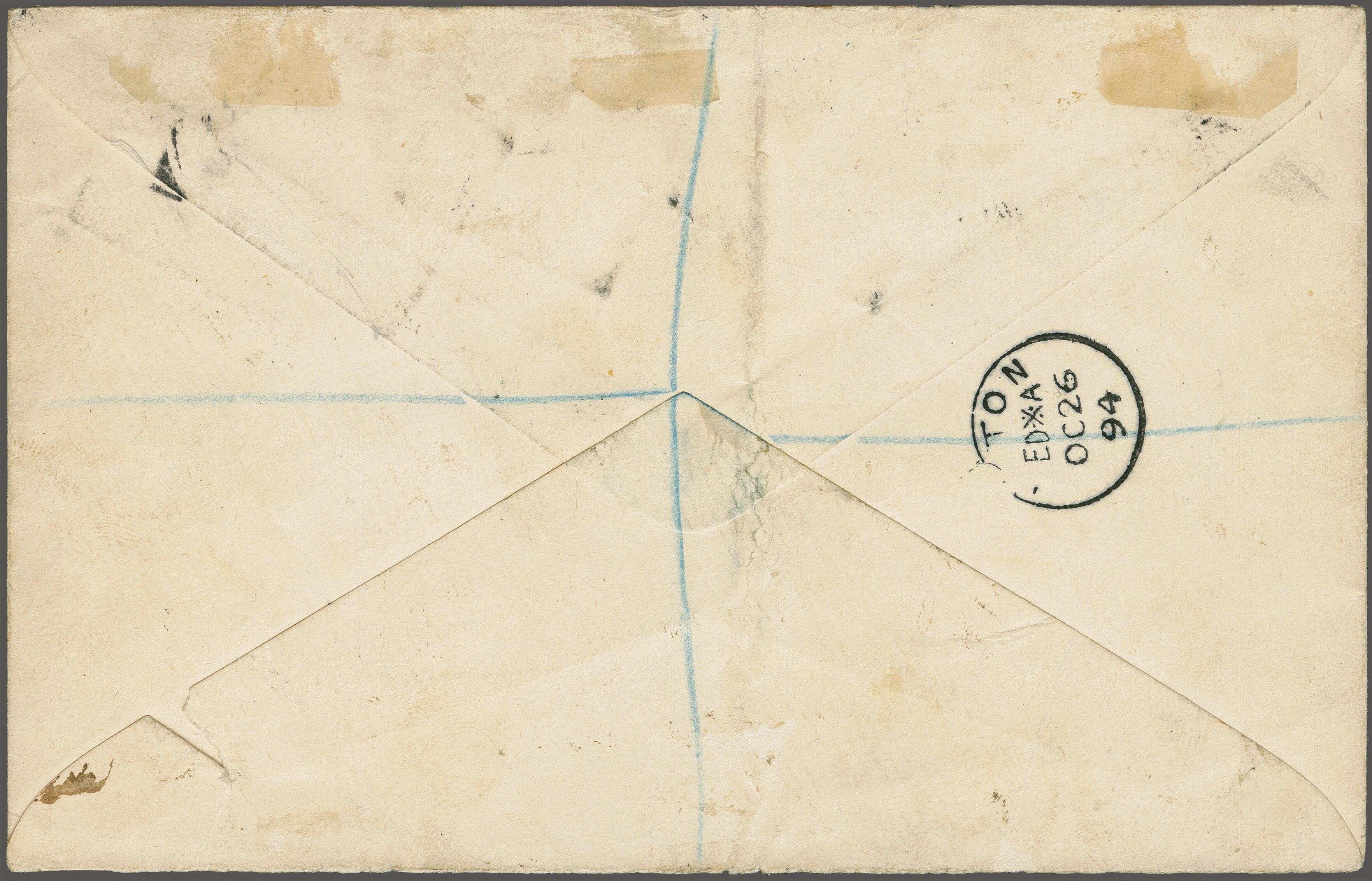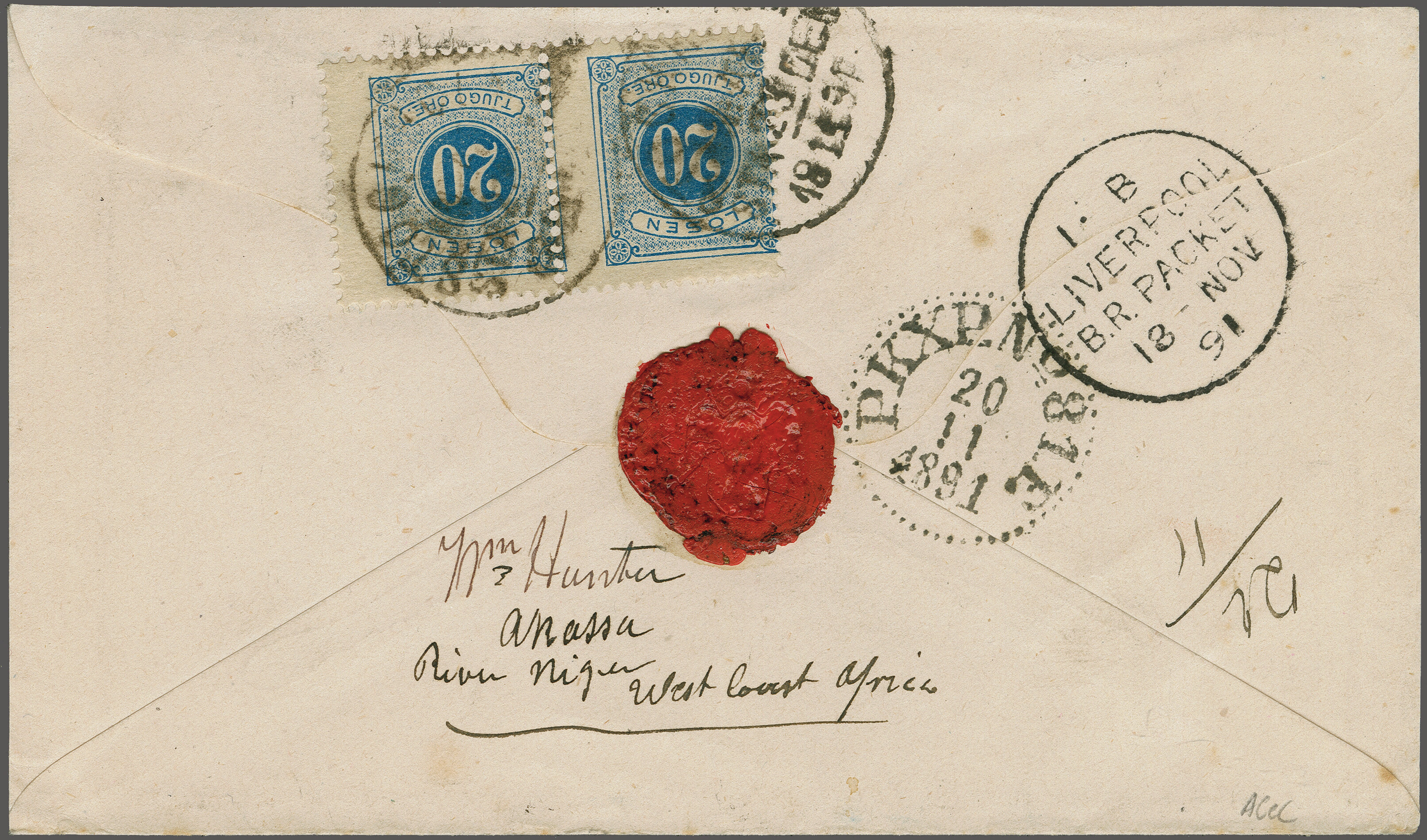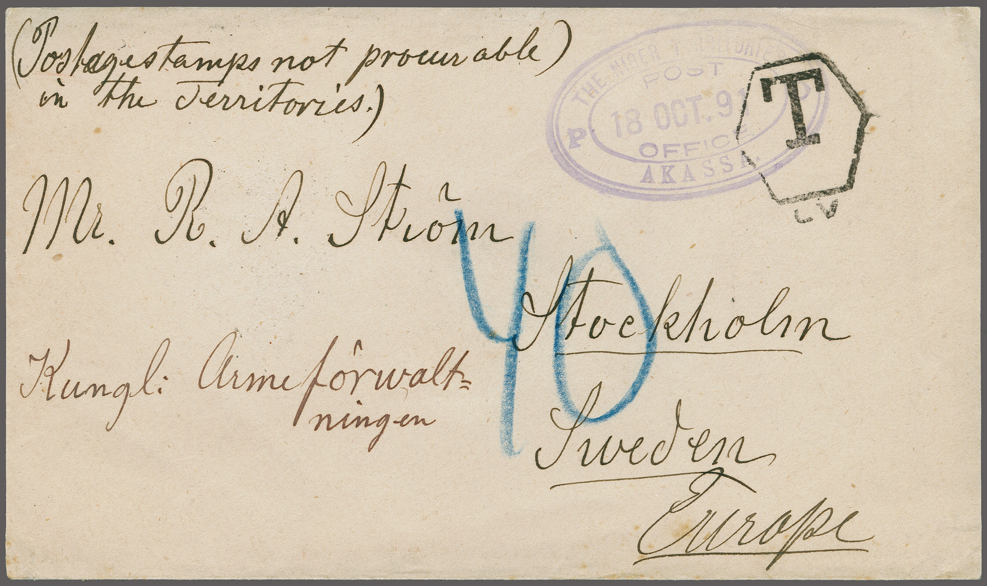 6181 cover imageNiger Coast, 1891 (Oct 8): Stampless envelope to Stockholm, Sweden endorsed in manuscript "Postage stamps not procurable in the Territories" bearing double line violet oval "THE NIGER TERRITORIES / POST / OFFICE/ AKASSA" datestamp, hexagonal framed 'T' applied in transit at Liverpool whose cds (Nov 18) appears on reverse, manuscript "40" in blue crayon on arrival and on reverse pair of 20 ö. postage dues applied and tied by STOCKHOLM cds (Nov 23). A fine cover, opened out for display. Provenance: Corinphila sale 309-320, November-December 2023, lot 1193. (Image 1) (Image 2)