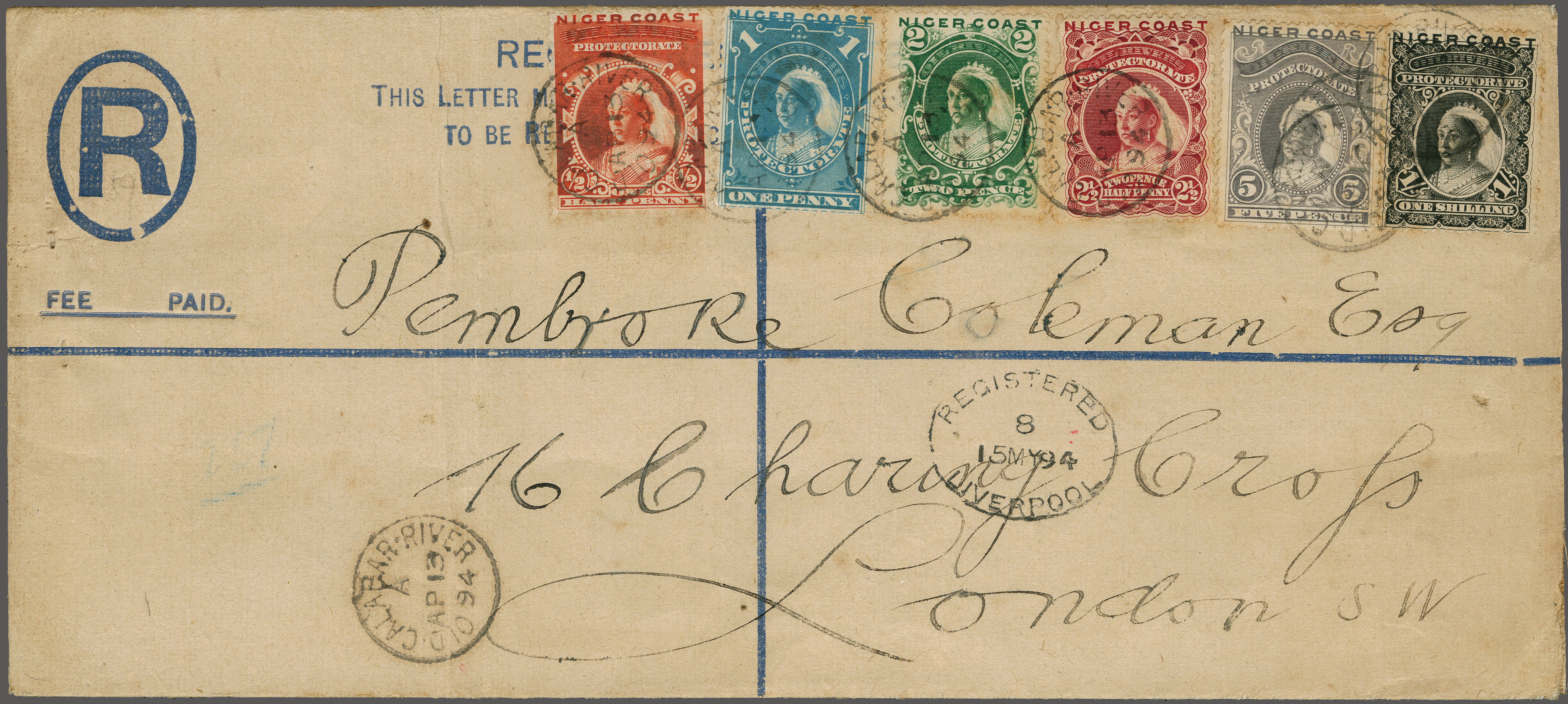 629 cover imageNiger Coast Protectorate 1894 (Jan 1): Oil Rivers obliterated, the complete set of six from ½ d. vermilion to 1 s. black, all used on Oil Rivers 2 d. ultramarine postal stationery registration envelope size H2 (H&G 2b), sent from Old Calabar to London, dated 13 April 1894, all tied by "Old Calabar River" datestamps in black. 'Registered / Liverpool' transit on front (15 May) and London arrival on reverse (16 May) Fine and attractive cover. (Image 1) (Image 2)