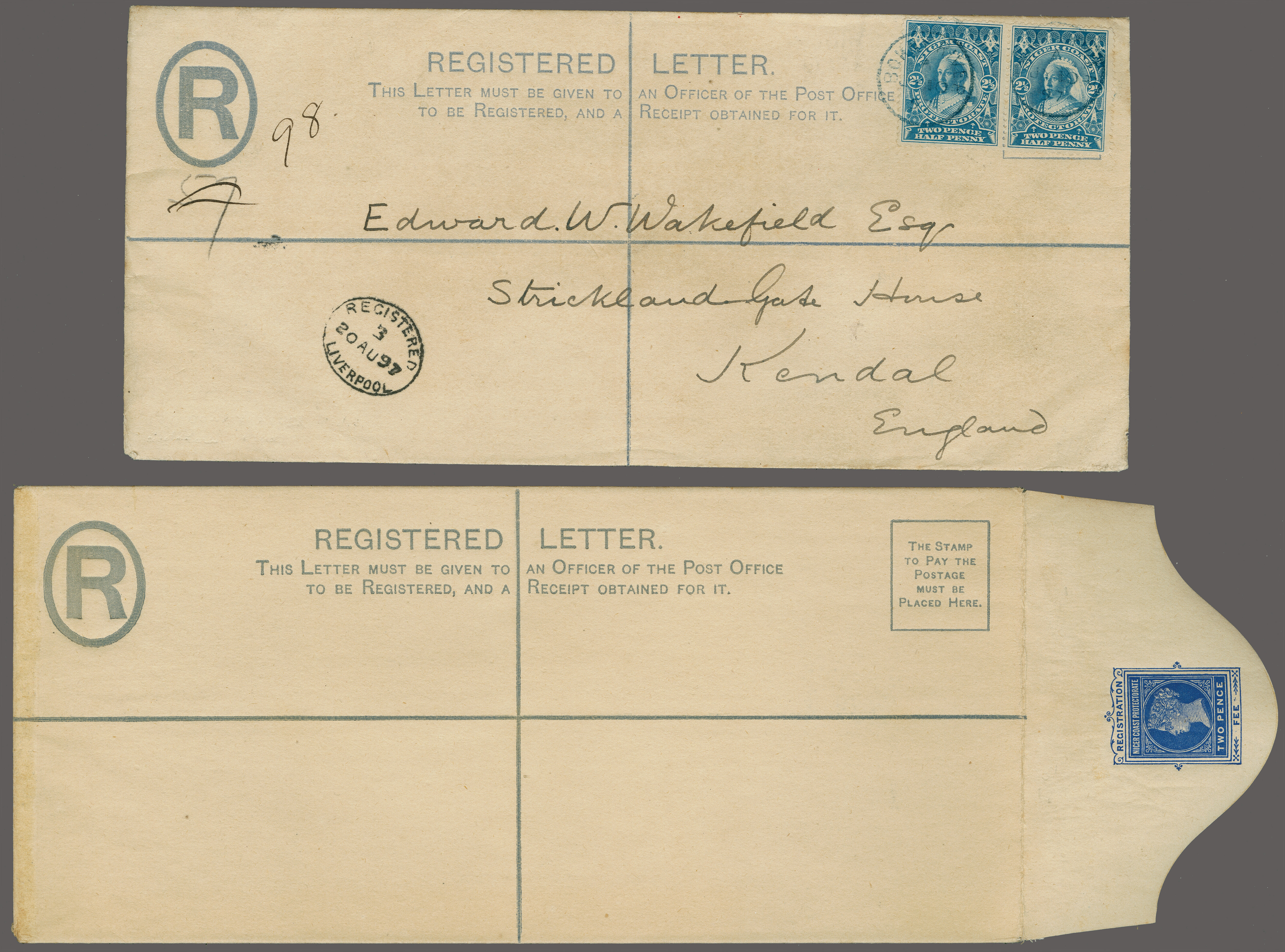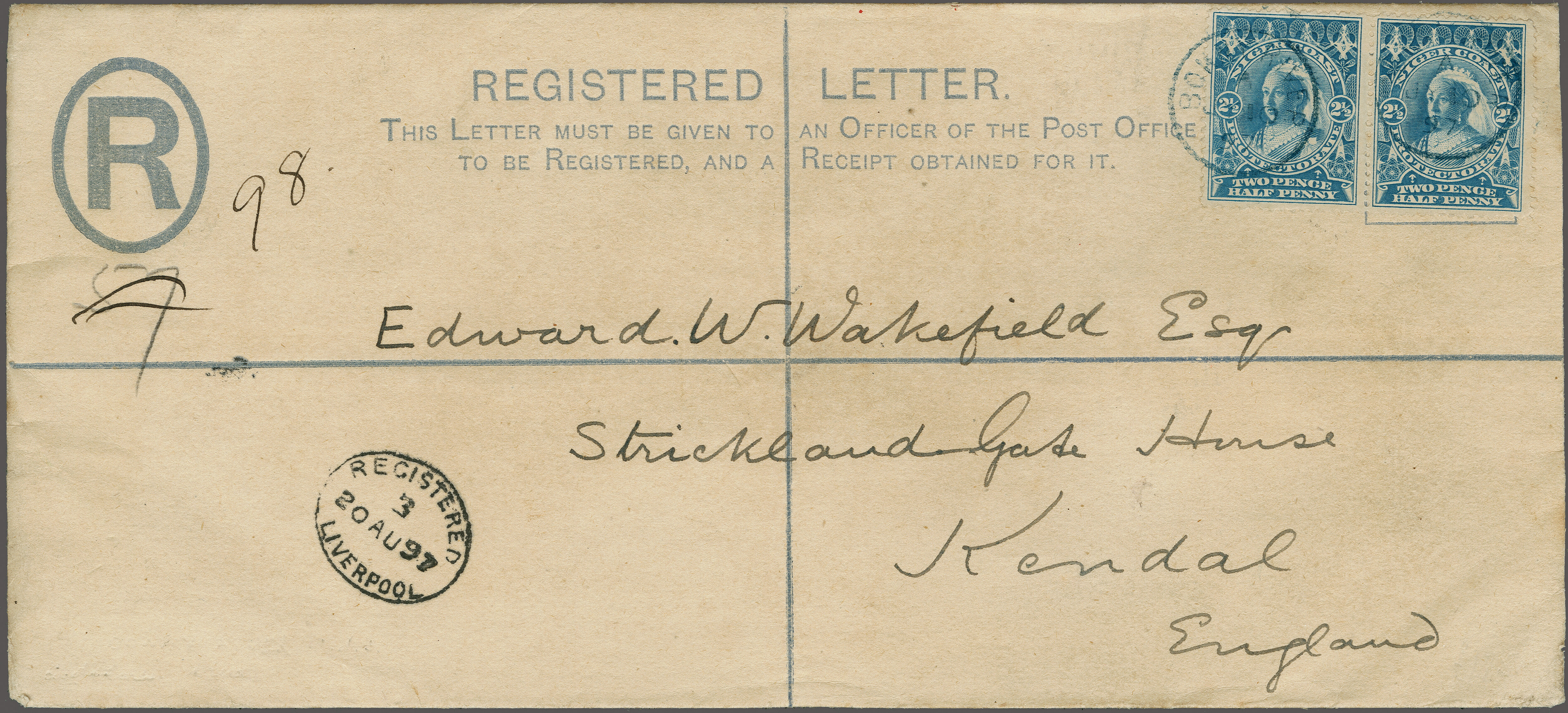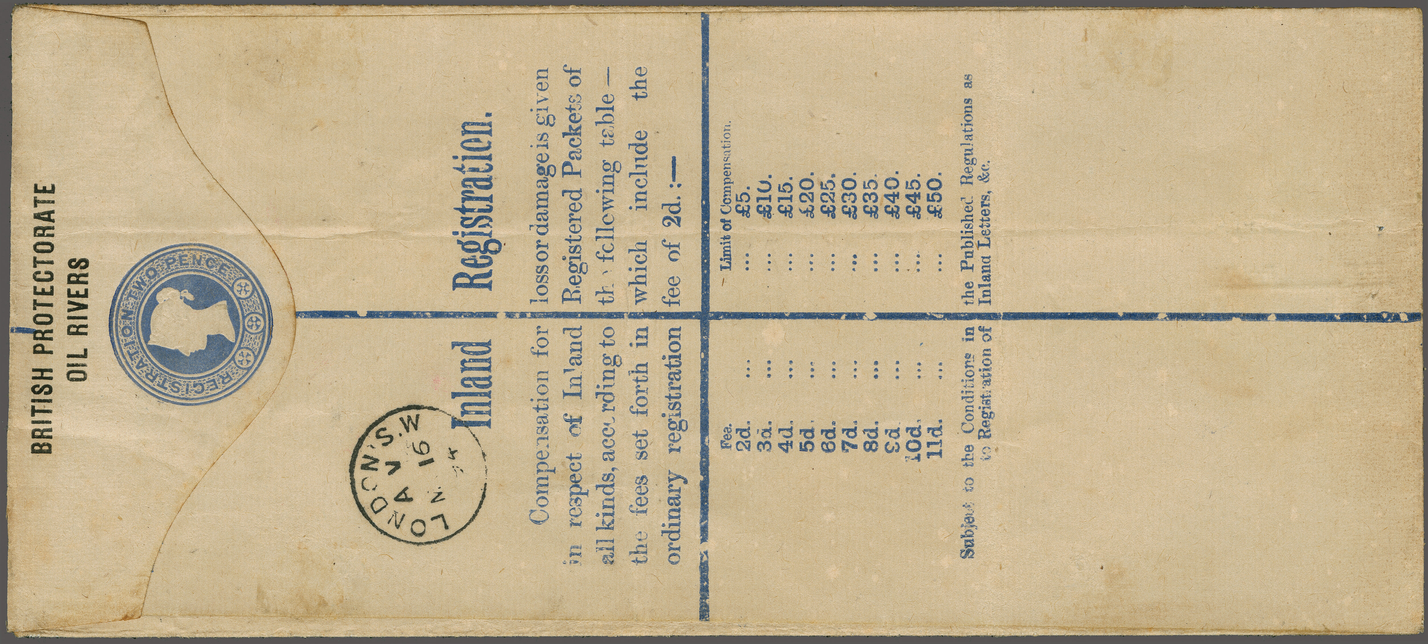 630 cover imageNiger Coast Protectorate 1884 (May): 2½ d. blue horizonzal pair, used on an 1897: 2 d. ultramarine postal stationery registered envelope, size H2 (H&G 5a), from Bonny River to Kendal, England, dated 10 July 1897, tied by the "Bonny River" circular datestamp in blue, with a "Registered Liverpool" oval in black (20 AU 97). To the back a "Kendal" arrival cds in black (AU 20 97). A fine and scarce example. Comes with an unused example of the same envelope. Note: With the exception of the size G envelopes, these registered envelopes, with the redesigned imprint, are difficult to find in any condition. Reference: 'The Postal Stationery of Nigeria', by Peter Hørlyck, pg. 53.& 54. (Image 1) (Image 2) (Image 3)