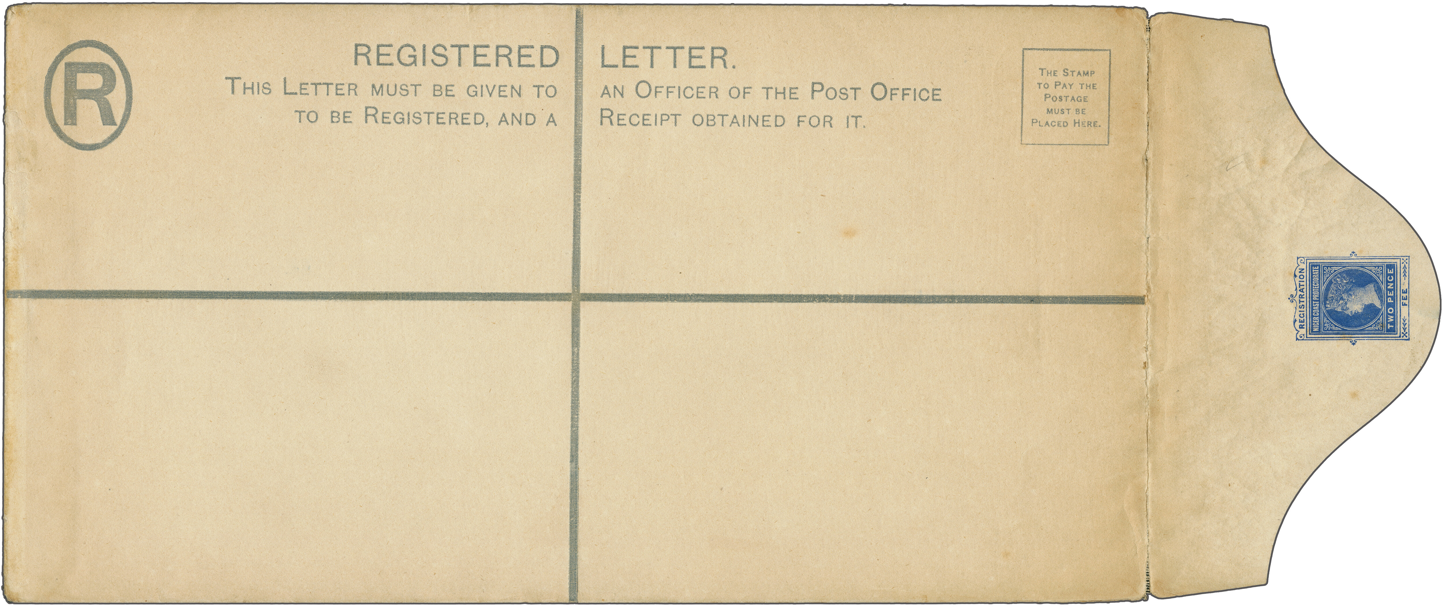 631 cover imageNiger Coast Protectorate 1897: 2 d. ultramarine postal stationery registered envelope, size K (H&G 5b), unused with a fresh and fine appearance. A rare example. Note: With the exception of the size G envelopes, these registered envelopes, with the redesigned imprint, are difficult to find in any condition. The size K took the author of 'The Postal Stationery of Nigeria' 30 years of collecting before he mnaged to acquire the size K in mint or genuinely used condition. Reference: 'The Postal Stationery of Nigeria', by Peter Hørlyck, illustrated on pg. 53. (Image 1) (Image 2)