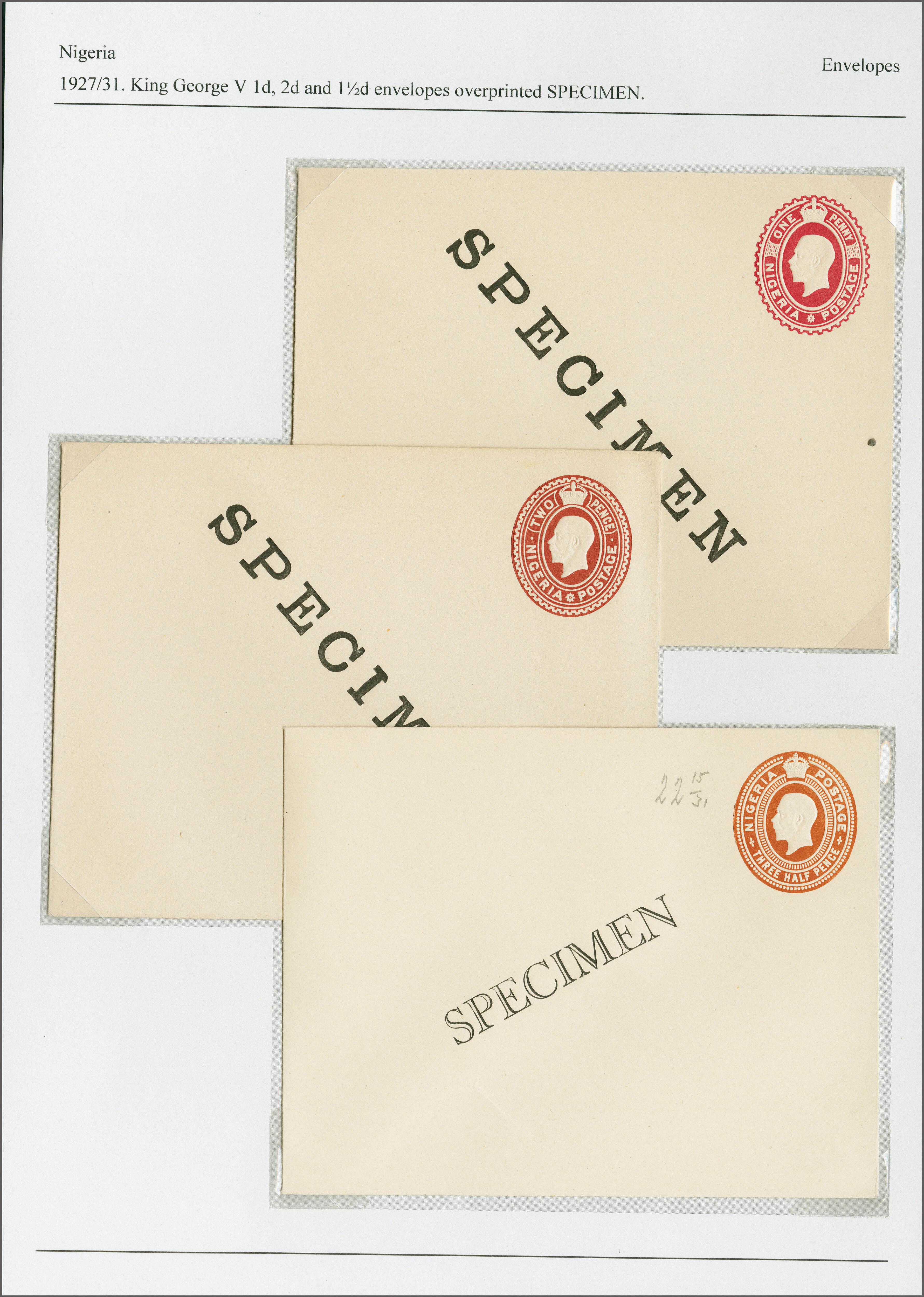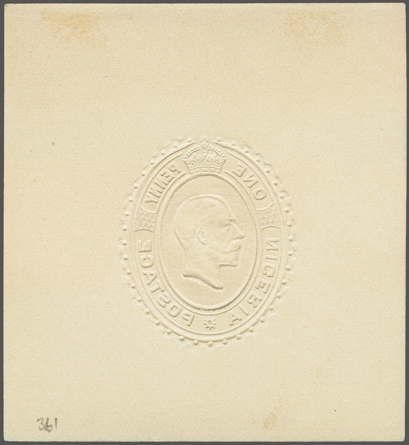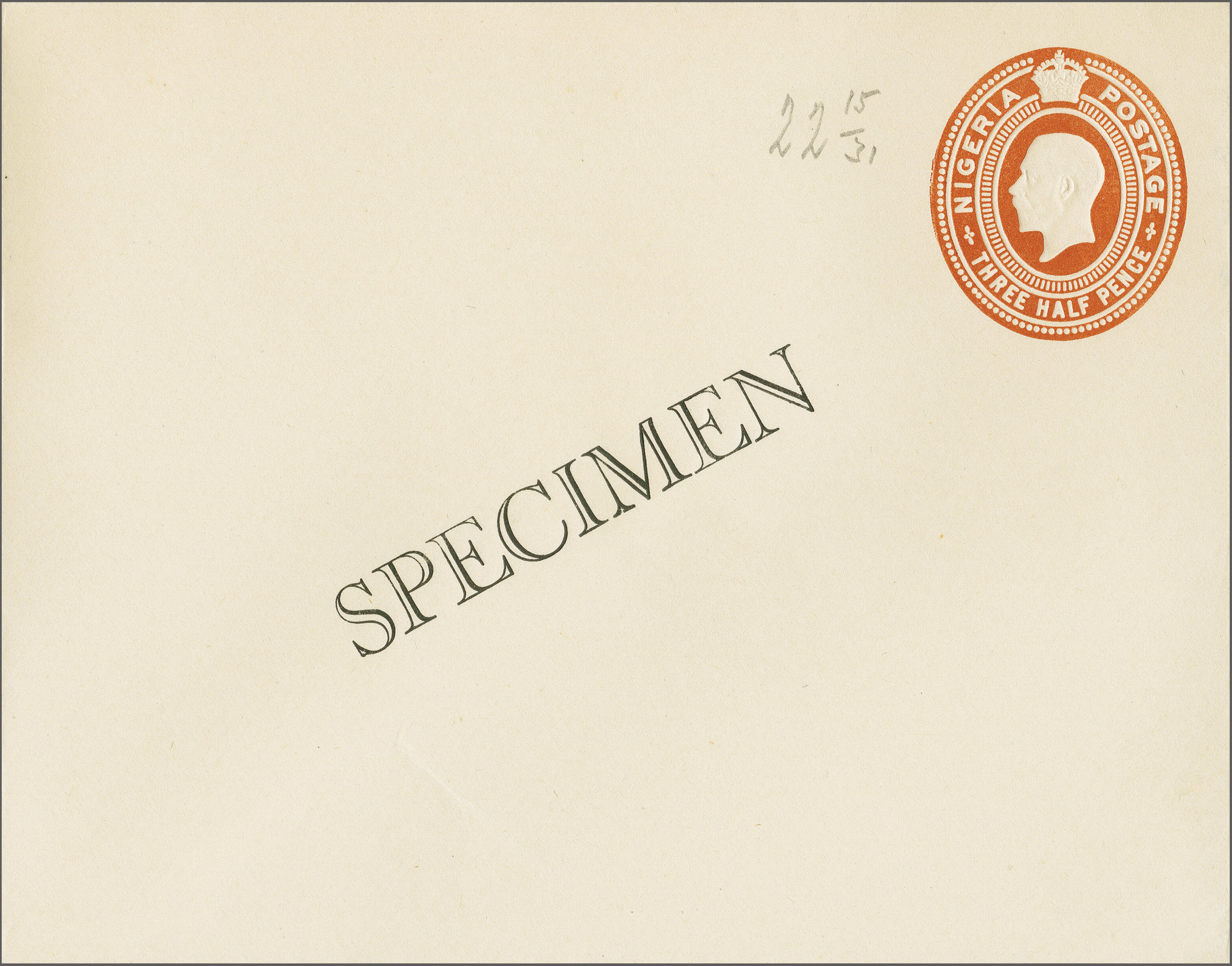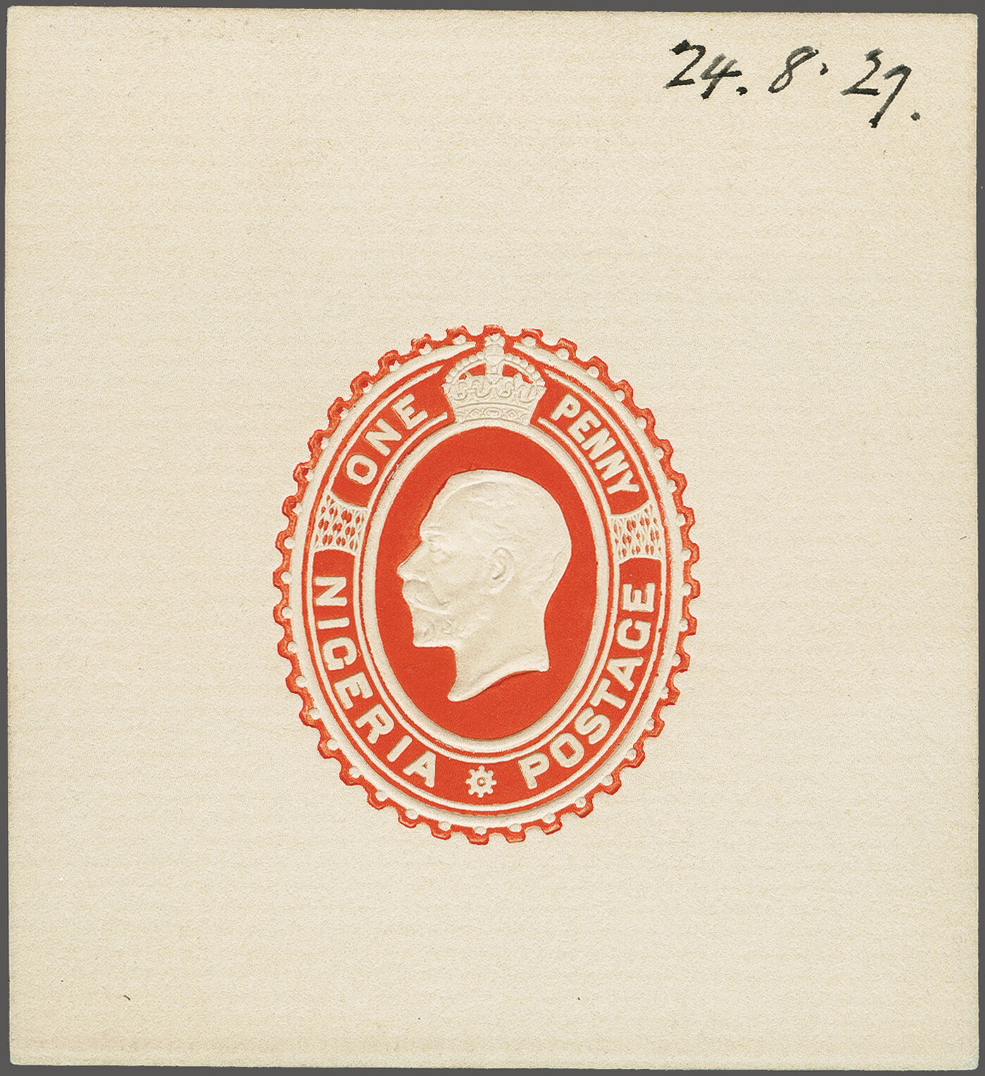 633 (*) image1927: Stationery Envelope, 1 d. Die Proof in vermilion on laid paper, dated "24.8.27", sized 59 x 64 mm. Very fine and scarce (H&G B1 proof). Reference: The Postal Stationery of Nigeria, by Peter Hørlyck, illustrated pg. 387 Provenance: Robson Lowe, 22 January 1990, lot 361. (Image 1) (Image 2)