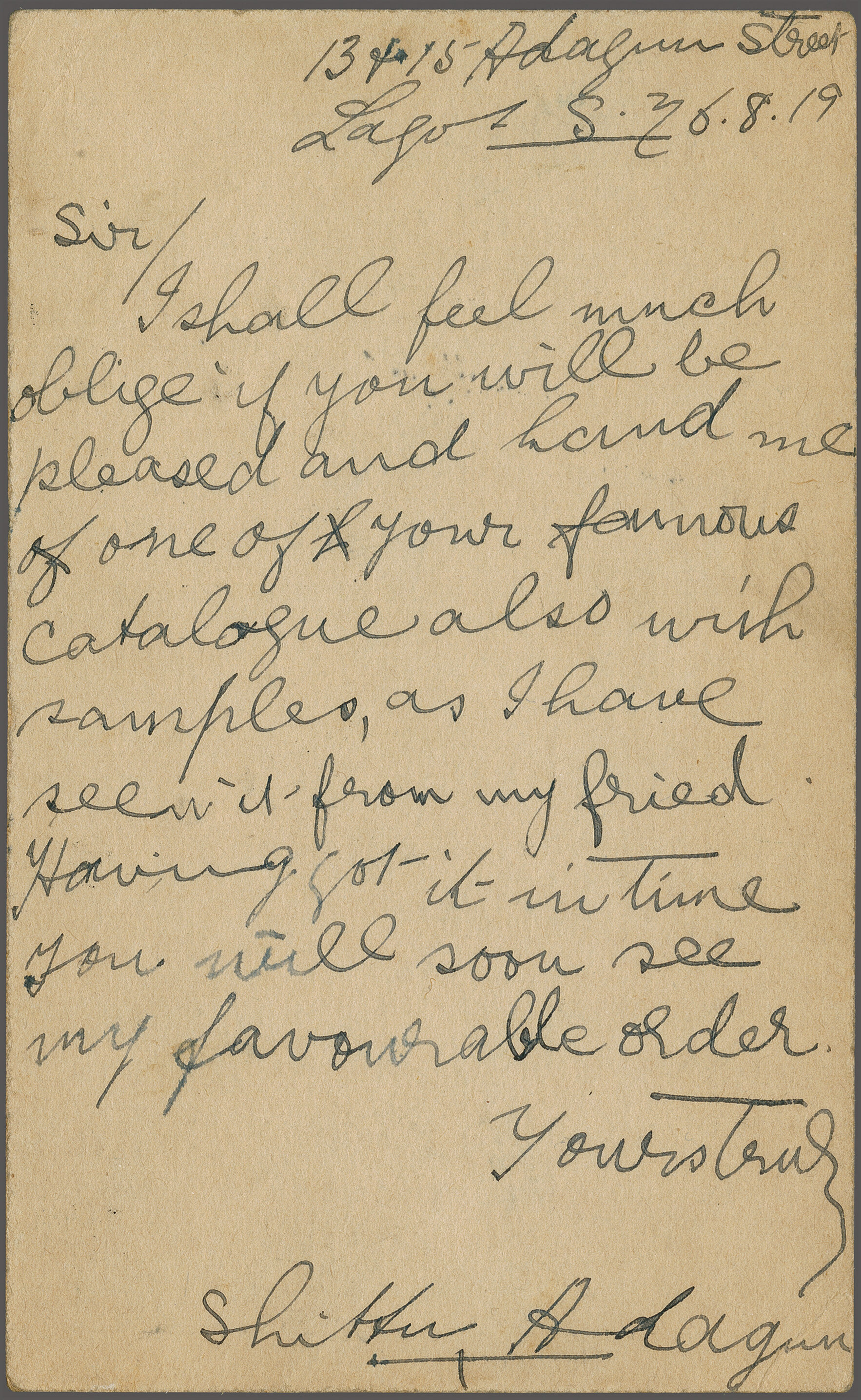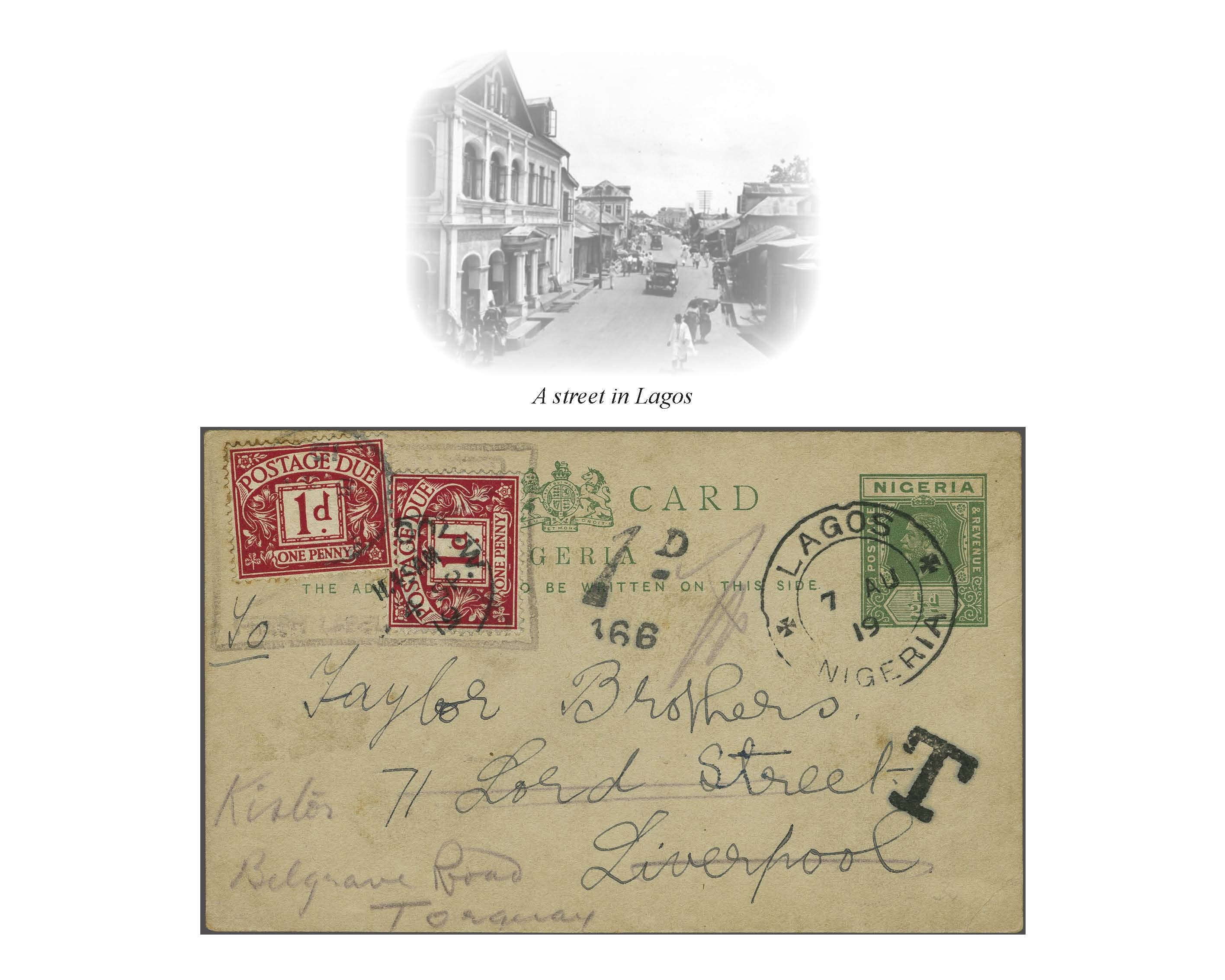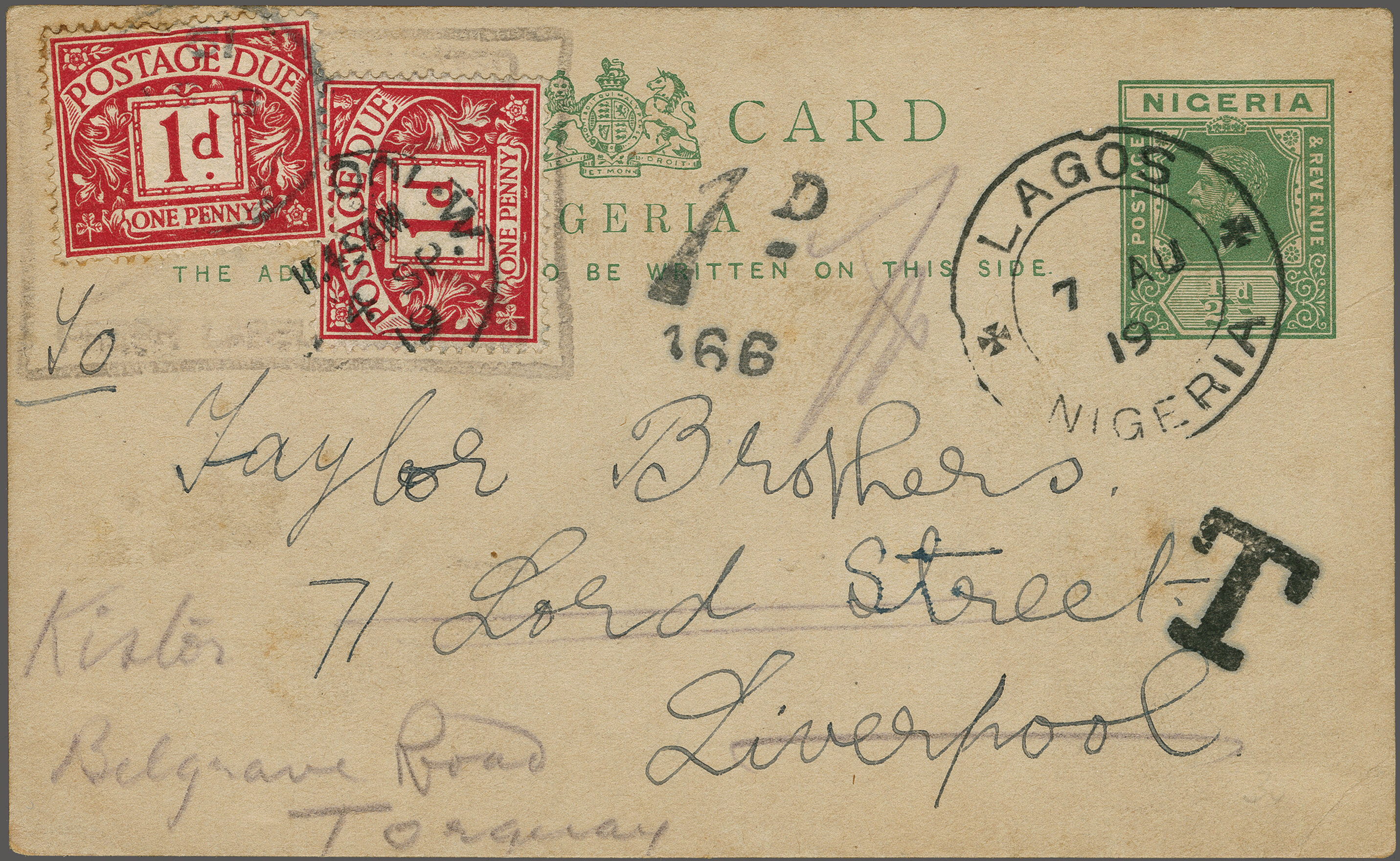 632 cover image1914: Postal Card, ½ d. green, used, Lagos to Liverpool, dated 7 August 1919, cancelled by "LAGOS NIGERIA" double circle in black, with a postage due "T" mark and Liverpool postage due mark "1D / 166." alongside. On arrival redirected to Torquay. Two GB postage due 1 d. red affixed and cancelled by an indistinct cds. To the reverse a long message. Fault top and small corner bend. Otherwise fine and rare example; one of seven known used (H&G 1). Reference: The Postal Stationery of Nigeria, by Peter Hørlyck, pg. 424. (Image 1) (Image 2) (Image 3)