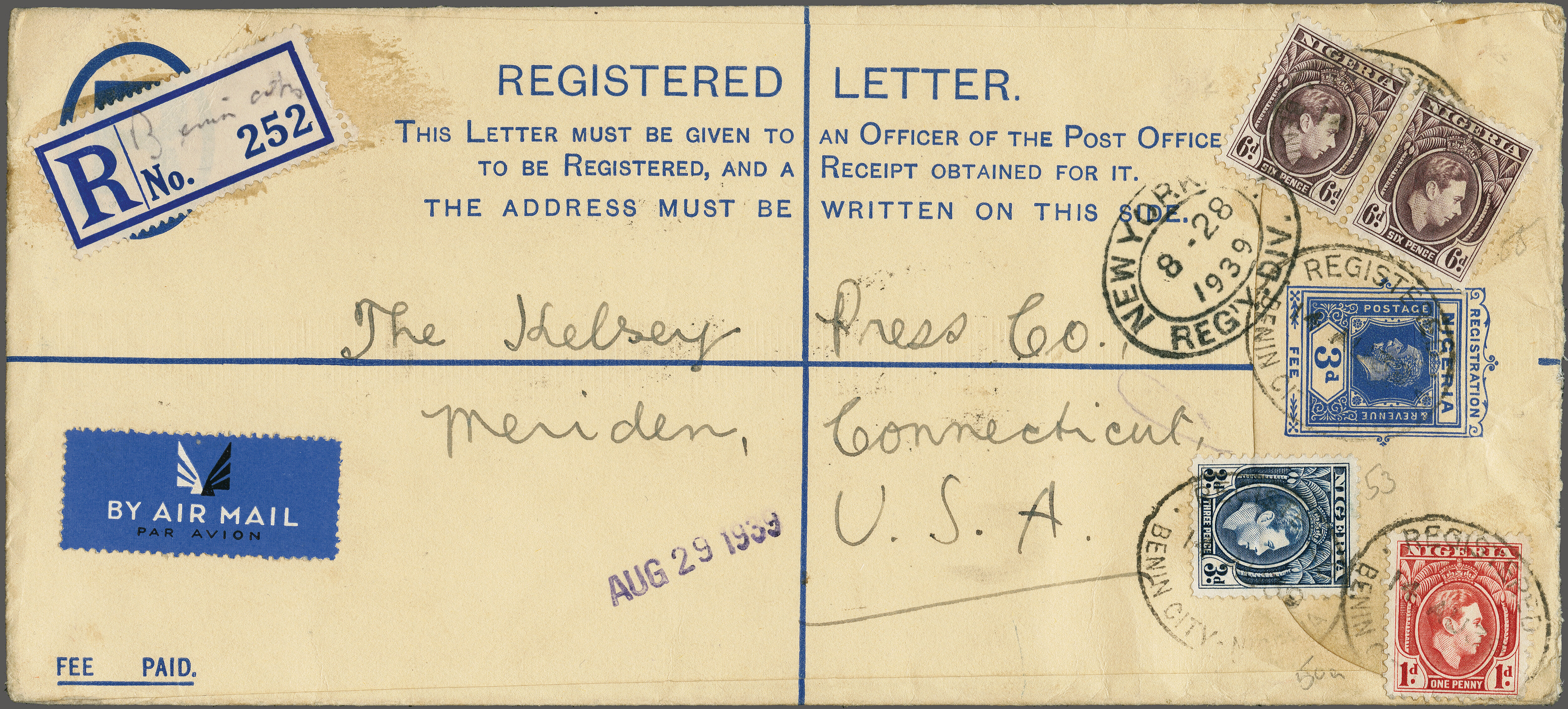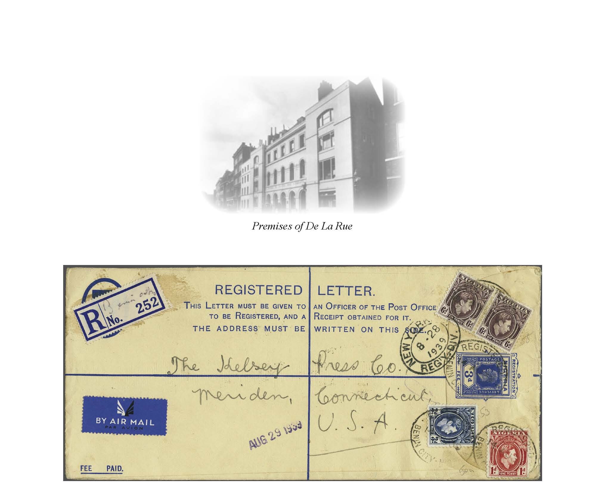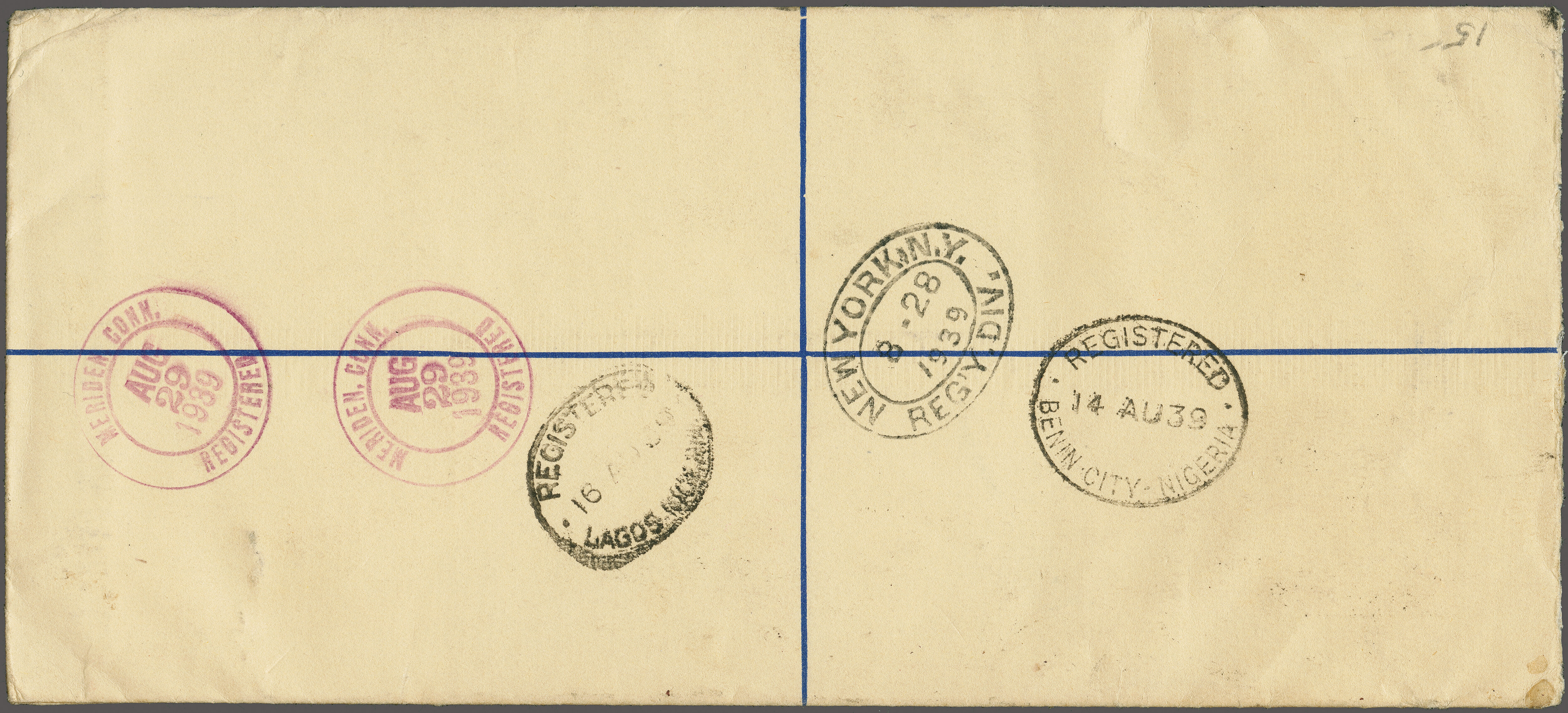 635 cover image1935: King George V 3 d. blue registered stationery envelope, size H2, imprint "THOS. DE LA RUE & CO. PATENT." (not recorded in H&G), uprated with with King George VI 1938 1 d. rose red, 3 d. blue and a pair of 6 d. blackish purple, sent from Benin to Meriden, USA, dated 14 August 1939, cancelled by Benin registered oval in black with a New York registered arrival alongside (28 August 1939). To the reverse a transit Lagos registered in black (16 August) and an arrival Meriden registered in purple (29 August 1939). Rare. No mint and only three used examples are recorded with this imprint. Note: The more common imprint "THOS. DE LA RUE & CO. LTD. PATENT." with letters of unequal height was replaced towards the end of the lifespan of this registered stationery (H&G C2a). (Image 1) (Image 2) (Image 3)