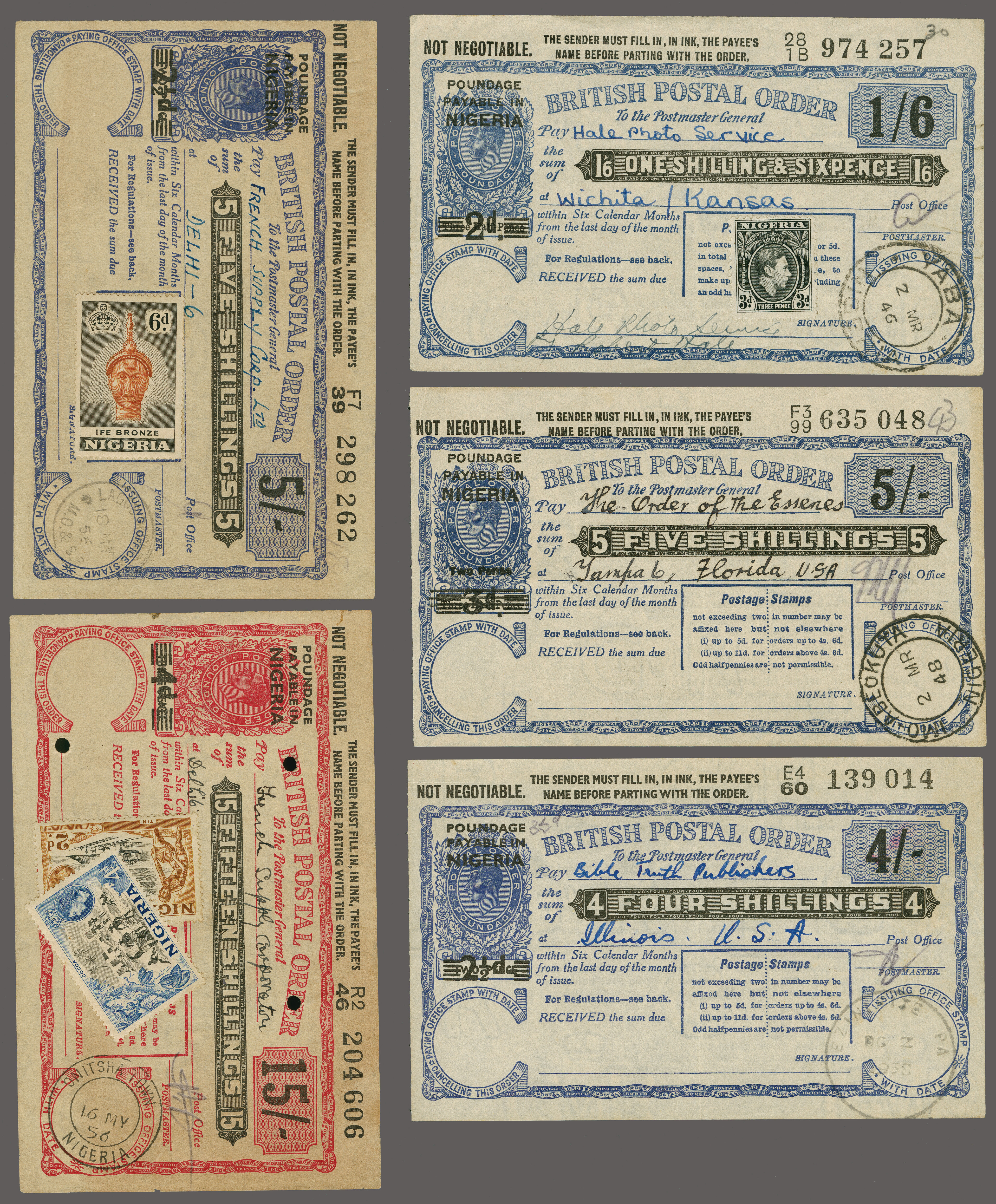 637 imagePostal Orders: 1948-1956 Group of five King George VI British Postal Orders overprinted for use in Nigeria. Includes 1 s. 6 d. blue with overprint type T3T 2d. over 1½ d. poundage issued at Yaba 2 March 1946 with 3 d. stamp affixed increasing the value to 1 s. 9 d. (only recorded example).; 5 s. blue overprint type T3T 3 d. original poundage 1½ d. issued at IMO ABEOKUTA 2 March 1948. Also 4 s. with 2½ d. over 2 d. issued at Ezinifite 2 October 1958 and 5 s. with 2½ d. over 2 d. with additional 6 d. stamp increasing value to 5 s. 6 d., issued at Lagos 18 May 1956. Lastly, 15 s. red overprinted 4 d. on 3 d. with additional stamps of 2 d. & 4 d. (total 15 s. 6 d.) issued at Onitsha 16 May 1956 with punch holes. Some minor faults as is expected, otherwise a fine and rare selection. According to Gledhill there are only 52 surviving British postal orders used in Nigeria (5). Reference: The Postal Stationery of Nigeria, by Peter Hørlyck, illustrated on pg. 197 & 198 (first two examples). (Image 1) (Image 2)