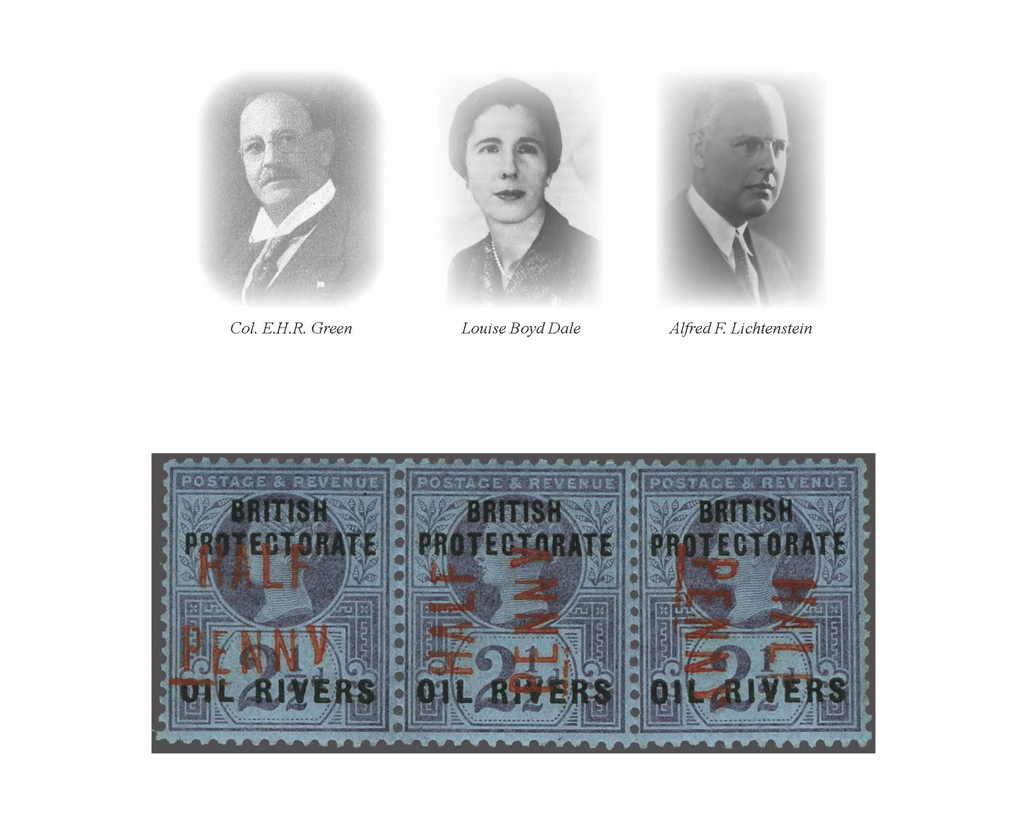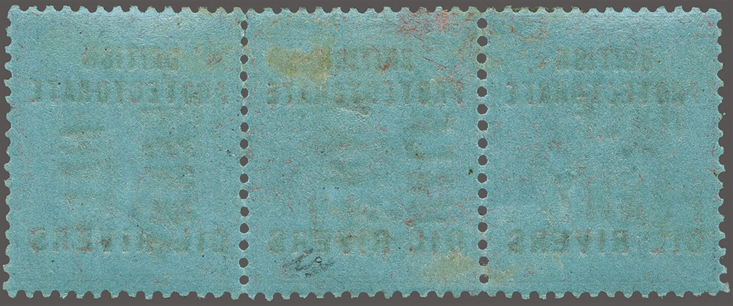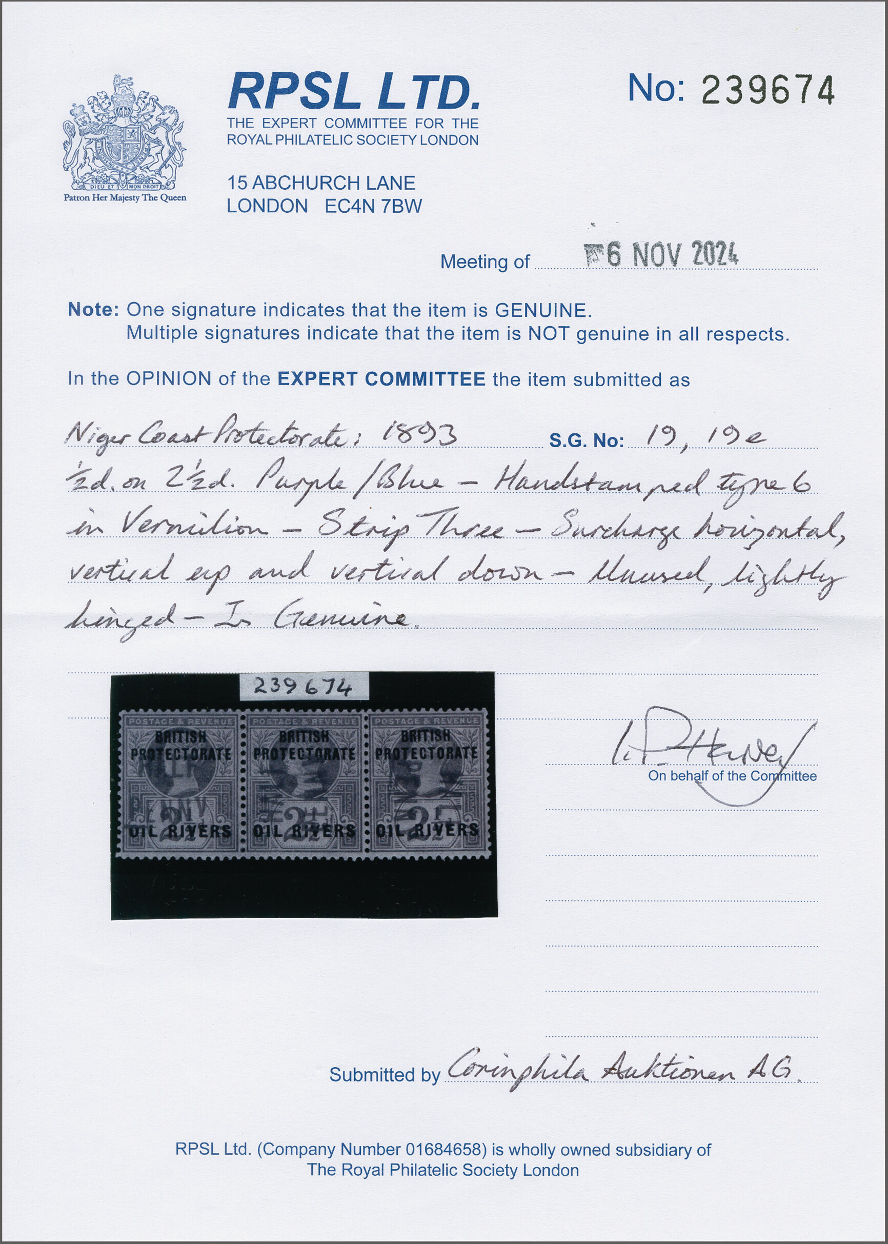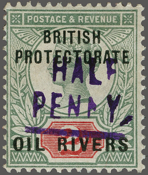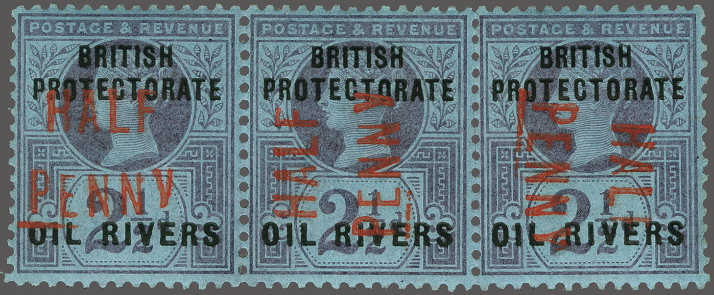 1445 **/* image1893 (Dec): Oil Rivers ½ d. on 2½ purple on blue, handstamped HALF / PENNY" in vermilion, an unused strip of three with first stamp showing horizontal surcharge, second stamp variety: "Surcharge Vertical Reading Up", third stamp variety "Surcharge Vertical Reading Down"; of wonderful fresh colour and appearance, lightest of pink paper specks from storage, large part og. A magnificent multiple of considerable rarity. Cert. RPSL (2024) Gi = £ 26'650+. Provenance: Collection Col. E.H.R. Green, Part XVII, Harmer Rooke, New York, 13-18 Nov 1944, lot 1089; Collection Louise Boyd Dale & Alfred F. Lichtenstein, Sale 18, Harmers, New York, 14 March 1991, lot 163. (Image 1) (Image 2) (Image 3) (Image 4)