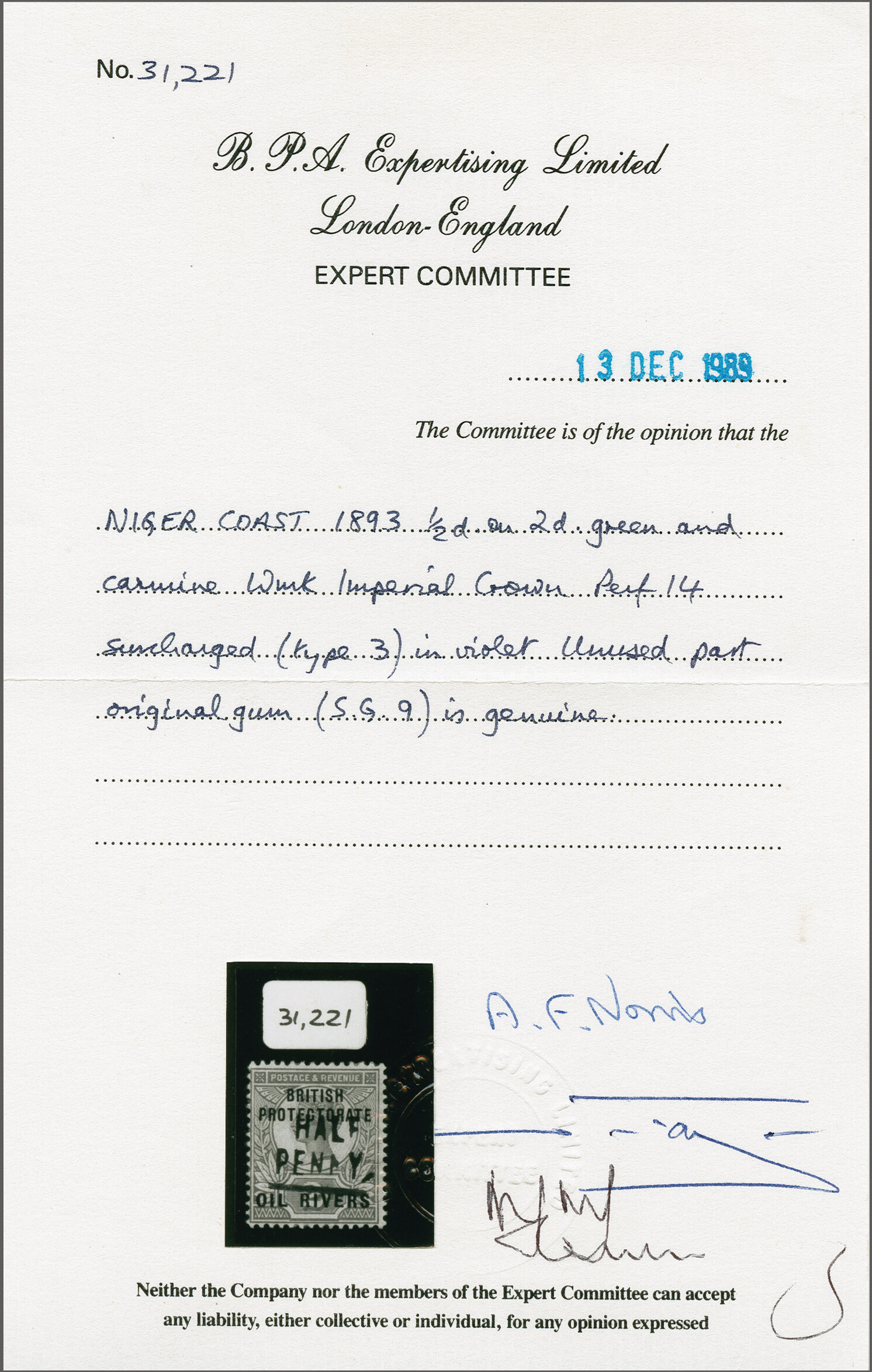 1444 * imageNiger Coast Protectorate 1893 (Dec): Issued at Old Calabar ½ d. in violet on 2 d. green & carmine, a fine unused example of fresh colour, usual slight pink paper reminder on large part og. A scarce stamp. Cert. BPA (1989) Gi = £ 600. (Image 1) (Image 2) (Image 3)