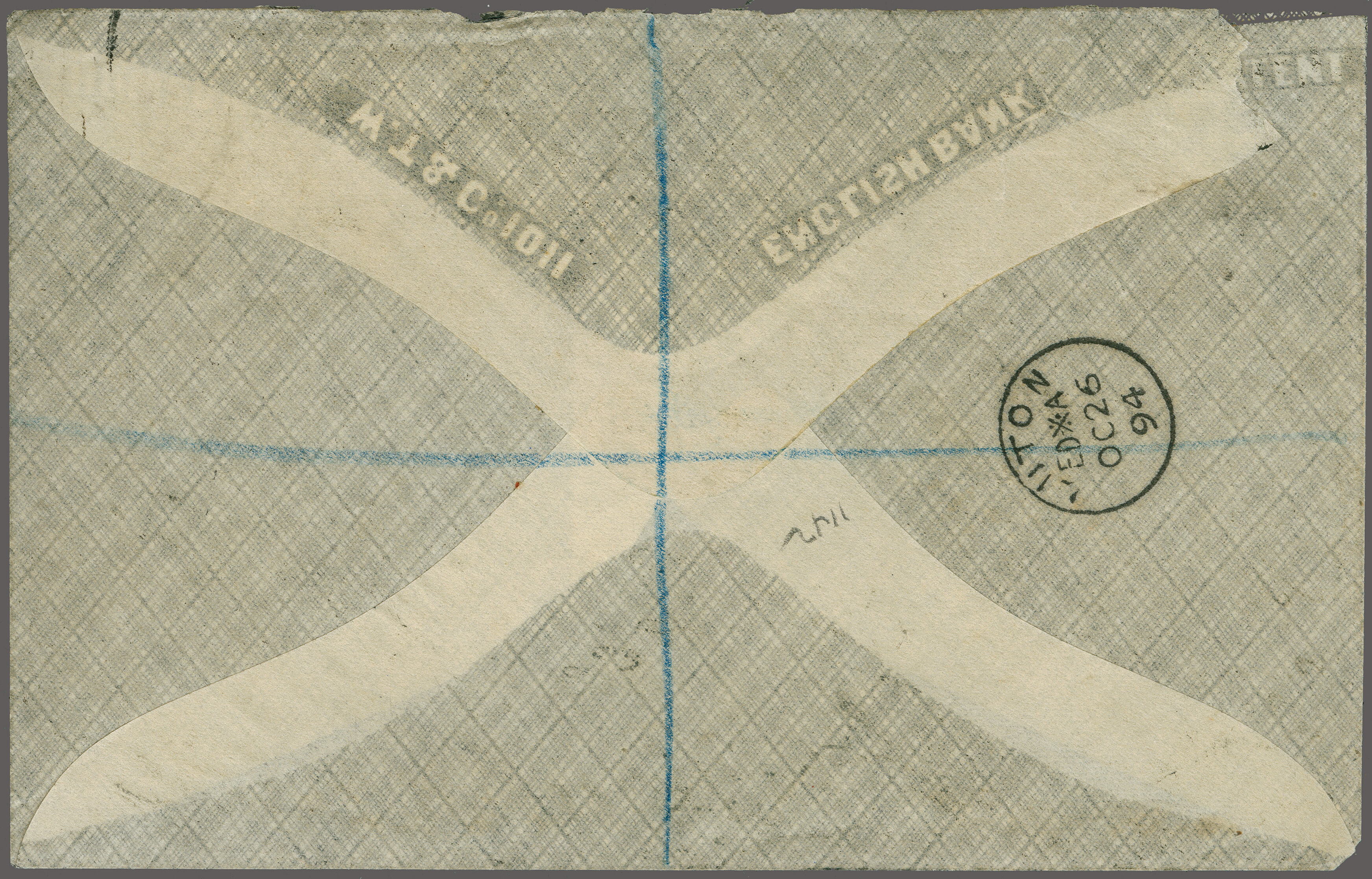 626 cover imageNiger Coast Protectorate Oil Rivers 1892 (July 20): 2 d. grey-green & carmine bisected diagonally, in combination with a single and bisected diaginally 1894 1 d. pale-blue and a 2 d. green, used on a registered cover from Bonny to Luton, England, dated 11 September 1894, tied by the squared circle cancel of "BONNY" in black, with a "Registered / Liverpool" oval alongside dated 25 October 1894. A "R" handstamp applied to the top right. To the reverse an arrival "Luton" cds dated 26 October 1894. Oxidation to the 1 d. stamps, a vertical crease between 1 d. and 2 d. (just touching the right hand perfs. of the 1 d.), some other wrinkles, otherwise fine and a scarce combination Gi = £ 2'750+. (Image 1) (Image 2)