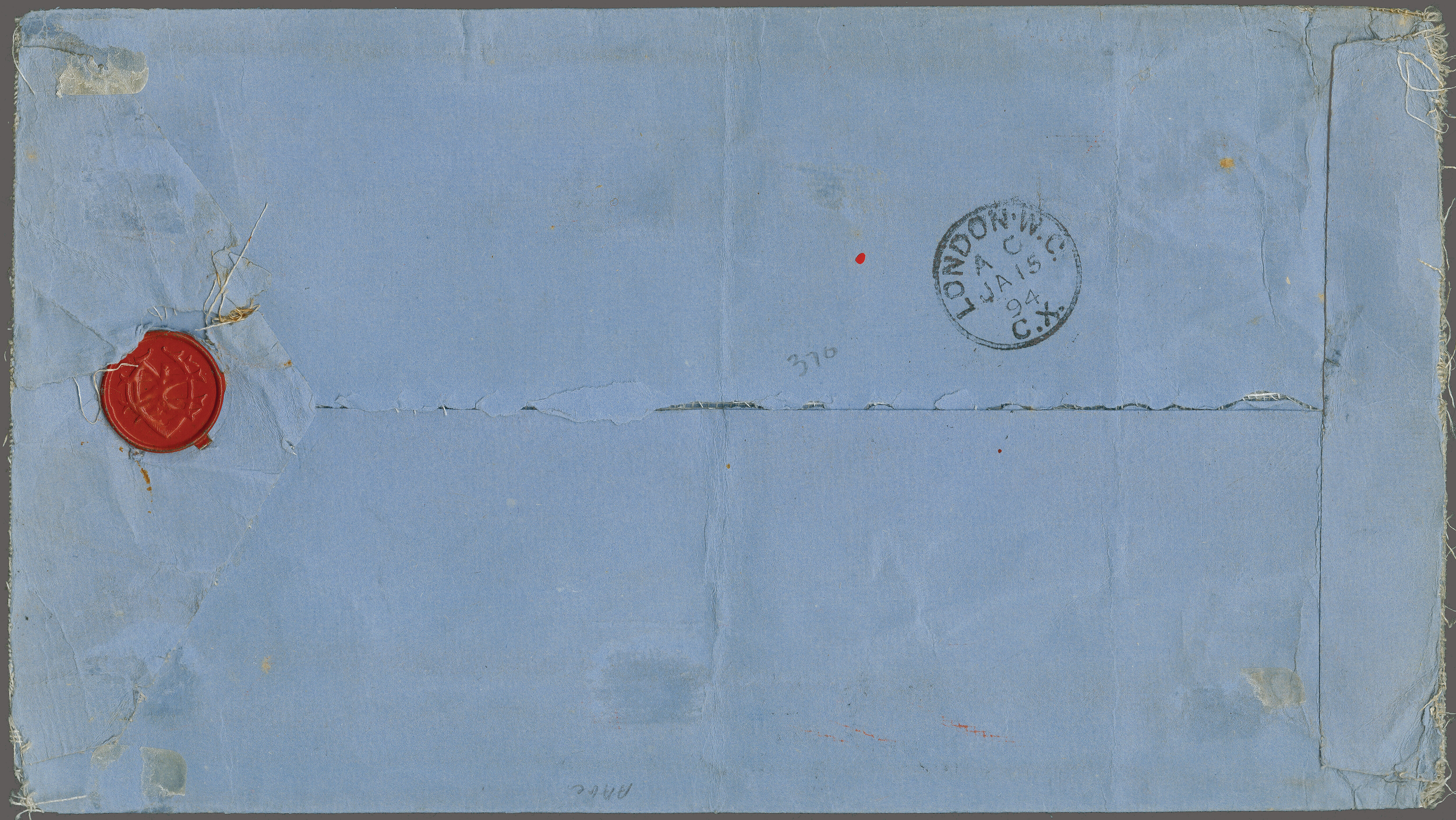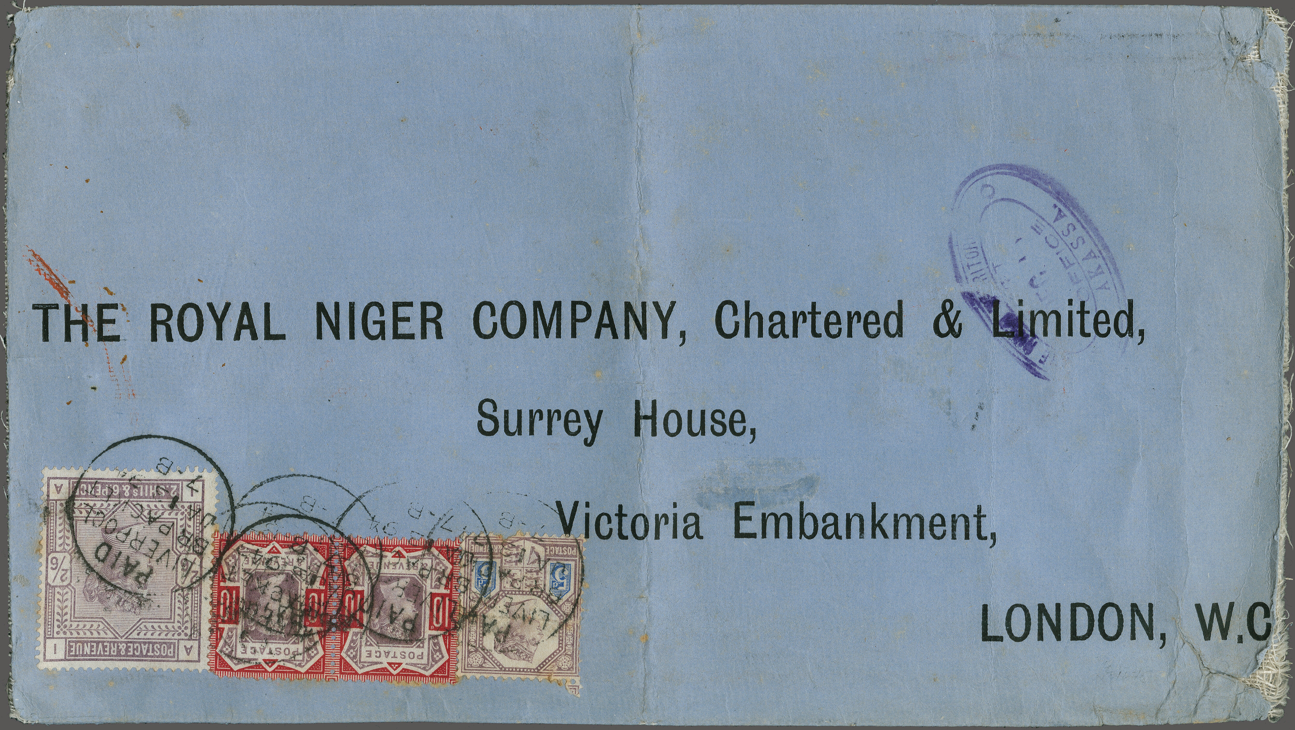 6183 cover image1894 (Dec): Royal Niger Company printed linen-backed envelope to London showing fair strike of AKASSA oval handstamp, bearing 1883/84 2/6d. lilac with Jubilee 5 d. + 10 d. pair all placed upside down, cancelled "PAID LIVERPOOL BR. PACKET" cds, LONDON arrival backstamp (Jan 15). 5 d. with small fault, envelope reduced at left. Rare high value franking for an 11oz letter. Provenance: Corinphila sale 309-320, November-December 2023, lot 1199. (Image 1) (Image 2)