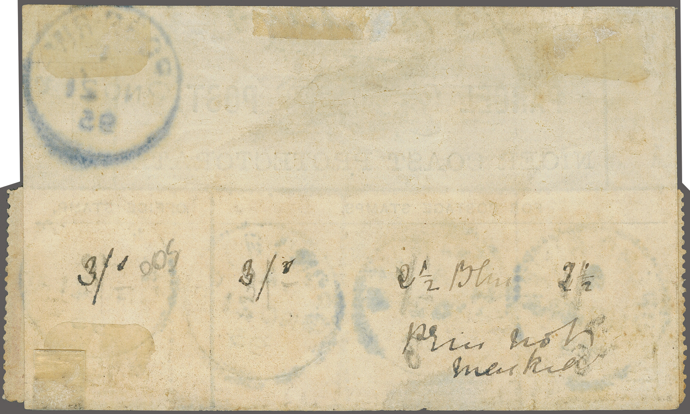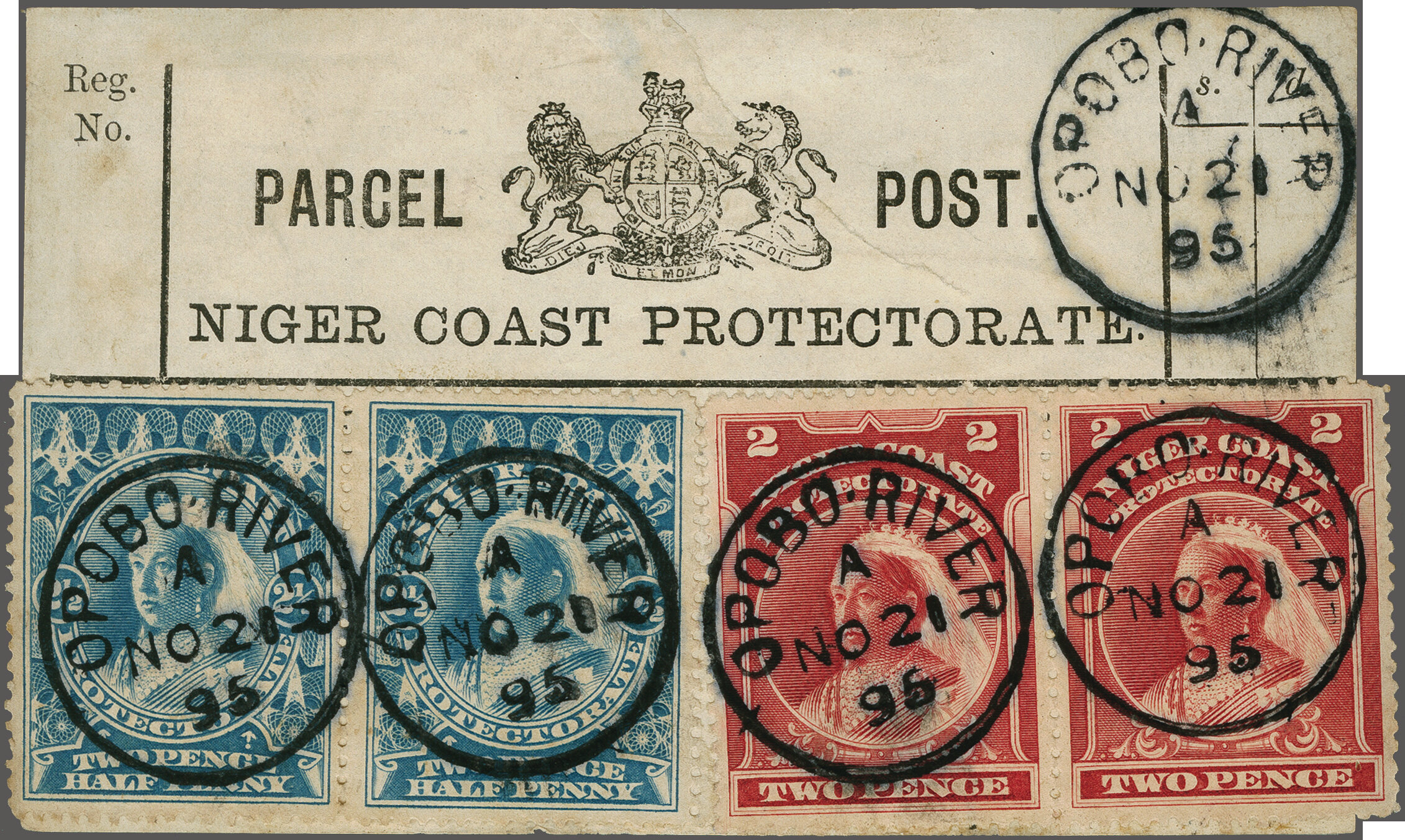 6184 piece imageNiger Coast, 1895 (Nov 21): Parcel Post label, bearing 1894 2 d. lake and 2½ d. blue pairs, each adhesive cancelled with superb "OPOBO RIVER" code A cds, with a further strike above. Very scarce, attractive item. (Image 1) (Image 2)