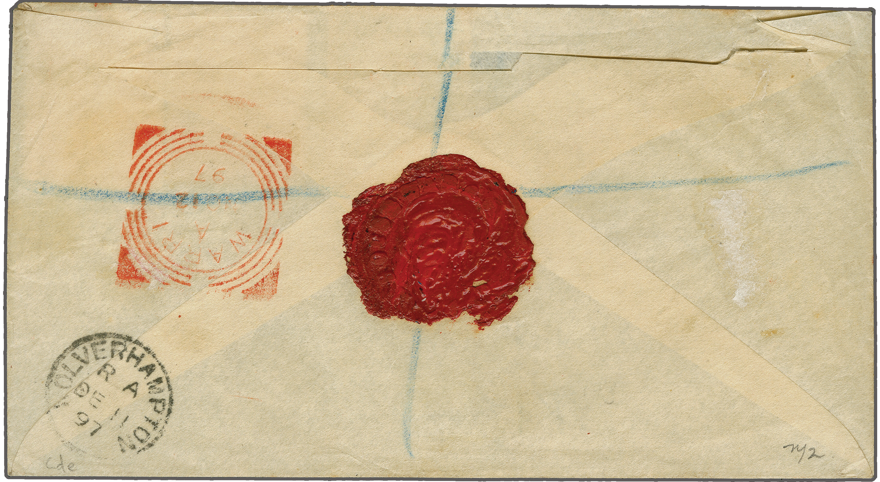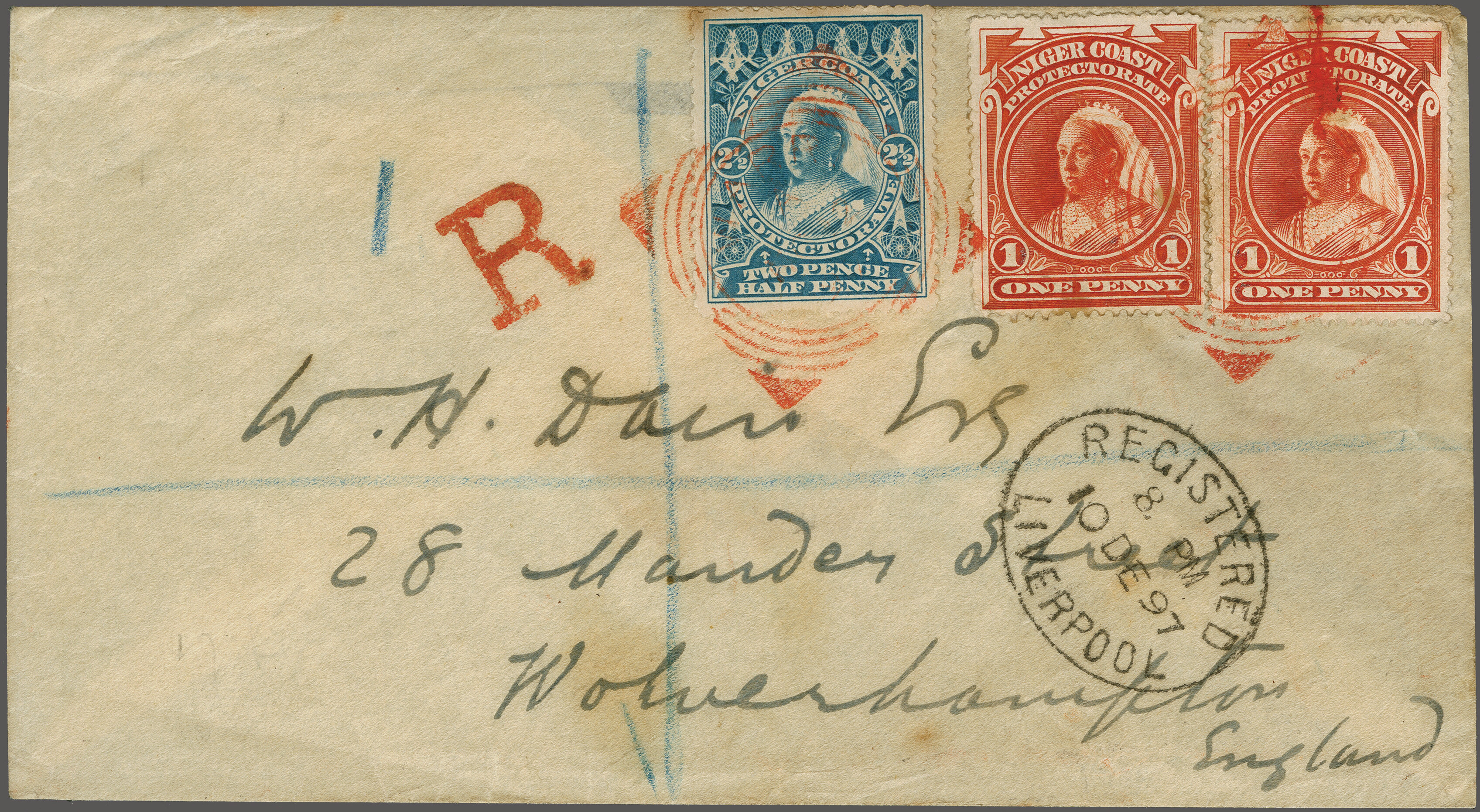 6185 cover image1897 (Nov.12): Registered cover to Wolverhampton franked 1894 1 d. (2) + 2½ d. tied by red squared circle WARRI datestamp, "R" handstamp to left in red, oval "REGISTERED LIVERPOOL" (Dec 10) transit datestamp below, reverse with fine WARRI despatch in red & arrival (Dec 11). Wax seal on reverse is from Customs House Warri. A fine and scarce usage. Provenance: Corinphila sale 309-320, November-December 2023, lot 1202. (Image 1) (Image 2)