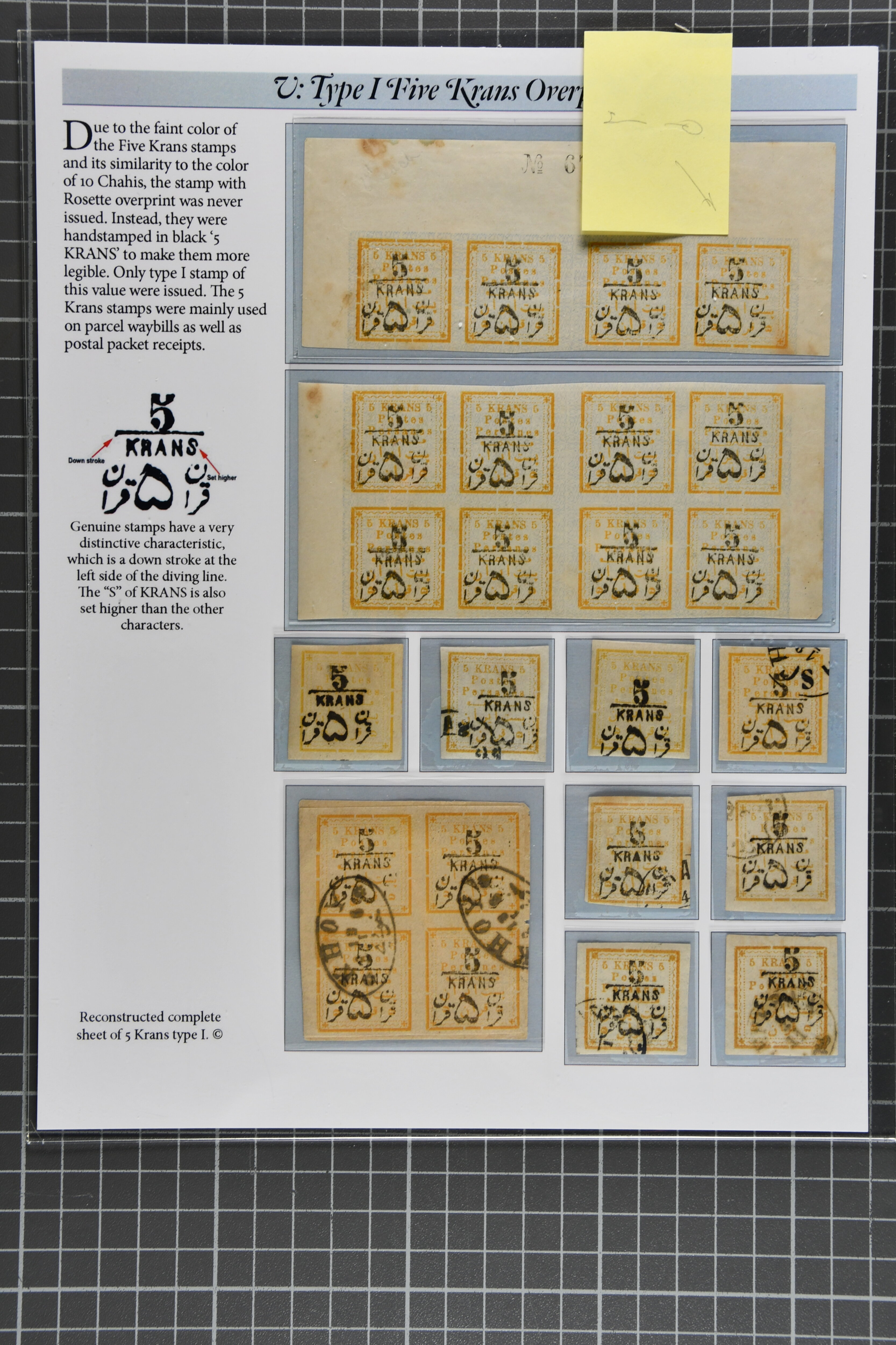 535 */bof image1902 (Feb): '5 KRANS' surcharge in black on the Type I unissued 5 kr. yellow-ochre & blue, the sheet reconstruction of twenty-four subjects in two panes of twelve (2 x 6), made up with an unused horizontal top marginal strip of four with sheet requisition number 'No. 67011' at top (positions 1-2-1-2), a remarkable and rare cross-pane block of eight unused (positions 5-6-5-6 / 7-8-7-8) both the unused blocks with slight ageing, a used block of four (positions 9-10 / 11-12) cancelled at KHOY, two single unused examples and 6 used examples. A splendid philatelic achievement with the reconstruction on stamps which are very much rarer than all catalogue prices suggest. Most signed Sadri Scott = $ 3'550+. (Image 1)