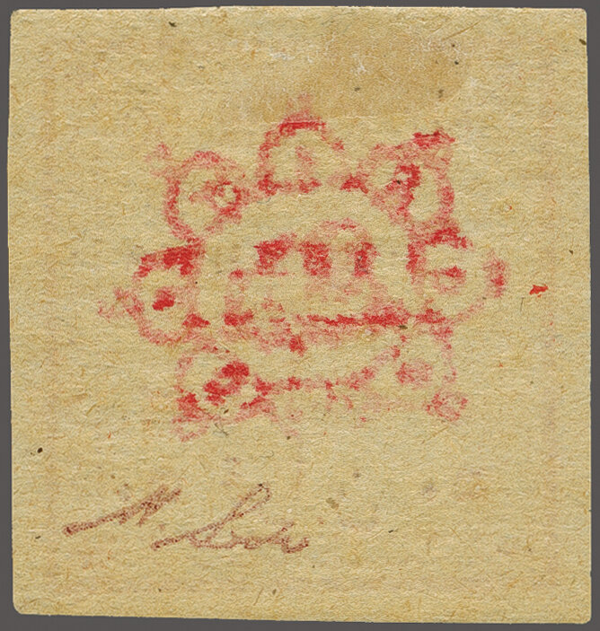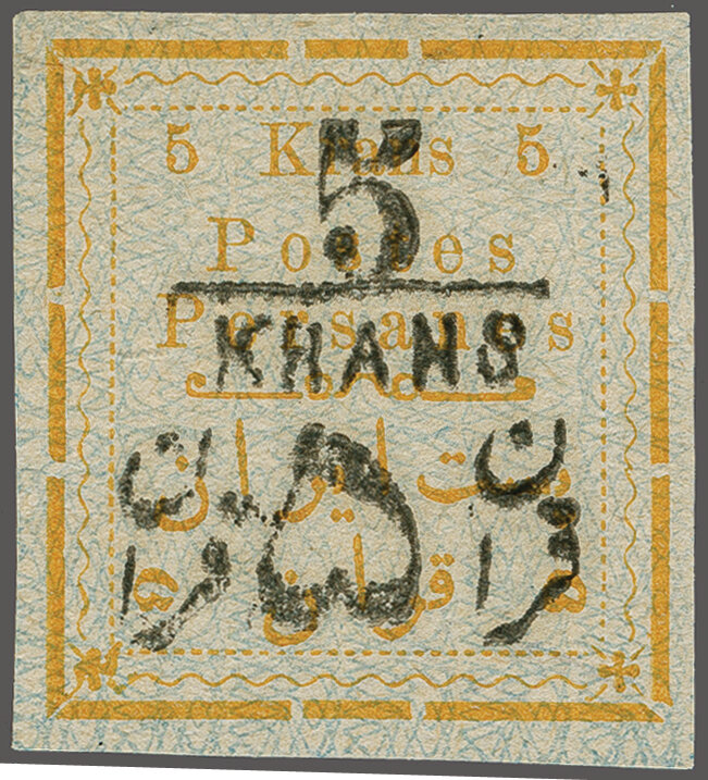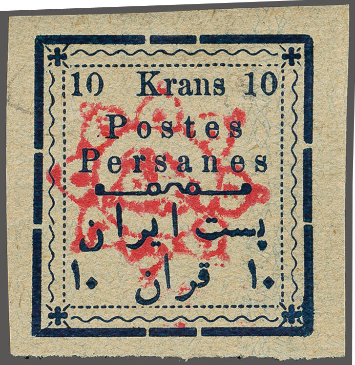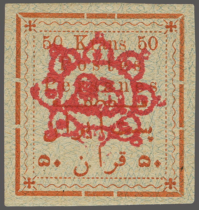 534 * image1902 (Sept): Typeset 50 krans orange-red & blue, with red control handstamp, imperforate, Type II (small Krans), an unused example (position 10) with good margins all round, of fine fresh colour, large part og. An extremely rare stamp and under-catalogued, just 1'000 stamps were prepared. No postal document is recorded with this high value (50 krans = 1'000 Chahis) but they are known in used condition on Money Order forms. Signed Sadri Scott = $ 1'250. (Image 1) (Image 2)