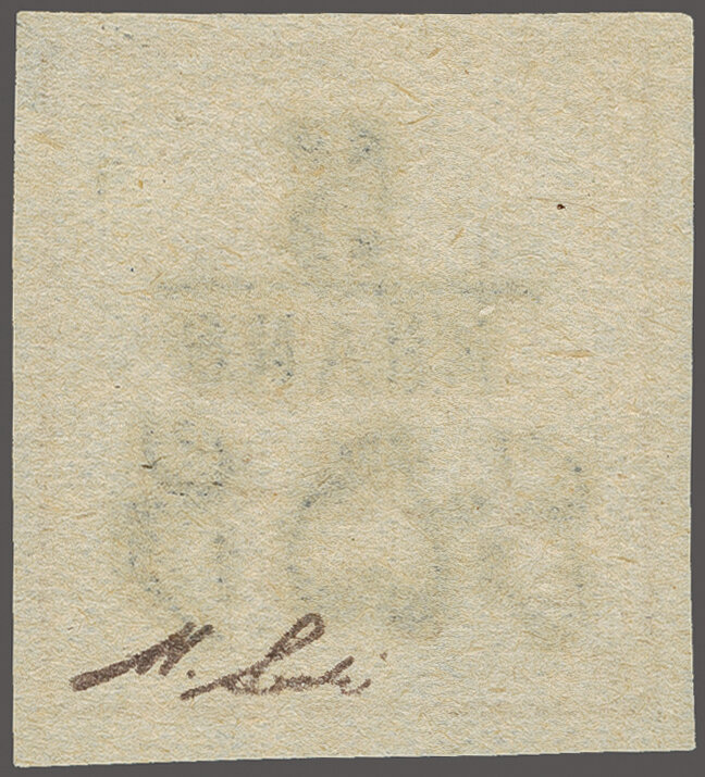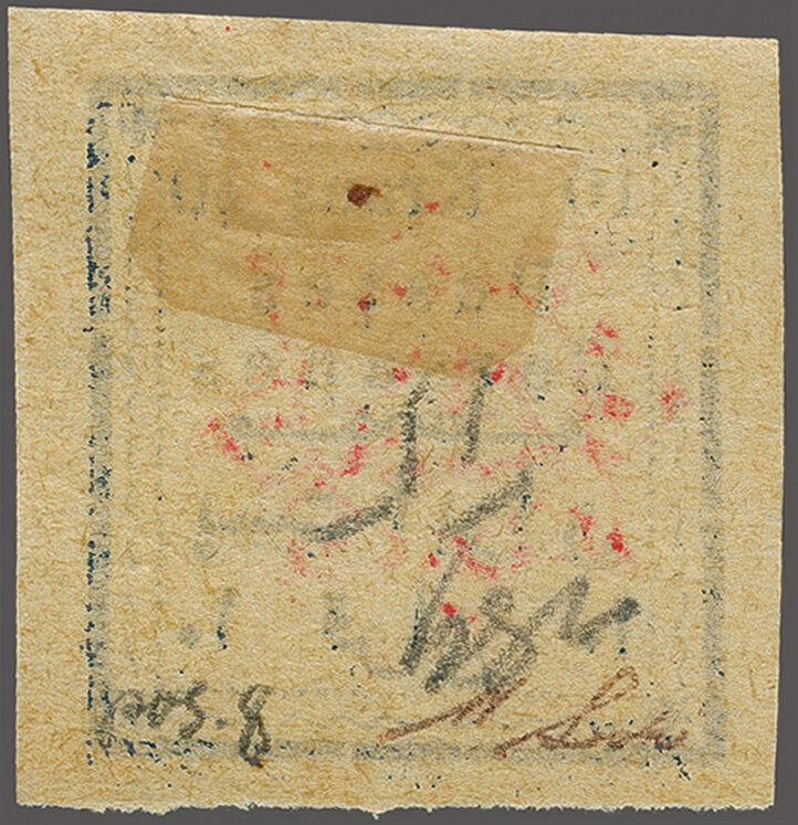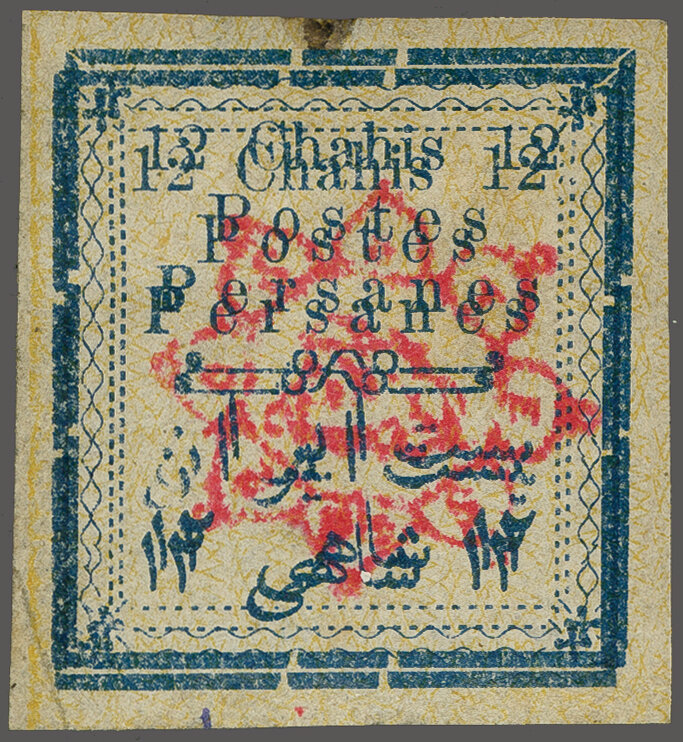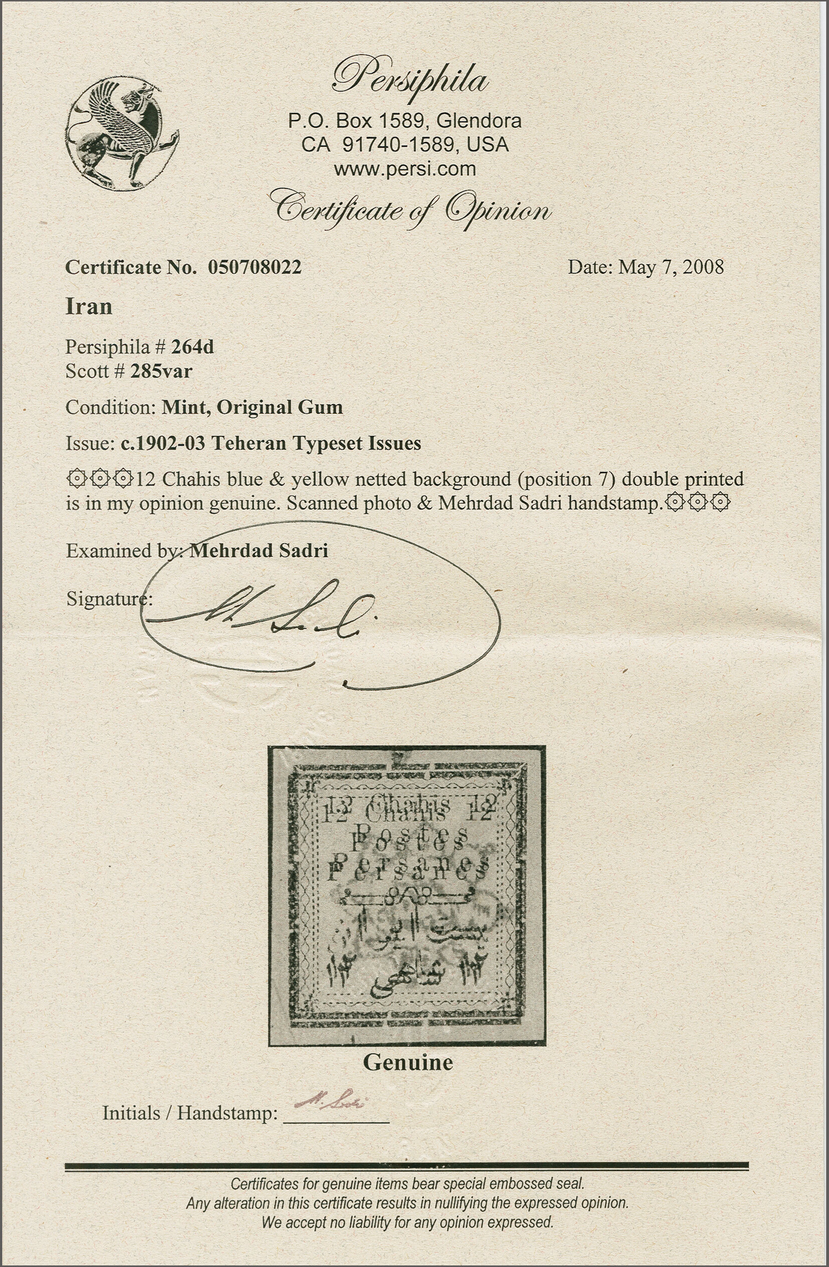 531 * image1902 (Sept): Typeset 12 ch. blue & yellow with red control handstamp, imperforate, the rare Type II (small Chahis), an unused example (position 7), with large margins all round, variety "Double Print", of fine appearance, slight corner crease and mark at top mainly in margin, part og. Rare. Cert. Sadri (2008) Gi 232a = unpriced / Scott = $ 150 for normal. (Image 1) (Image 2) (Image 3)